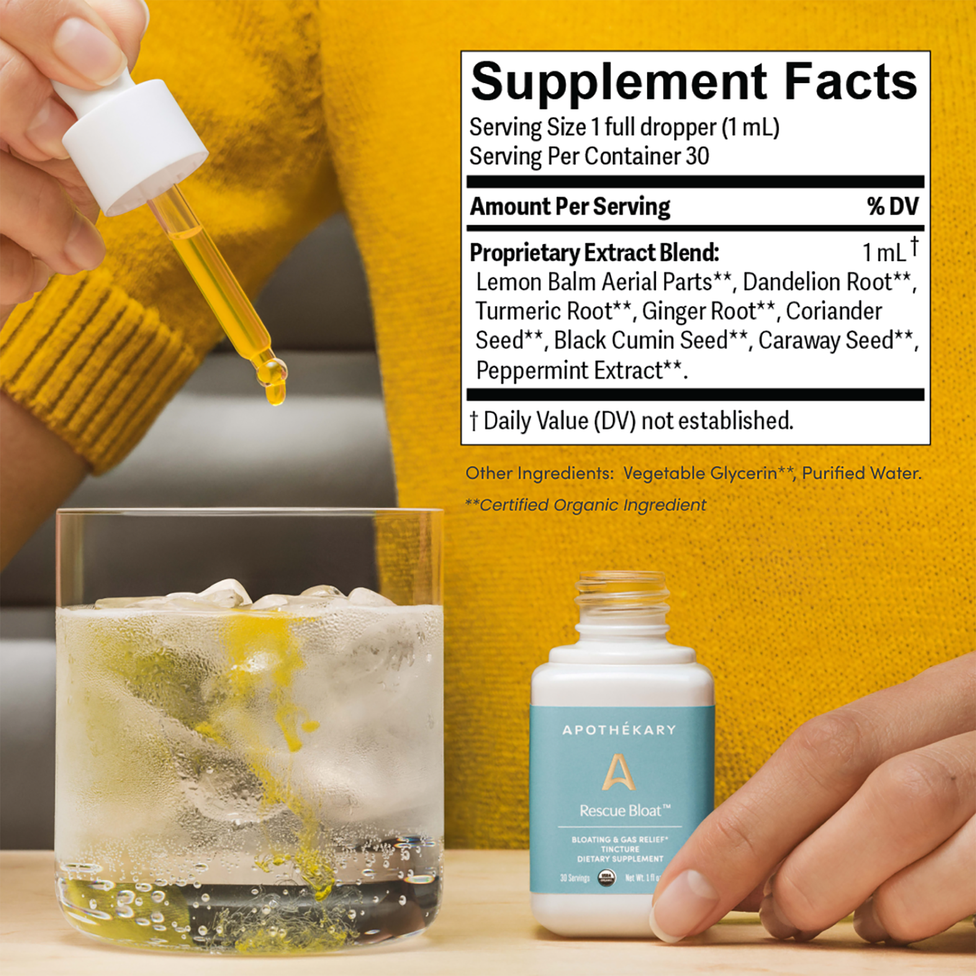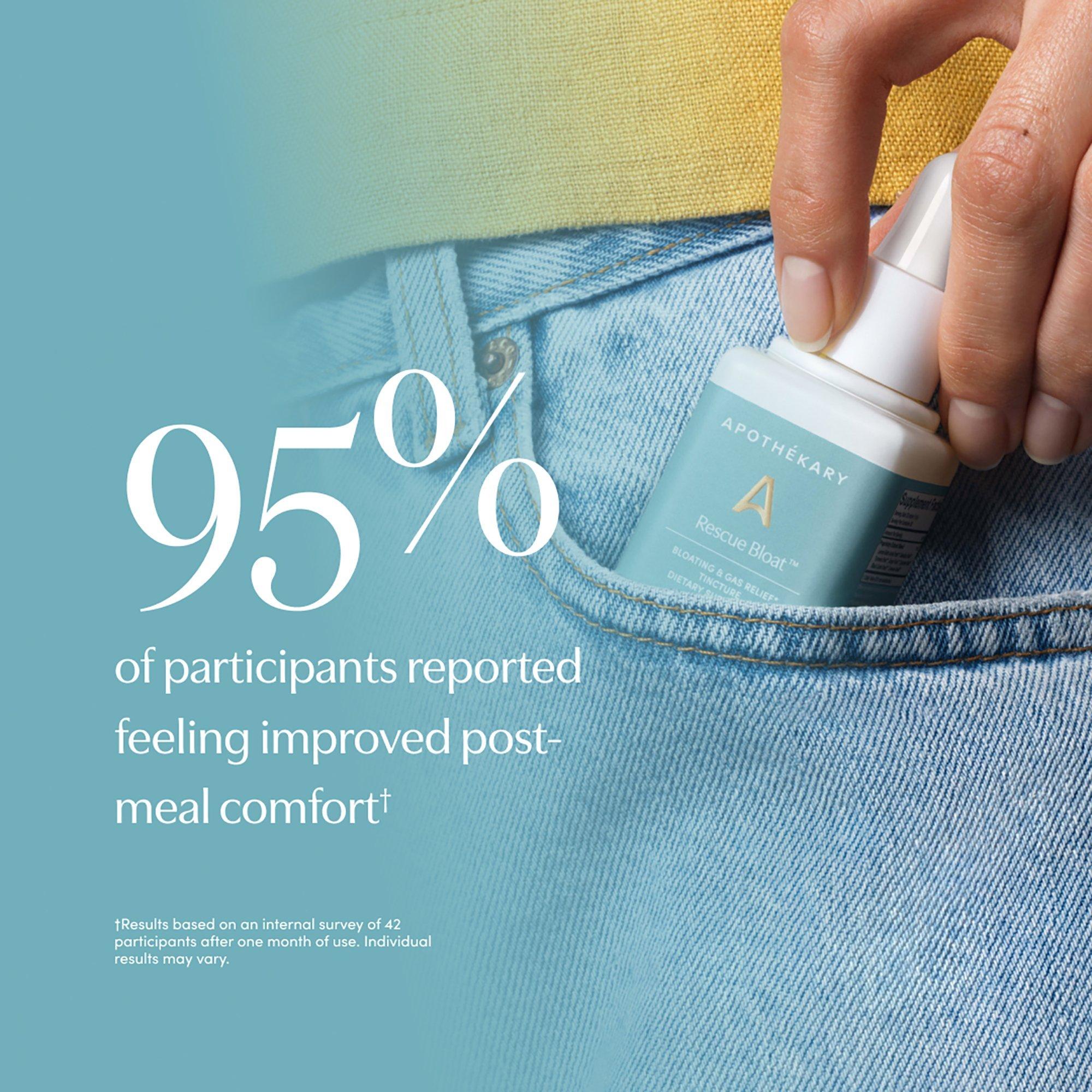Rescue Bloat Rescue Bloat Bloating & Gas Relief Ticture by Apothékary is a tincture for easing occasional bloating and gas—especially when you need relief most. Rescue BloatTM is a potent post-meal aid that can help ease occasional discomfort associated with bloating and support digestive health.*