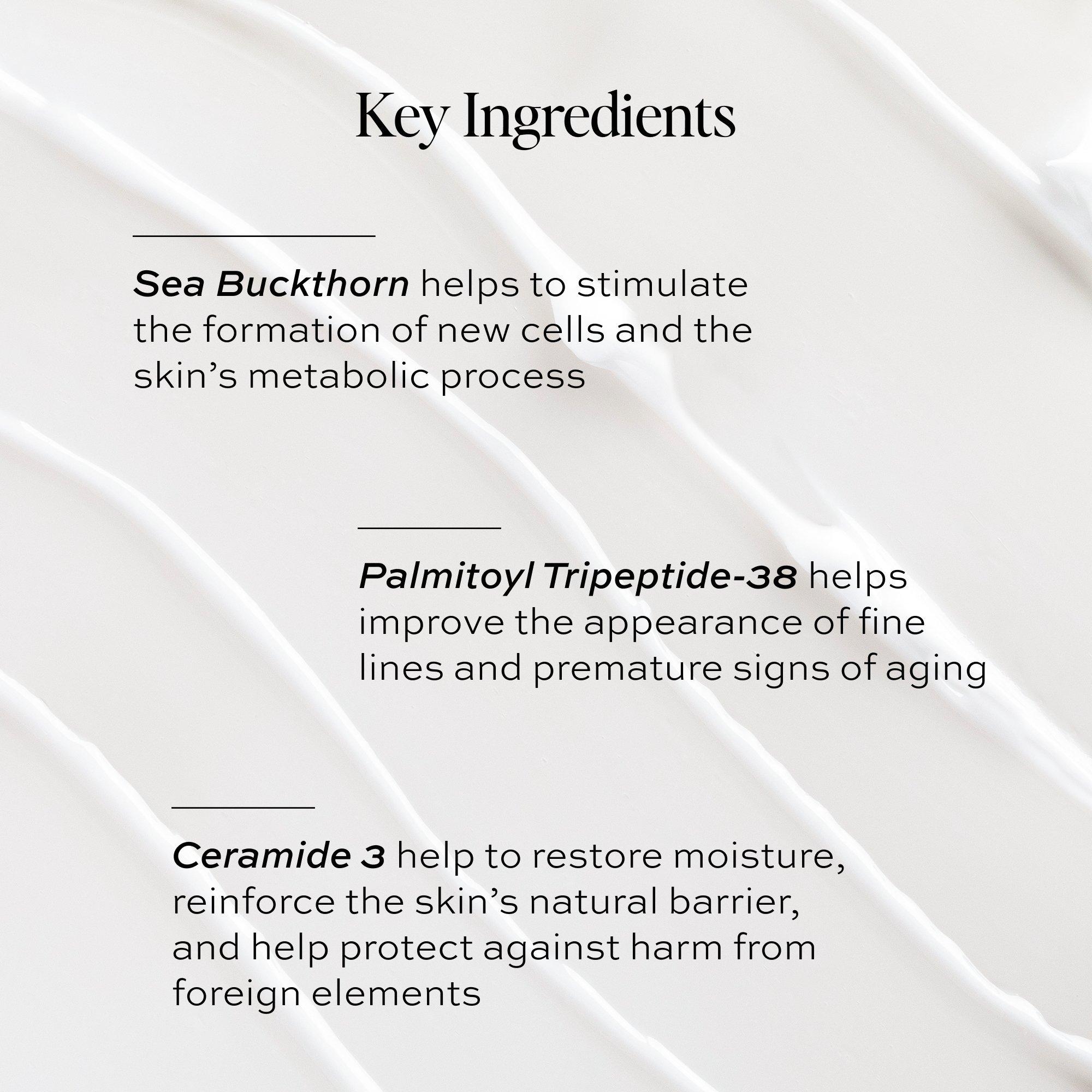 Water, Glycerin, Cetearyl Alcohol, Ethylhexyl Olivate, Isononyl Isononanoate, Glyceryl Stearate, Pentylene Glycol, 1,2 Hexanediol, Behenyl Alcohol, Simmondsia Chinensis (Jojoba) Seed Oil, Squalane, Sodium Stearoyl Lactylate, Hydroxyacetophenone, Caprylic/Capric Triglyceride, Butyrospermum Parkii (Shea) Butter, Carbomer, Xanthan Gum, Camellia Oleifera Seed Oil, Olea Europaea (Olive) Fruit Unsaponifiables, Stearyl Glycyrrhetinate, Tetrasodium Glutamate Diacetate, Linoleic Acid, Phospholipids, Phytosterols, Ceramide NP, Hydroxypropyl Cyclodextrin, Sodium Hyaluronate, Glycolipids, Soybean Phytosterols, Aloe Barbadensis Leaf Juice, Hippophae Rhamnoides Fruit Oil, Palmitoyl Tripeptide-38.