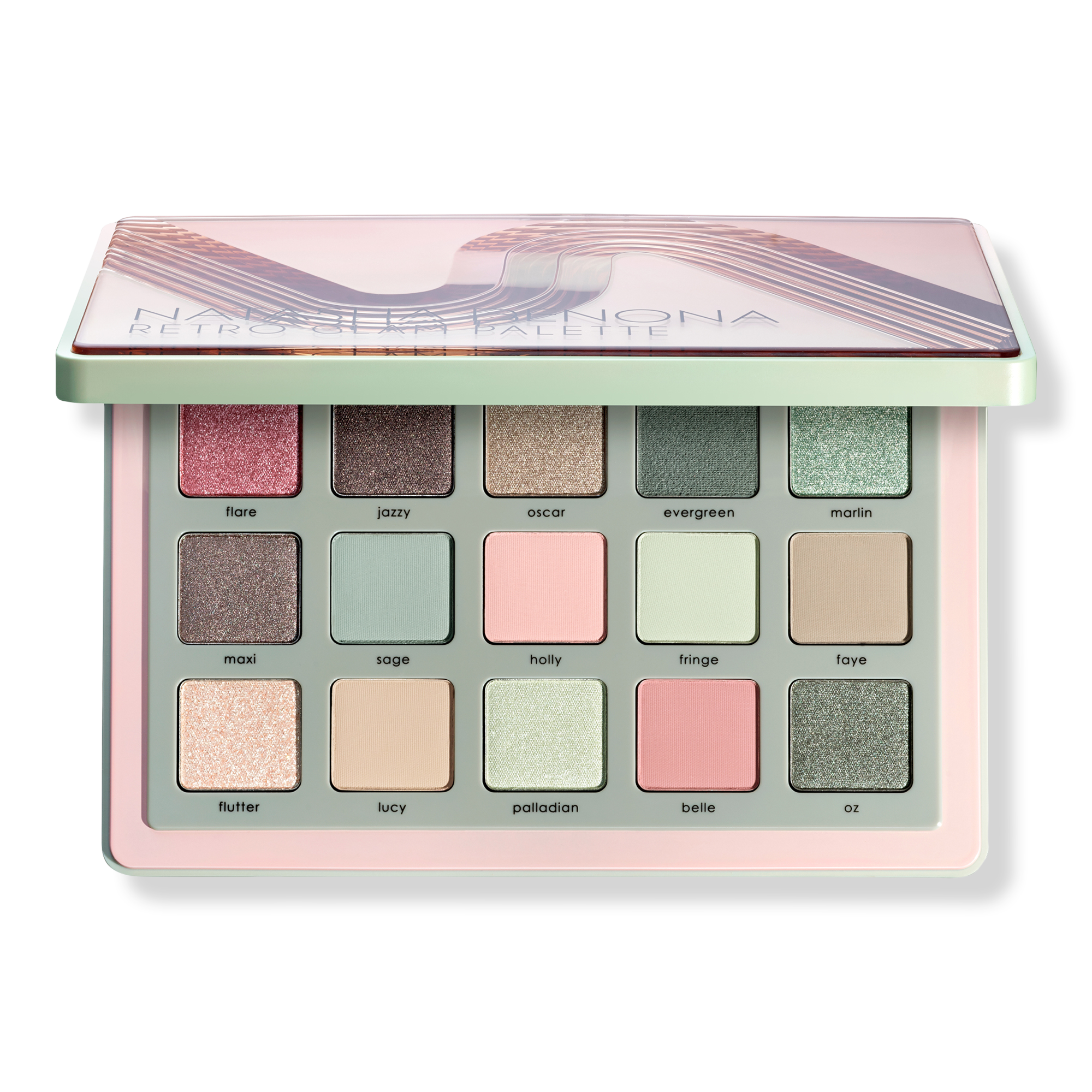 • Ranging from muted sage greens and cool browns to shimmering dusty pinks and sparkling champagne nudes, the RETRO GLAM EYESHADOW PALETTE suits every occasion.