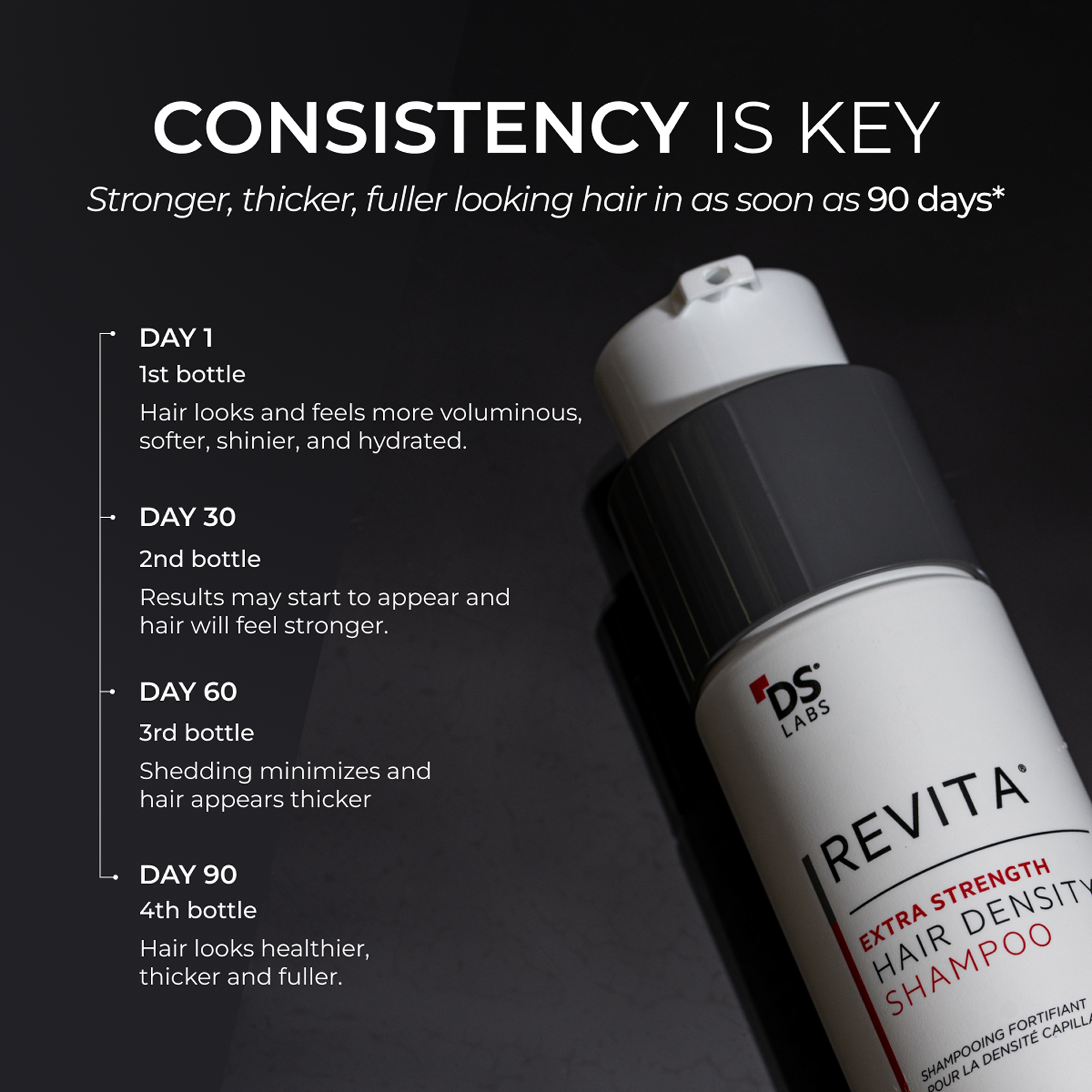 Revita® Extra Strength Shampoo with Nanoxidil® and 24+ active ingredients helps redensify, strengthen, and revitalize hair from within for visibly fuller, stronger, and healthier-looking strands.