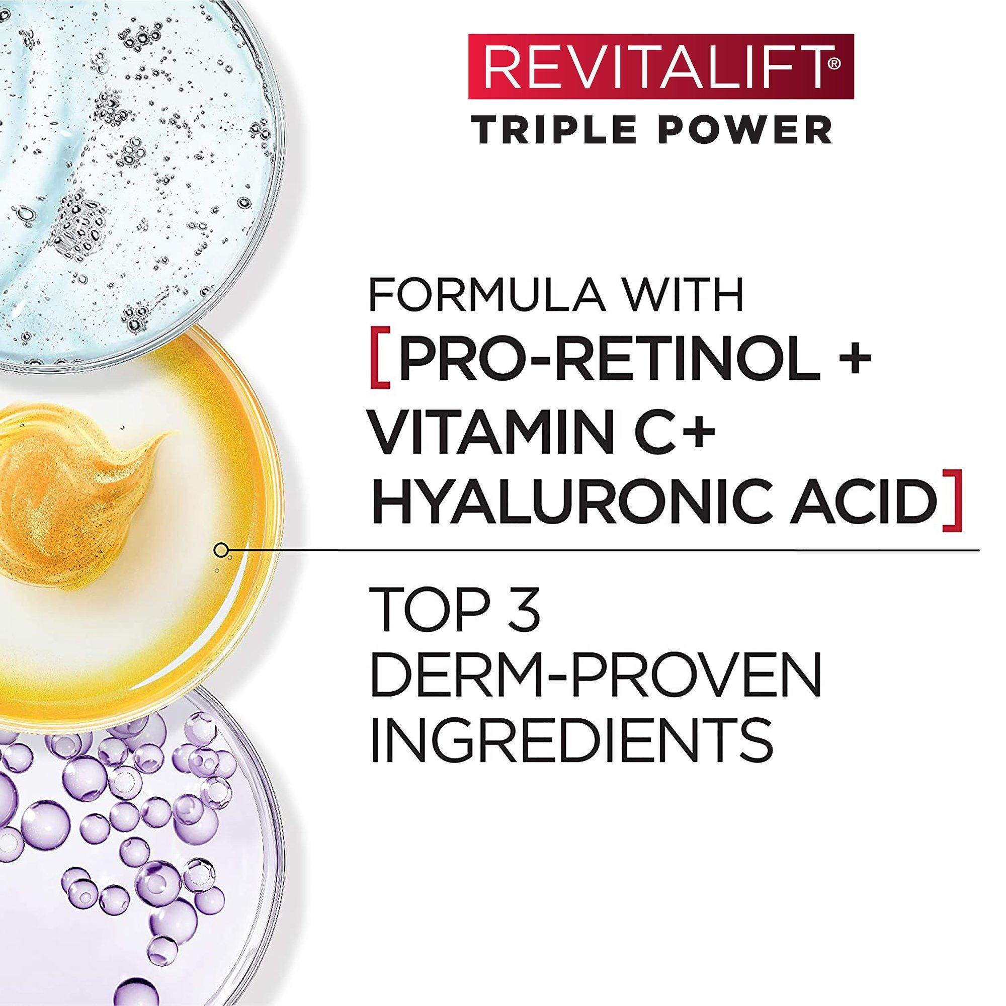 After cleansing, apply 2-3 drops of Vitamin C Serum to the face and neck, avoiding the eye area. Follow with 2-3 drops of hyaluronic acid before any other moisturizers. For the best results, complete your routine with Revitalift Triple Power Moisturizer after serums.