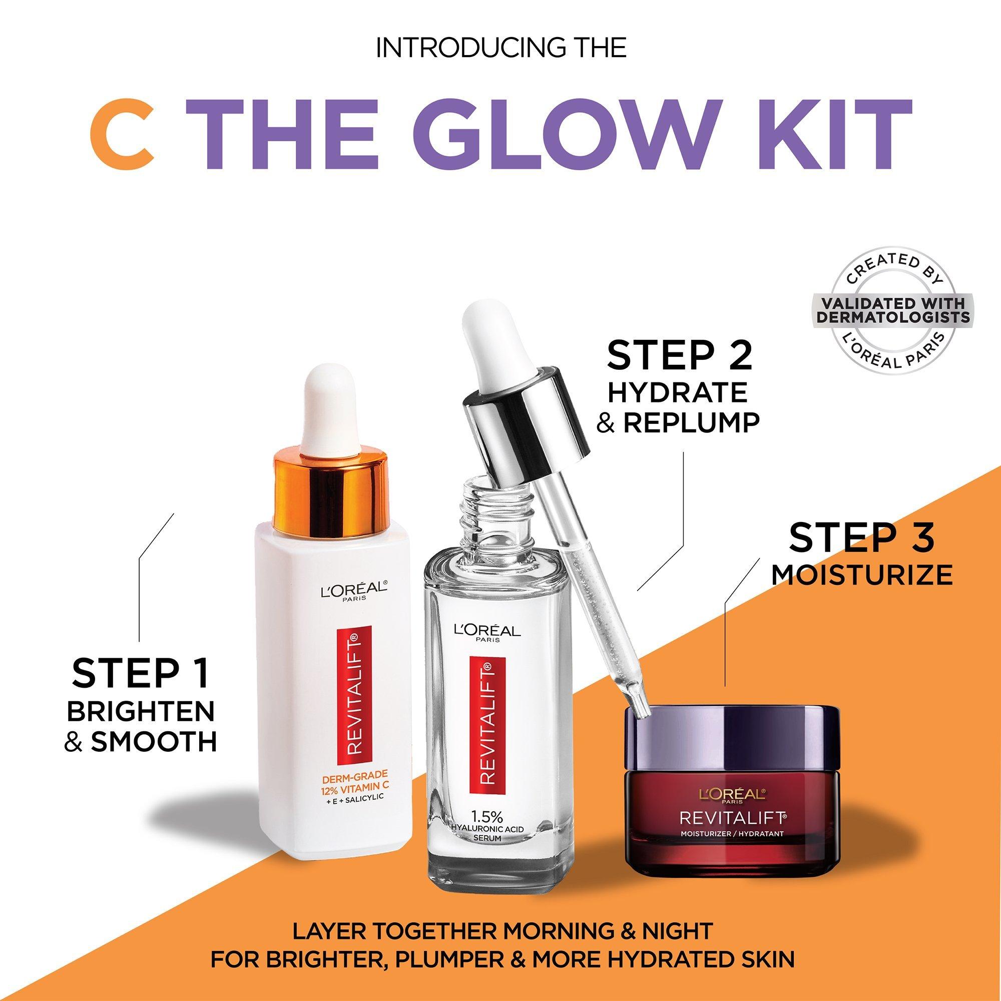 L'Oreal Paris Revitalift C The Glow Kit 12% Vitamin C Serum, 1.5% Hyaluronic Acid Serum & Triple Power Moisturizer. Use Vitamin C for brighter radiant skin. Followed by Hyaluronic Acid Serum Skin to hydrate and replump. Finish with Triple Power Moisturizer to reduce wrinkles and firm skin.