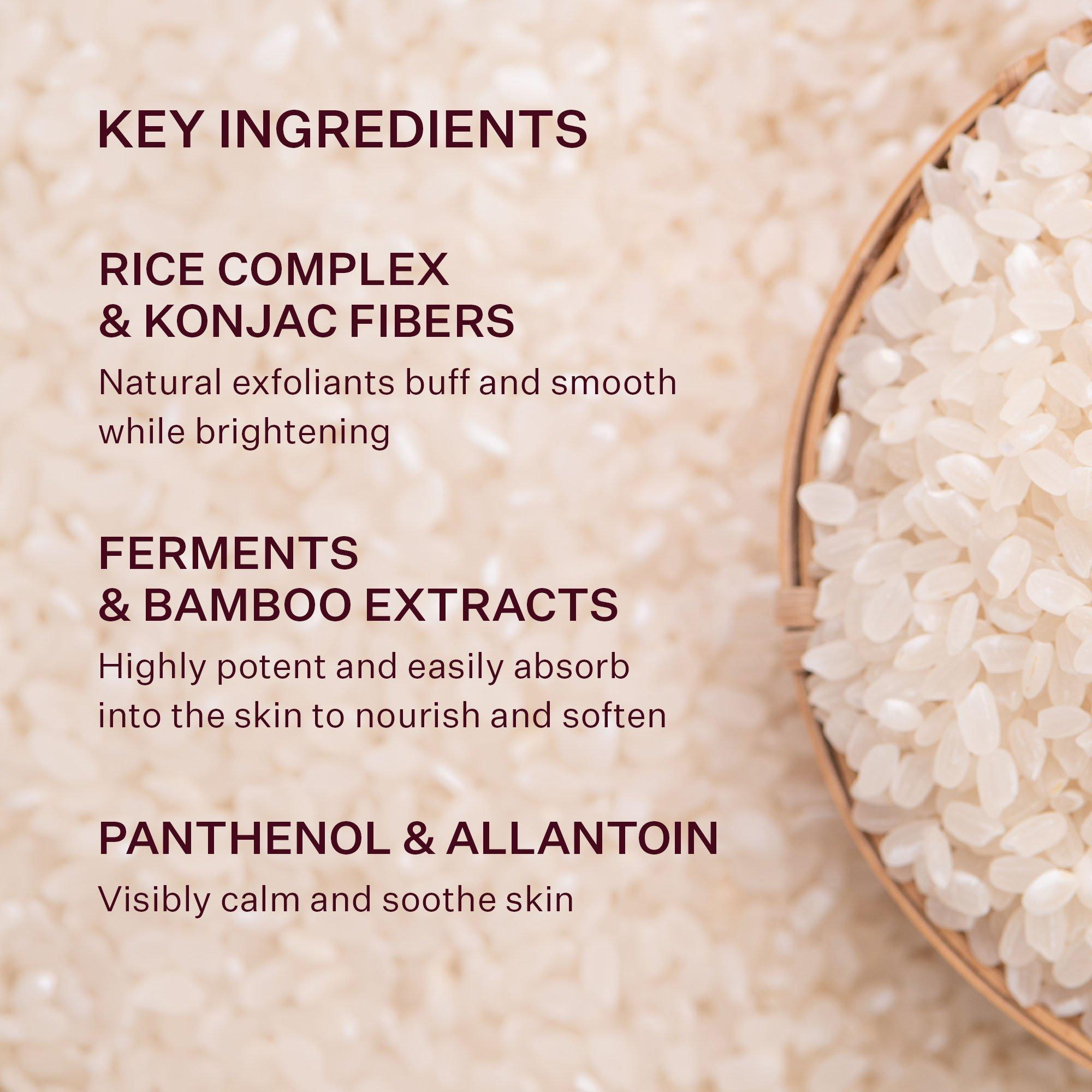 Peach & Lily's one-of-a-kind Rice Dough Smoothing Facial Scrub gently micro-exfoliates as it nourishes. Unique whipped dough texture with rice complex and konjac fibers buff, brighten, and visibly calm signs of irritation. Bamboo and ferments support the skin barrier for baby-soft, glowing skin.
