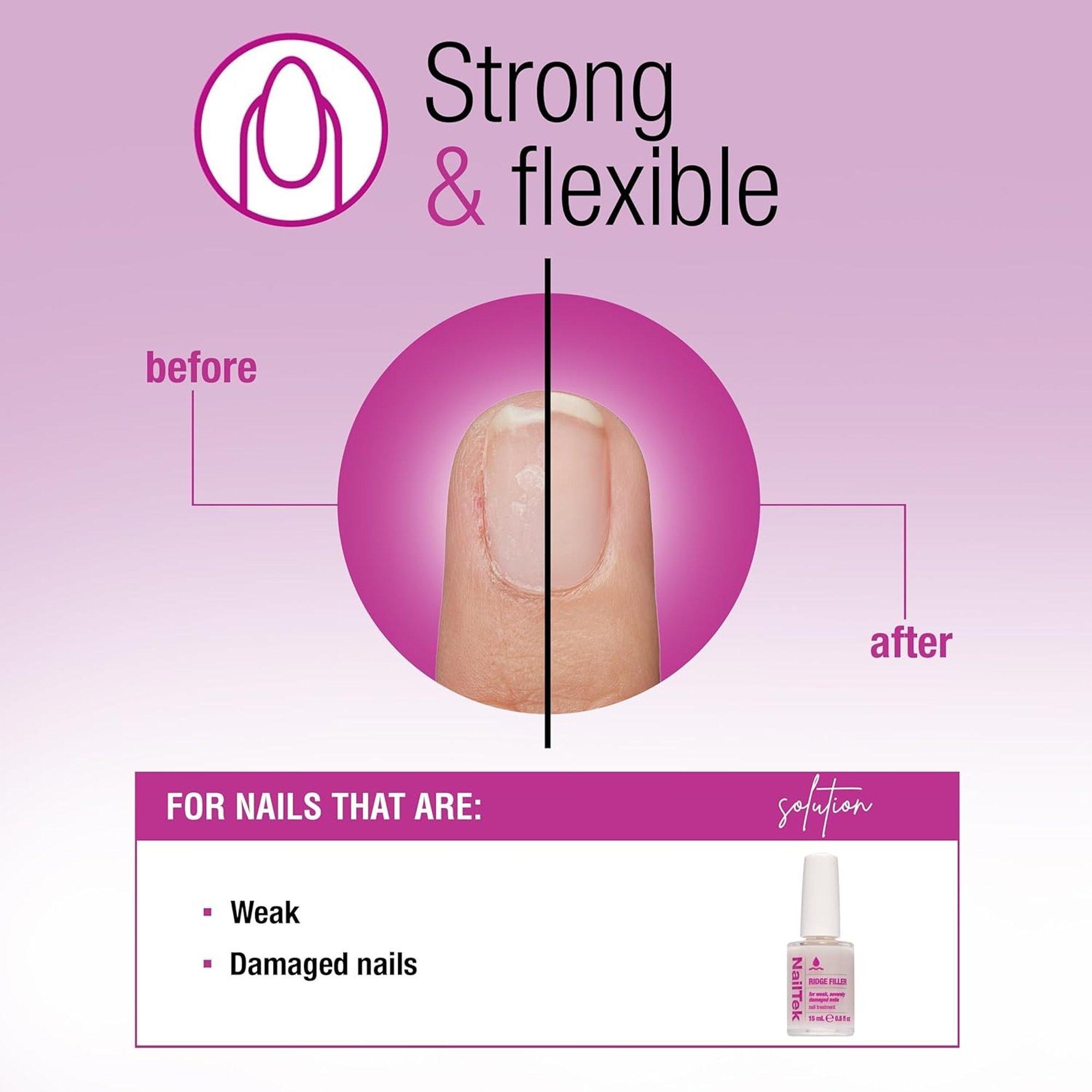 NailTek Ridge Filler Base Coat for Severely Damaged Nails helps smooth and protect nails weakened by artificial nails or gel manicures, making at-home nail care easy.