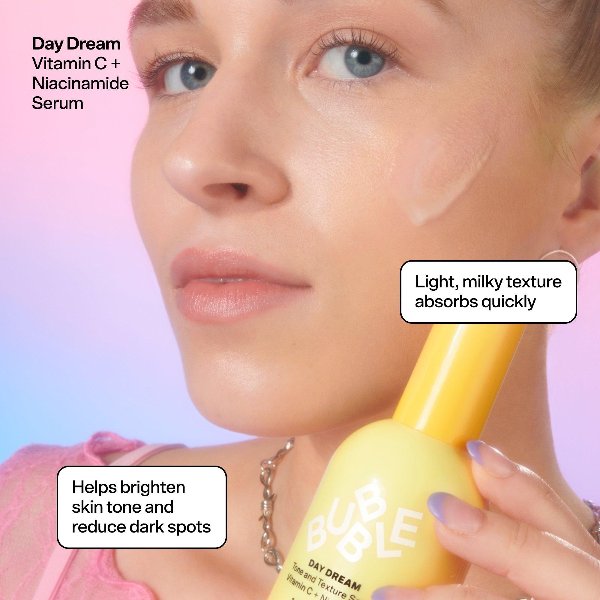 Bubble's Rise & Shine Brightening Set gives you a daily dose of brilliance in a 3-step routine. Best-sellers Fresh Start, Day Dream, and Cloud Surf team up to promote radiant and balanced skin - so you can Face the Day with a glow as bright as YOU.