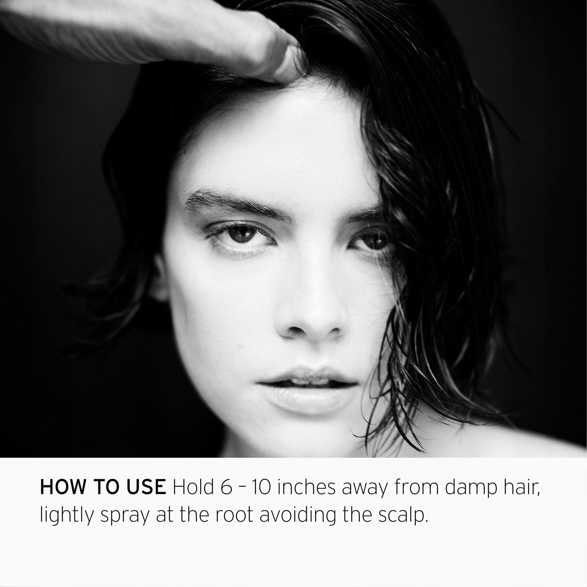 Hold 6-10 inches away from damp hair, spray once on each side of head, focusing on the root area.