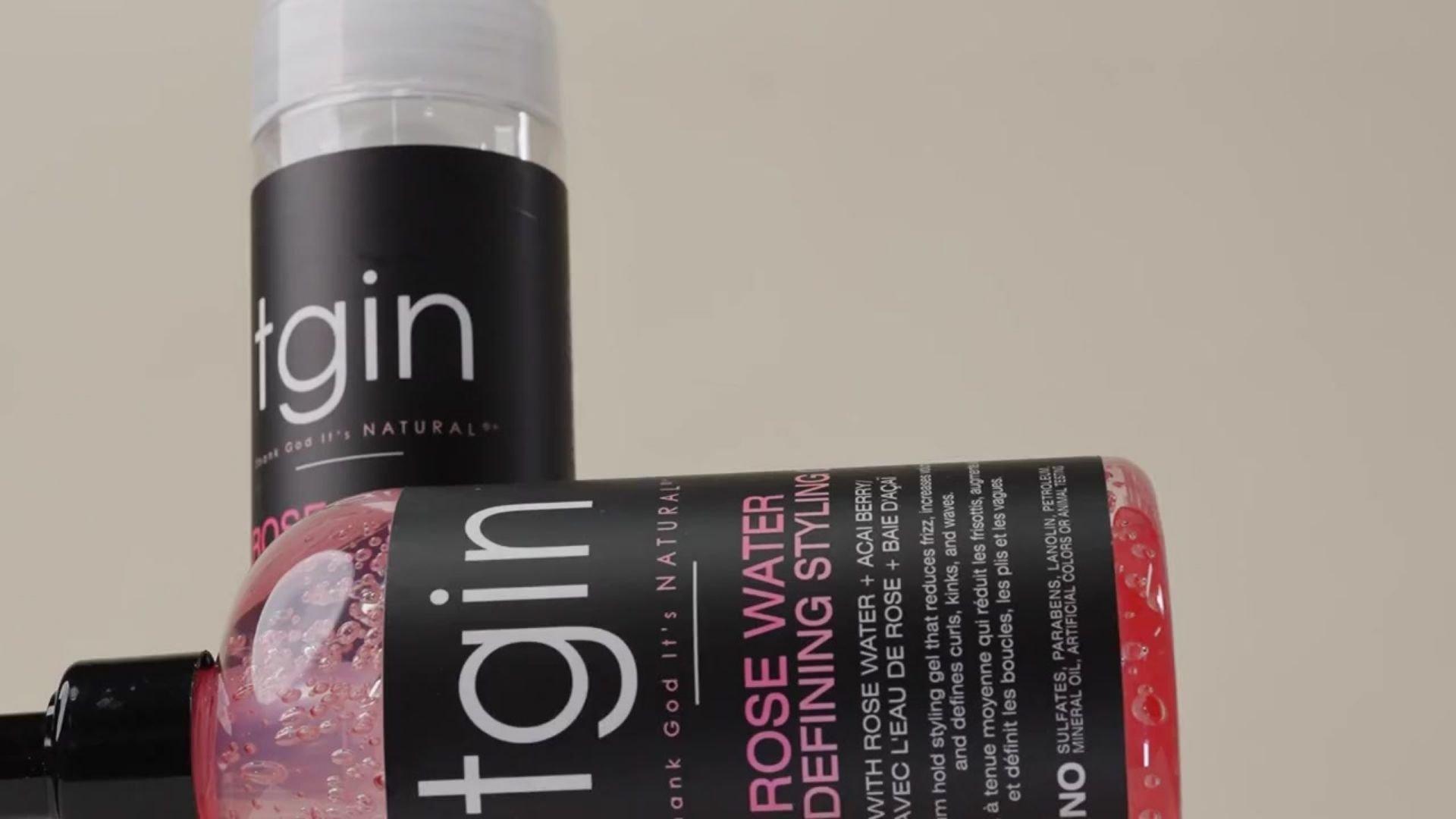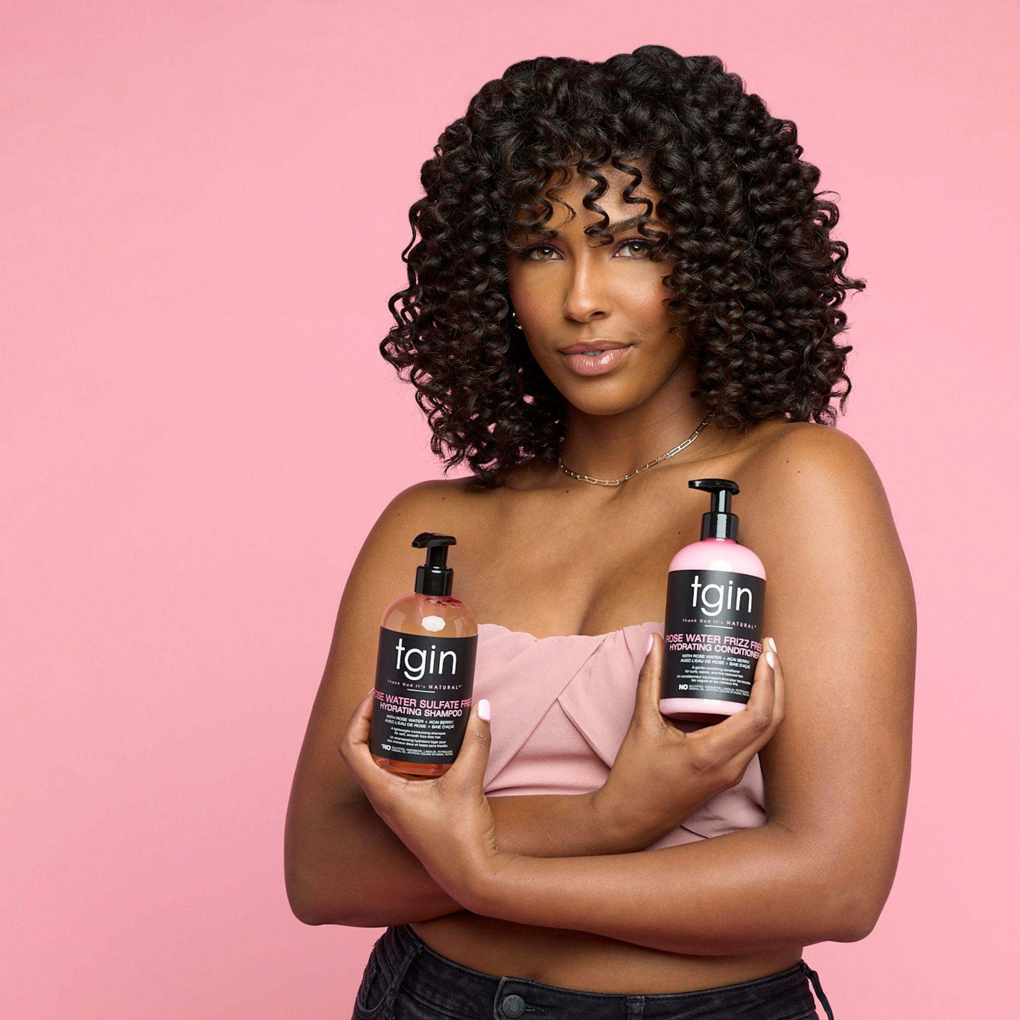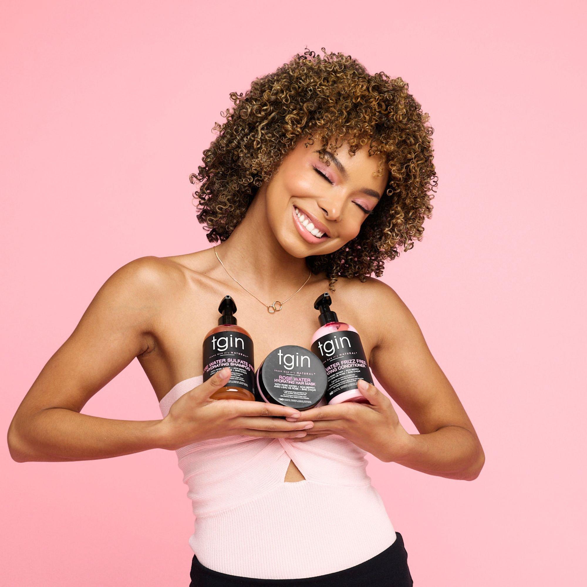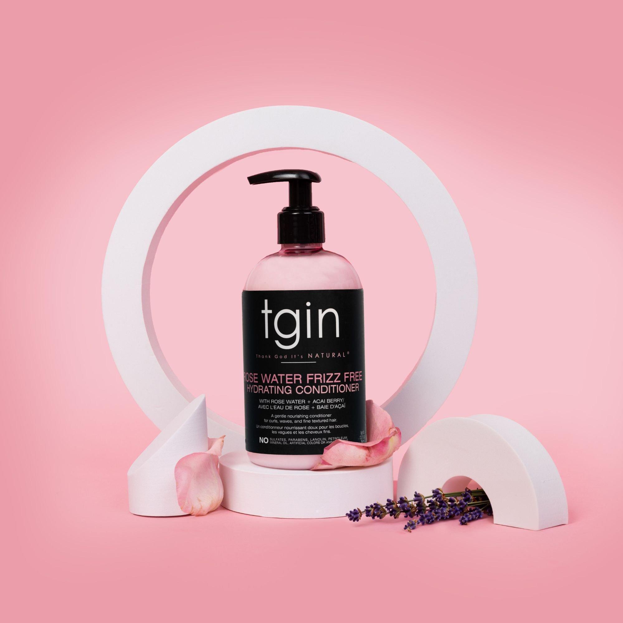 tgin's Rose Water Frizz-Free Hydrating Conditioner is a lightweight, moisturizing formula that helps detangle hair and add shine. Free from parabens, sulfates, petrolatum, lanolin, artificial colors, and animal testing.