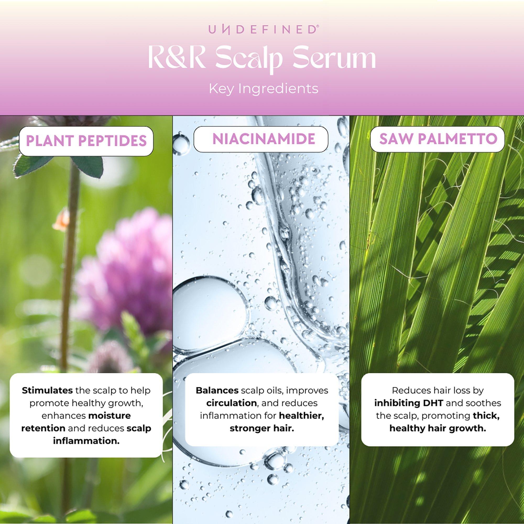 Healthy, shiny, thick hair starts with a healthy, balanced scalp. Undefined Beauty R&R Scalp Serum's innovative water-based hydrates, stimulates and strengthens your scalp via Plant Peptides, Niacinamide, Saw Palmetto, Ashwagandha, Amla, FoTi and Caffeine for revitalized hair wellness.