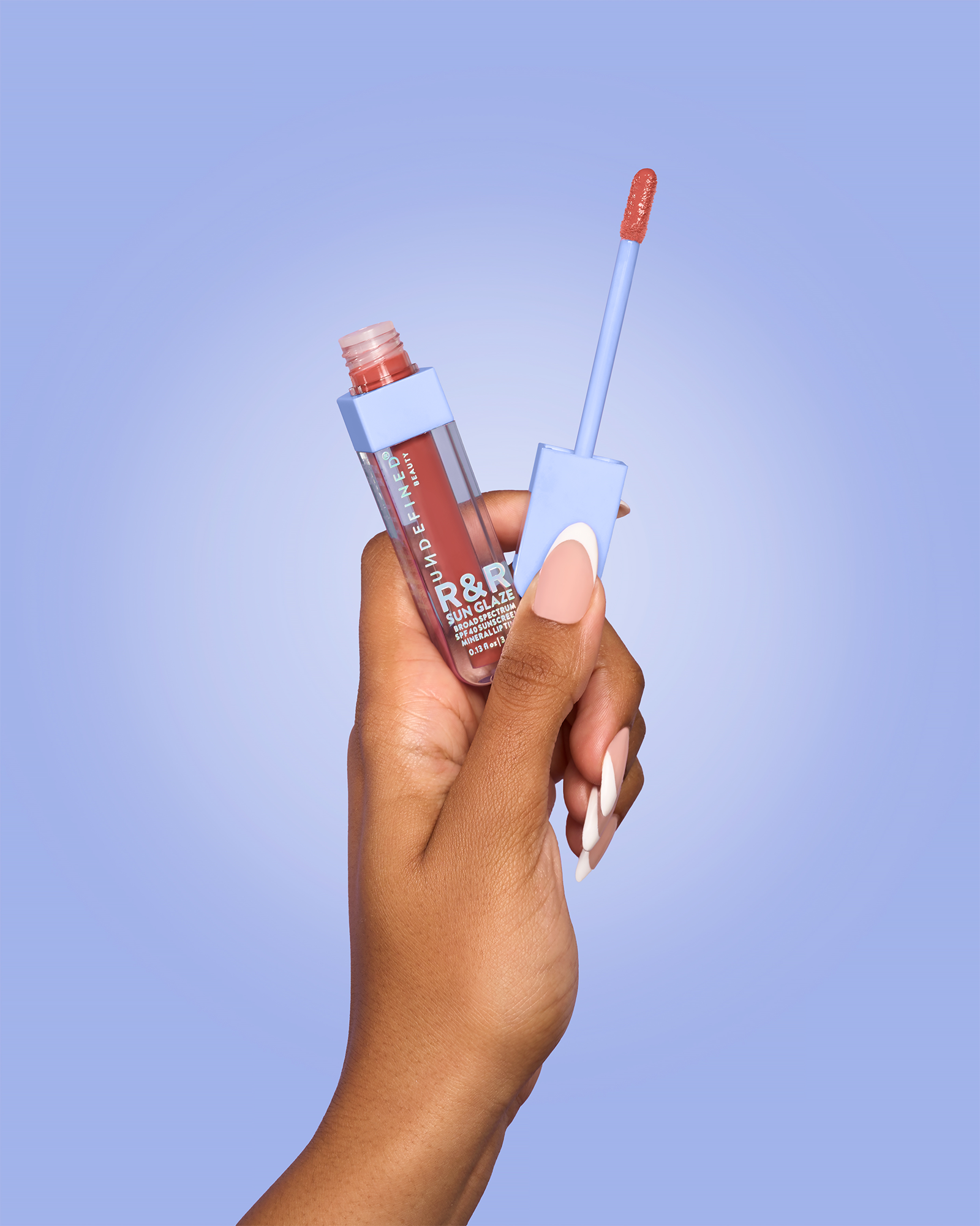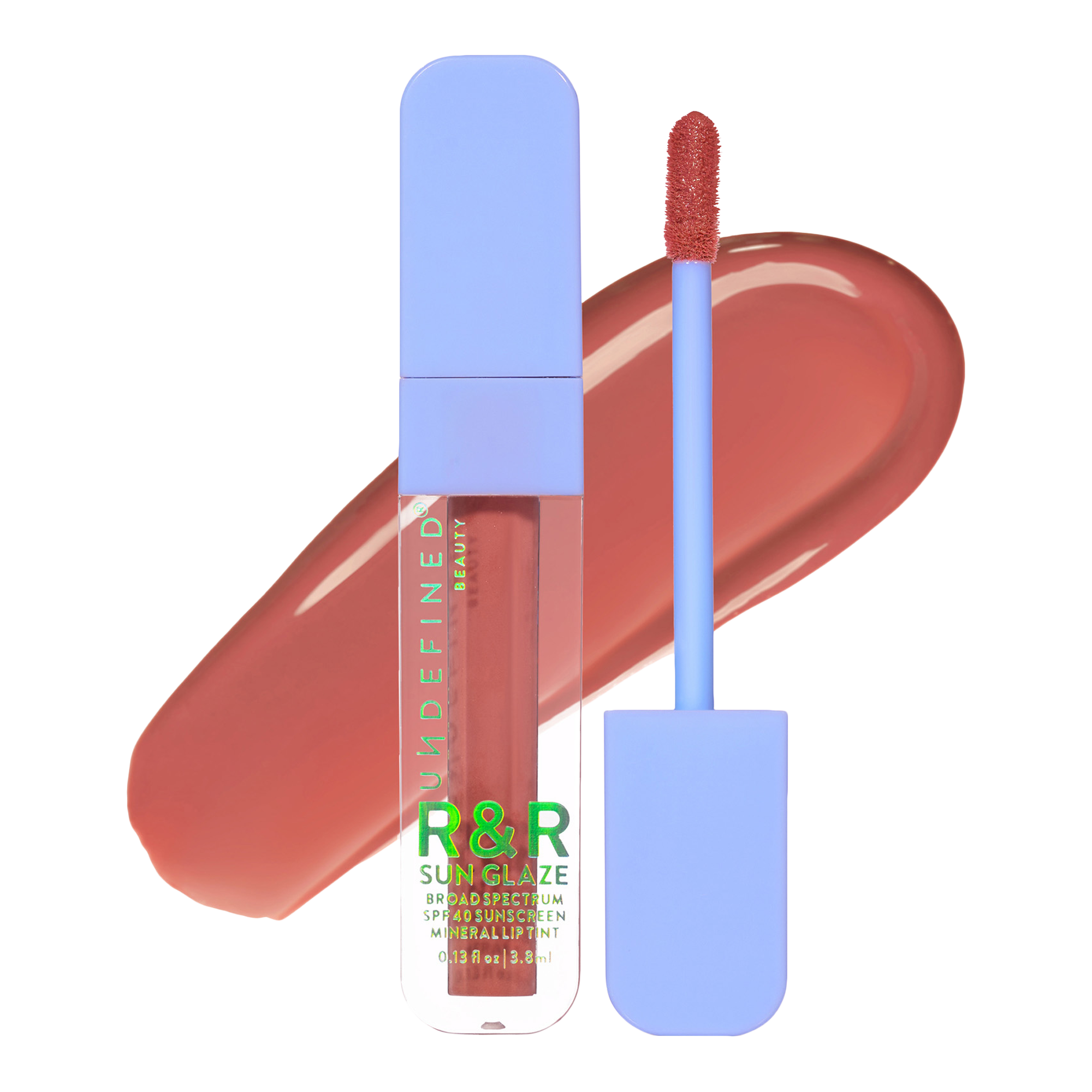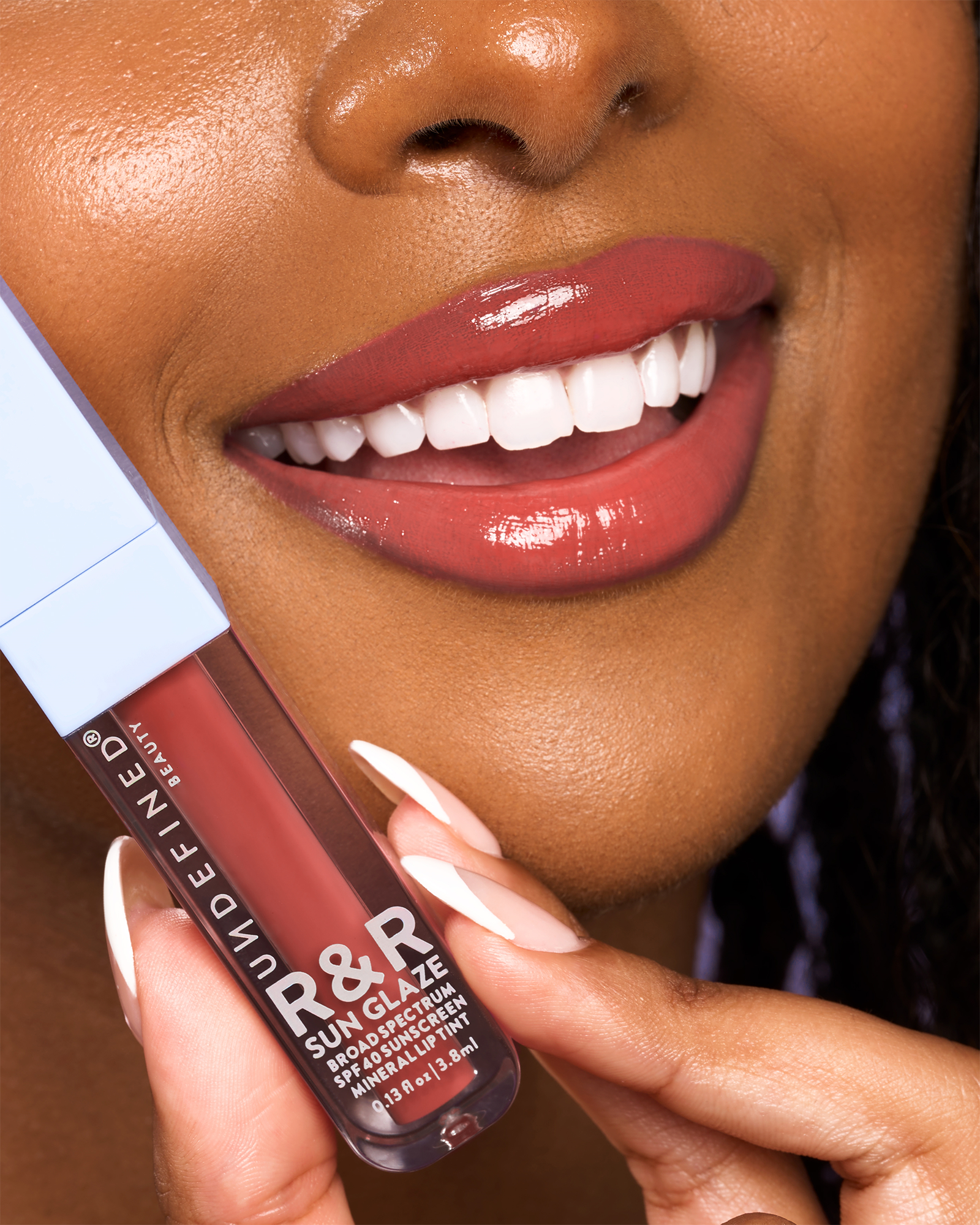 Undefined Beauty R&R Sun Glaze Mineral SPF 40 Lip Tint is like a SPF basecoat + topcoat for your lips. This non-sticky lip oil tint is infused with Ceramides, Peptides and Hyaluronic Acid to deliver a pop of color + Broad Spectrum SPF 40 protection.