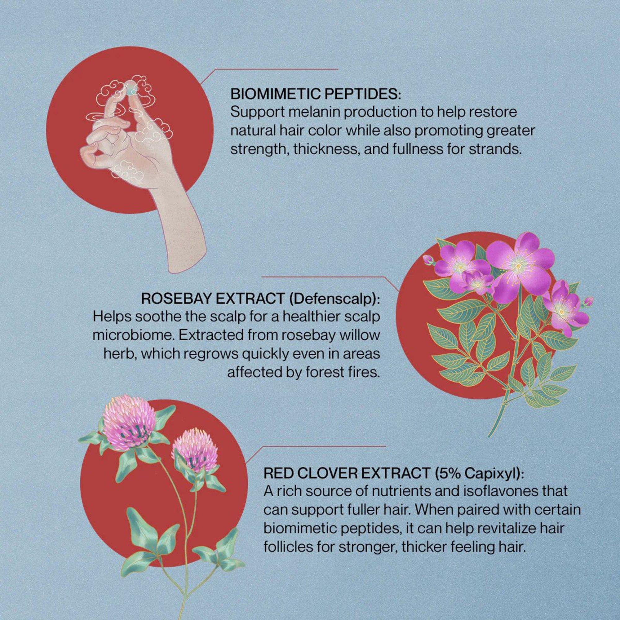 • BIOMIMETIC PEPTIDES: Support melanin production to help restore natural hair color while also promoting greater strength, thickness, and fullness for strands.