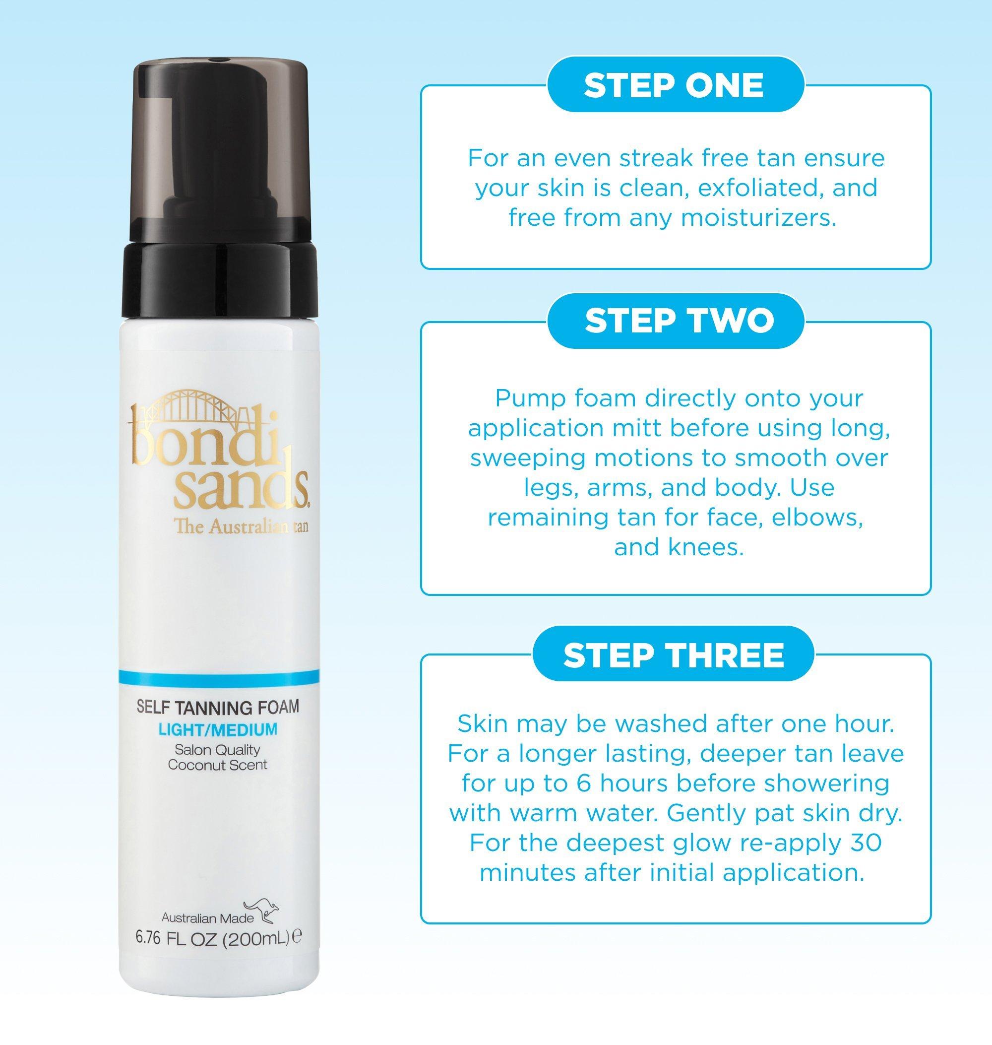 Step 3: Skin may be washed after one hour. For a longer lasting darker tan leave foam on skin for up to 6 hours. Shower with warm water and gently pat skin dry. For the deepest tan re-apply Bondi Sands Self Tanning Foam 30 minutes after initial application.