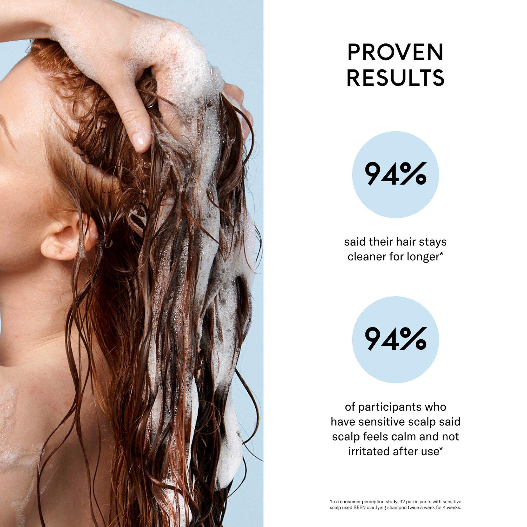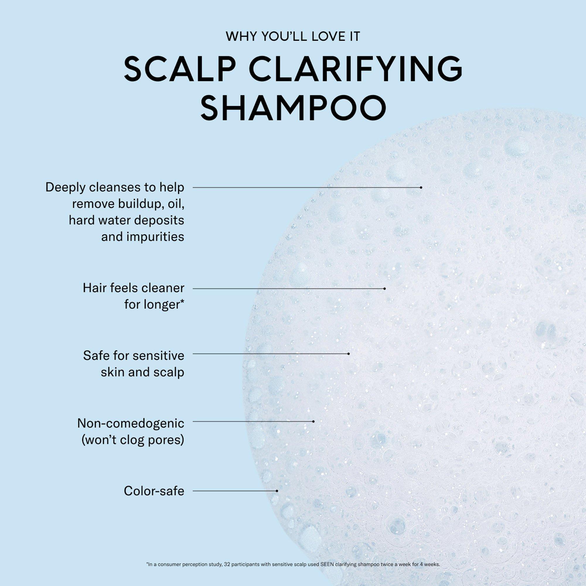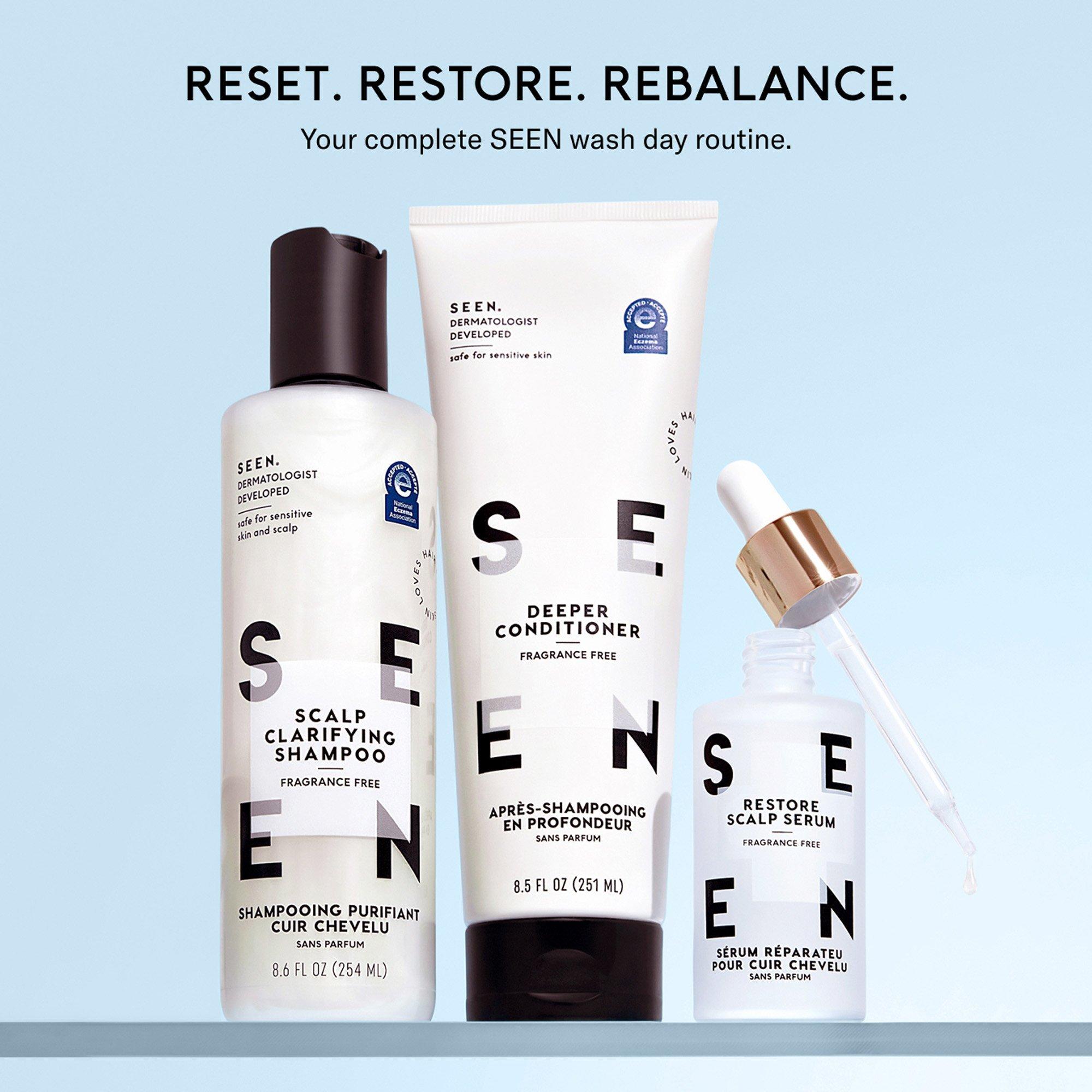 SEEN’s Scalp Clarifying Shampoo is Dermatologist-designed to deeply, yet gently cleanse the scalp, helping remove buildup, excess oil, hard water deposits, and impurities—and leaving scalp and hair refreshed.