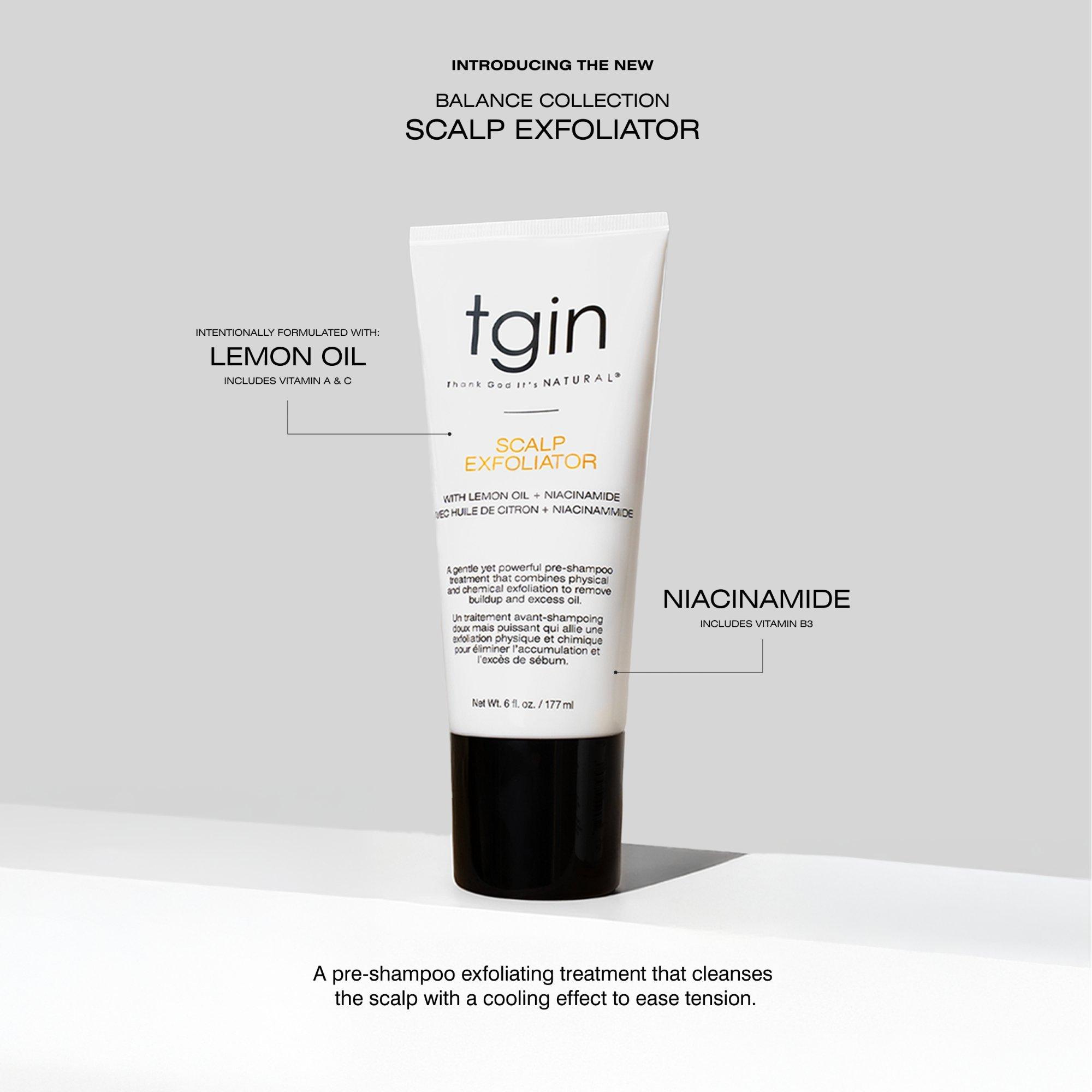 tgin's Balance Collection Scalp Exfoliator is a gentle yet powerful pre-shampoo treatment that combines physical and chemical exfoliation to remove buildup and excess oil. Made with Niacinamide to regulate oil production, strengthen hair, and treat your scalp with the same care you give your face.