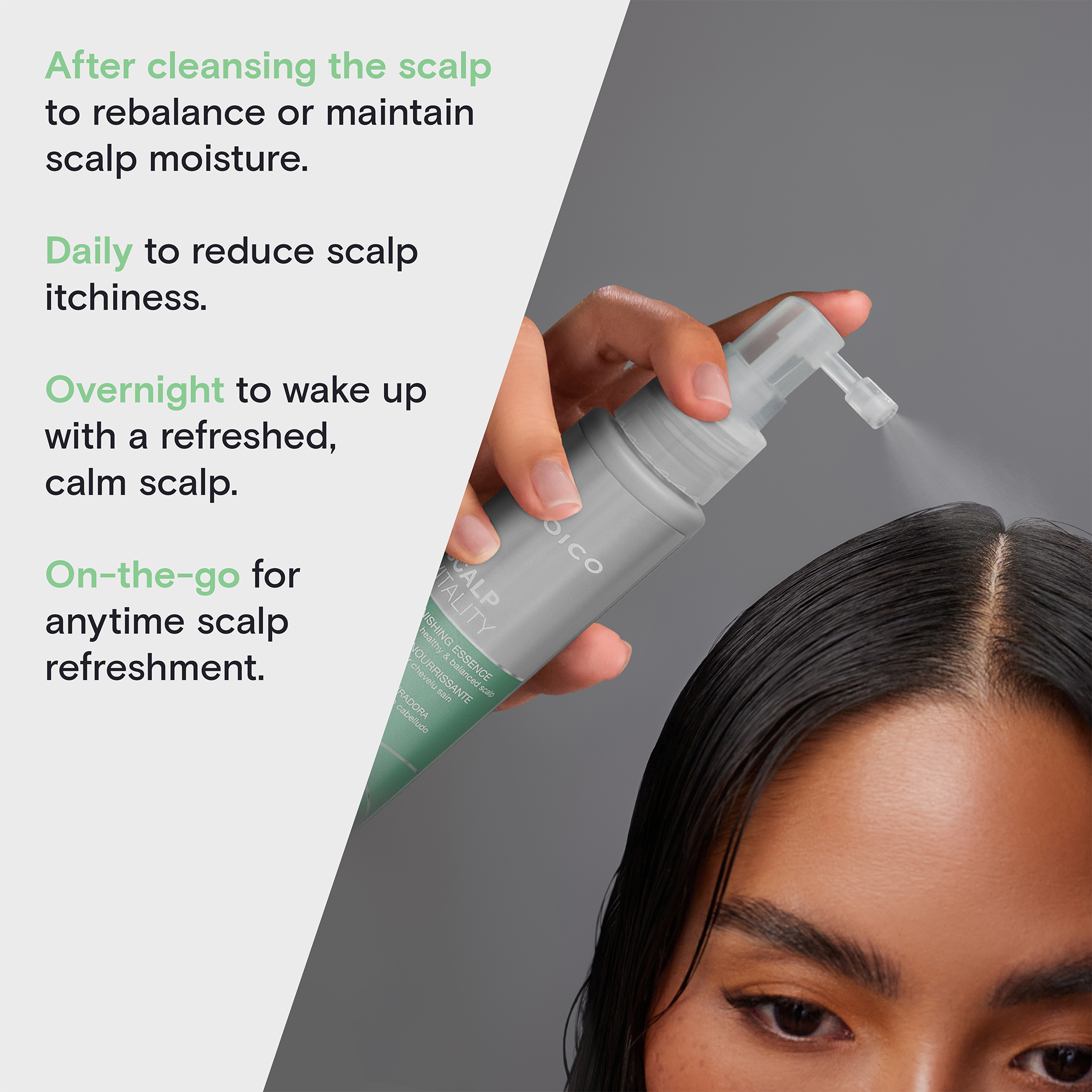 Itching for a solution to dry, tight scalp? Joico replenishing scalp essence delivers that divinely soothing "ahh" sensation you crave. This microbiome-friendly formula goes right to the roots to hydrate and nourish the scalp leaving your scalp feeling calm, replenished, and blissfully comfortable.
