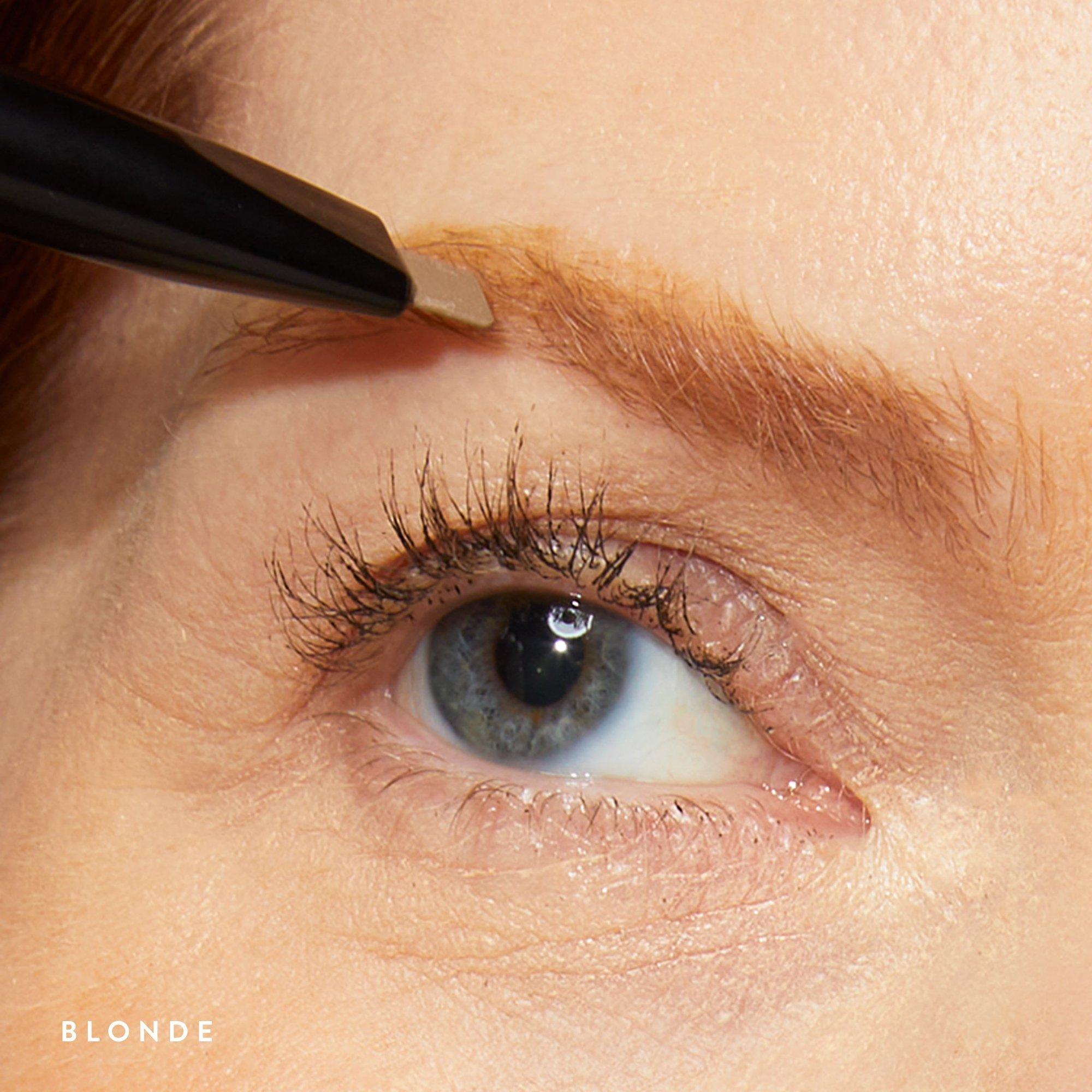 Use the angled pencil to fill in brows with light, upward strokes, focusing on sparse areas.