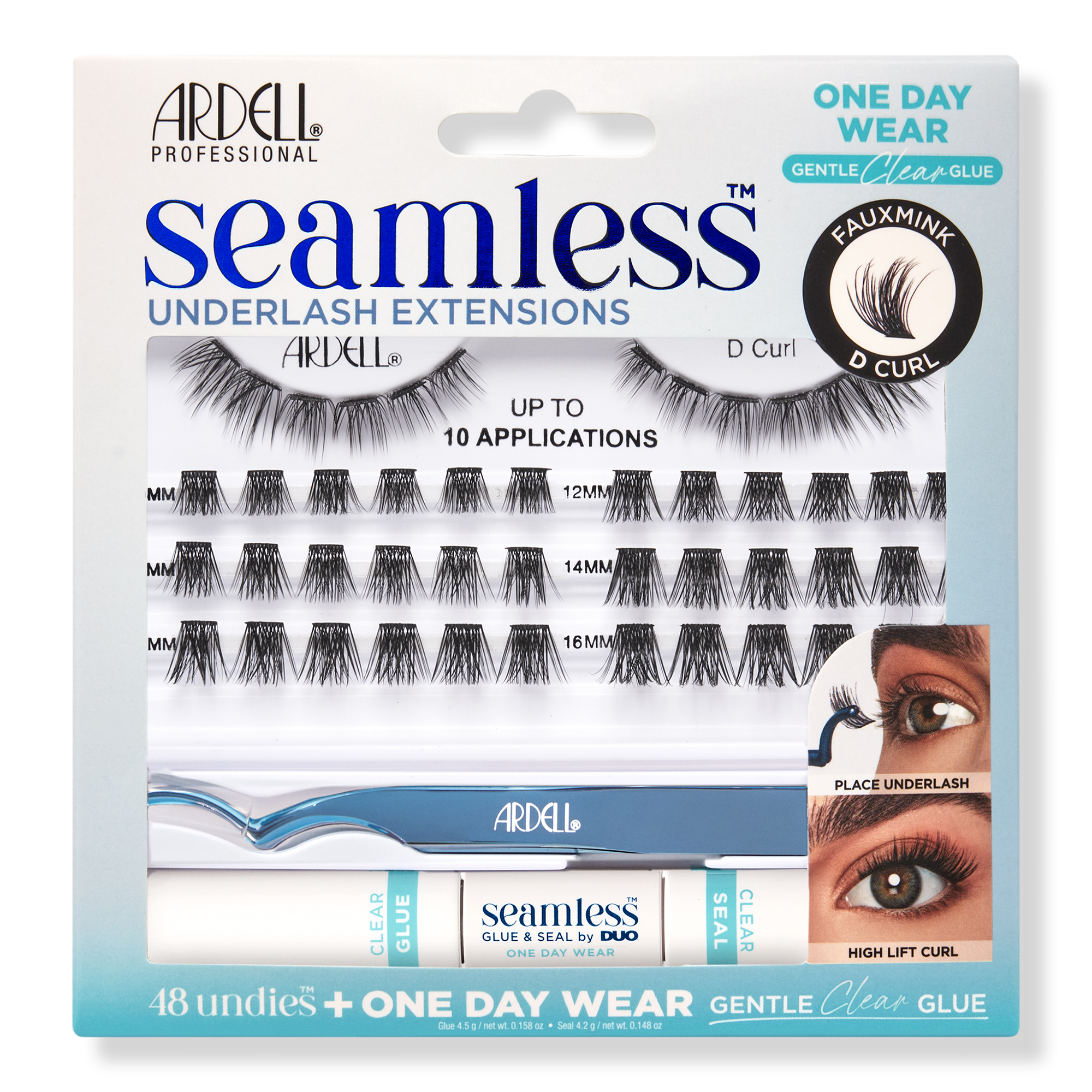 Ardell's Seamless Underlash Extension Kit - Faux Mink D Curl stunning curve creates a lifted look for bigger, brighter eyes while dark, full volume layers add definition and density to lashes.