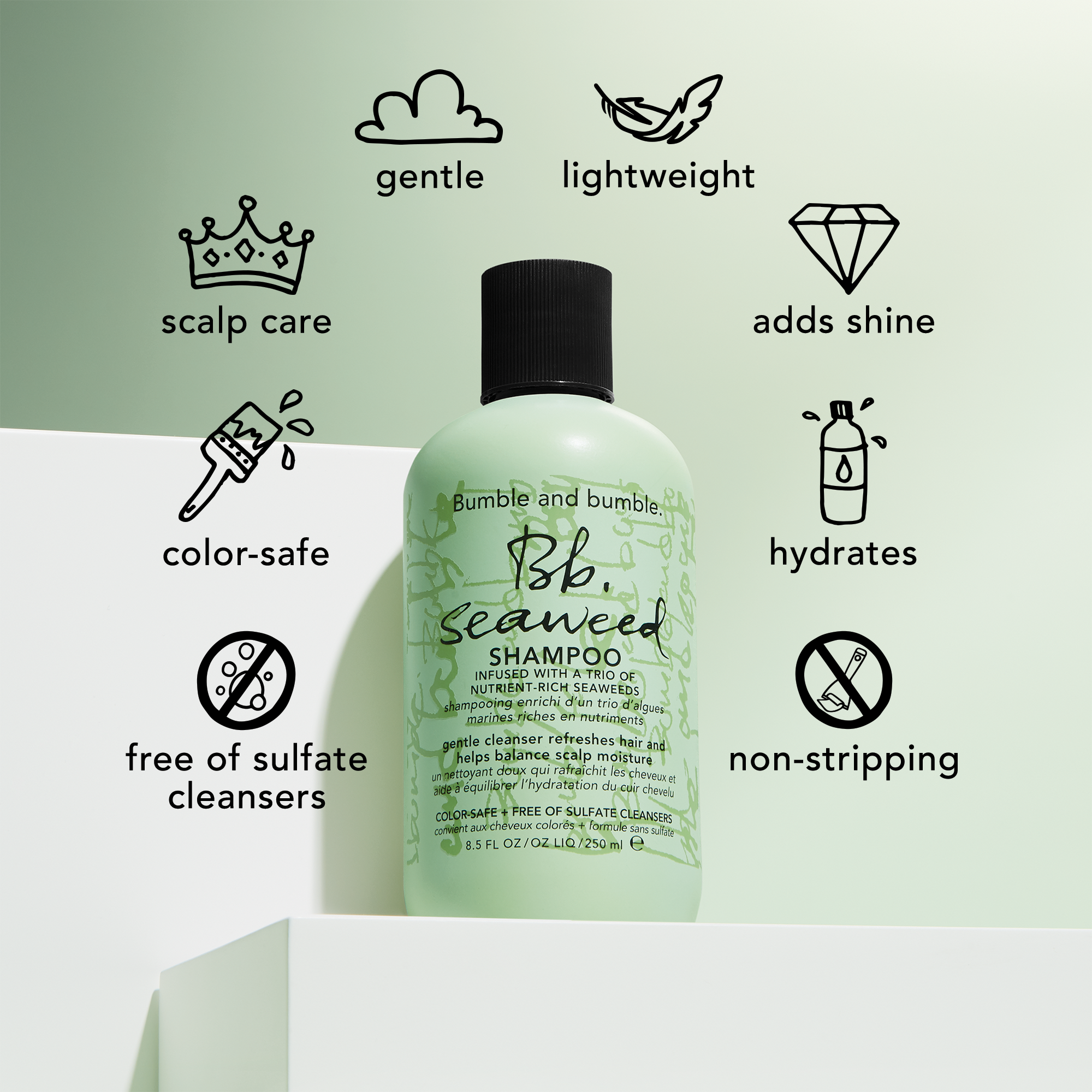Bumble and bumble Seaweed Nourishing Shampoo helps balance scalp moisture and washes away dirt, excess oil, and product buildup without stripping hair. 91% showed improved scalp hydration in clinical testing on 32 subjects when used together with Seaweed Conditioner after using 3 times.