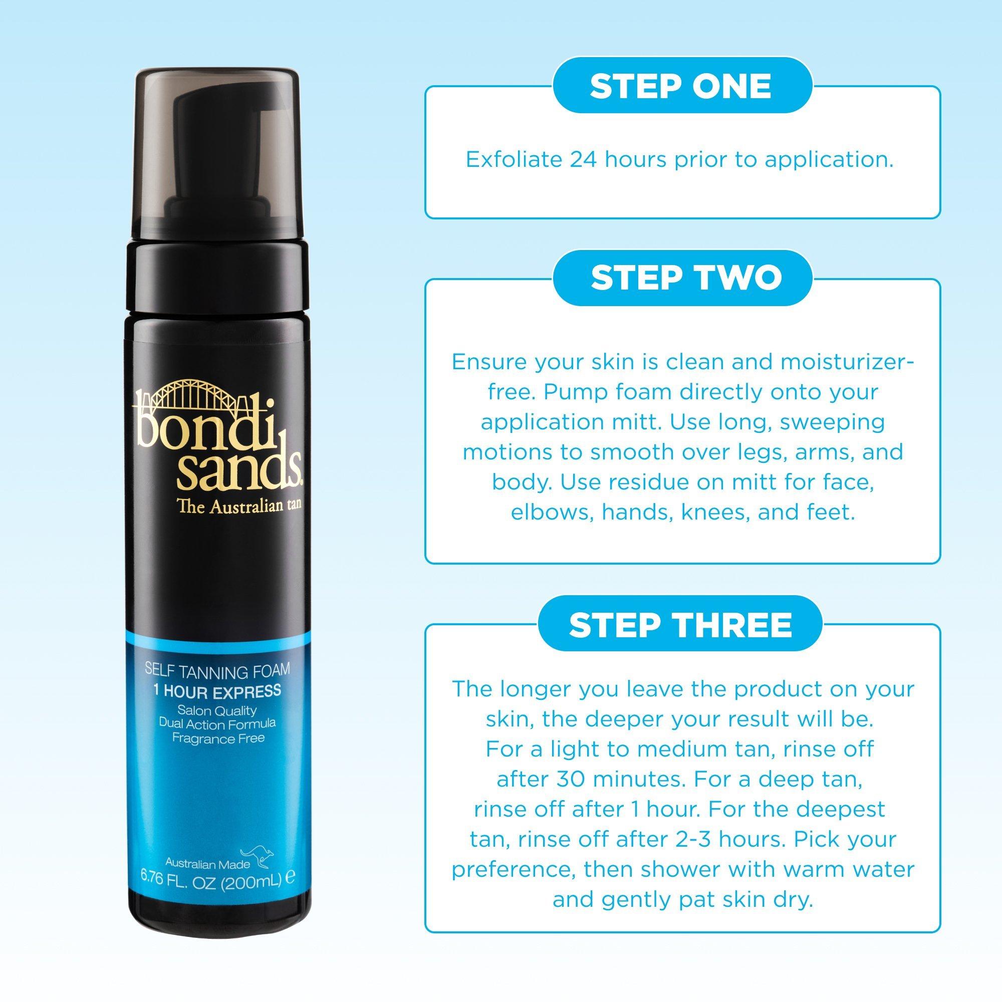 Step 2: Pump foam applicator firmly. Apply Bondi Sands Self Tanning Foam liberally to an Application Mitt. Use a long, sweeping motion to apply to legs, arms and body. Use remaining residue on mitt to apply to face, elbows and knees.
