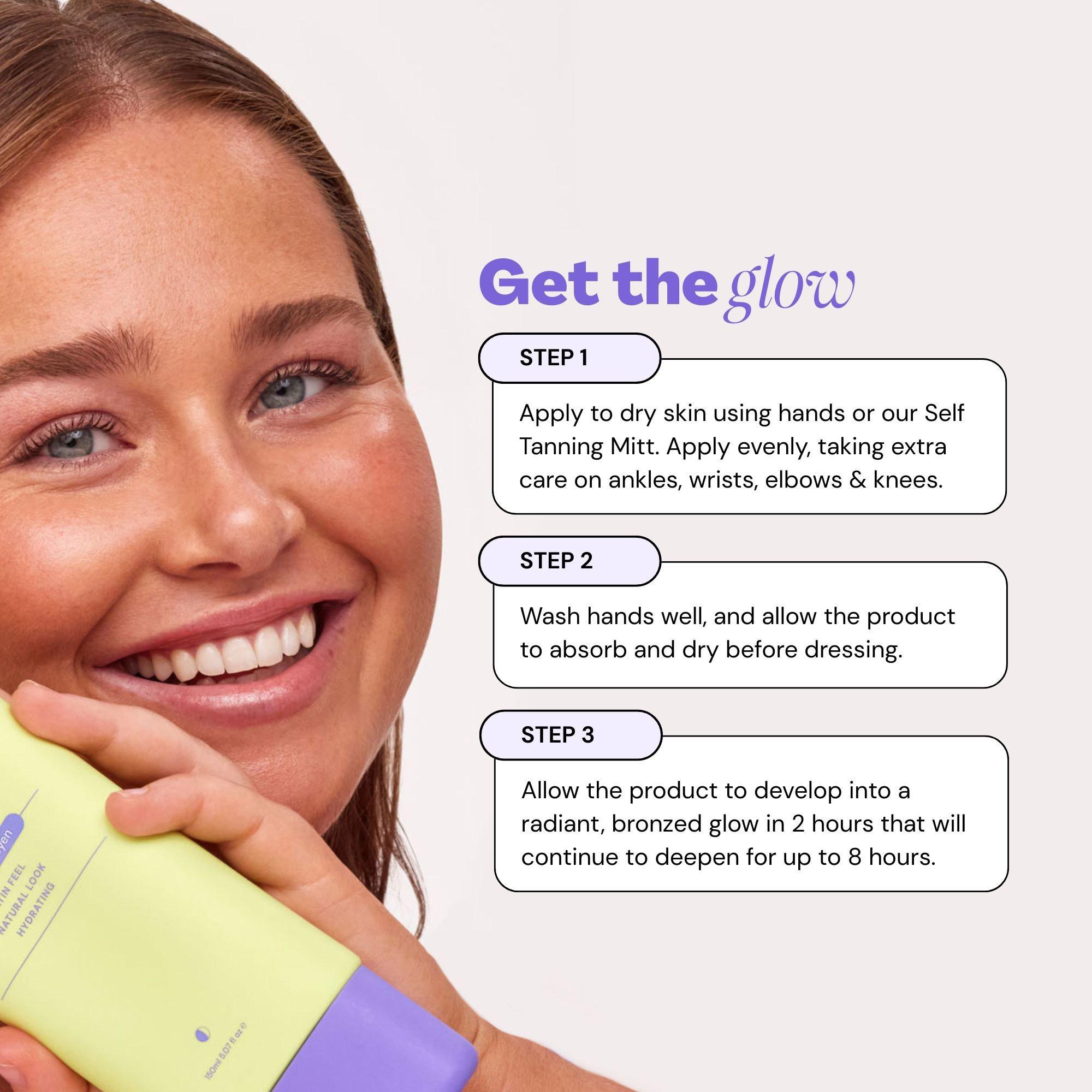 Step 1: Apply to dry skin using hands or the Luna Bronze Self Tanning Mitt. Apply evenly, taking extra care on ankles, wrists, elbows \& knees.