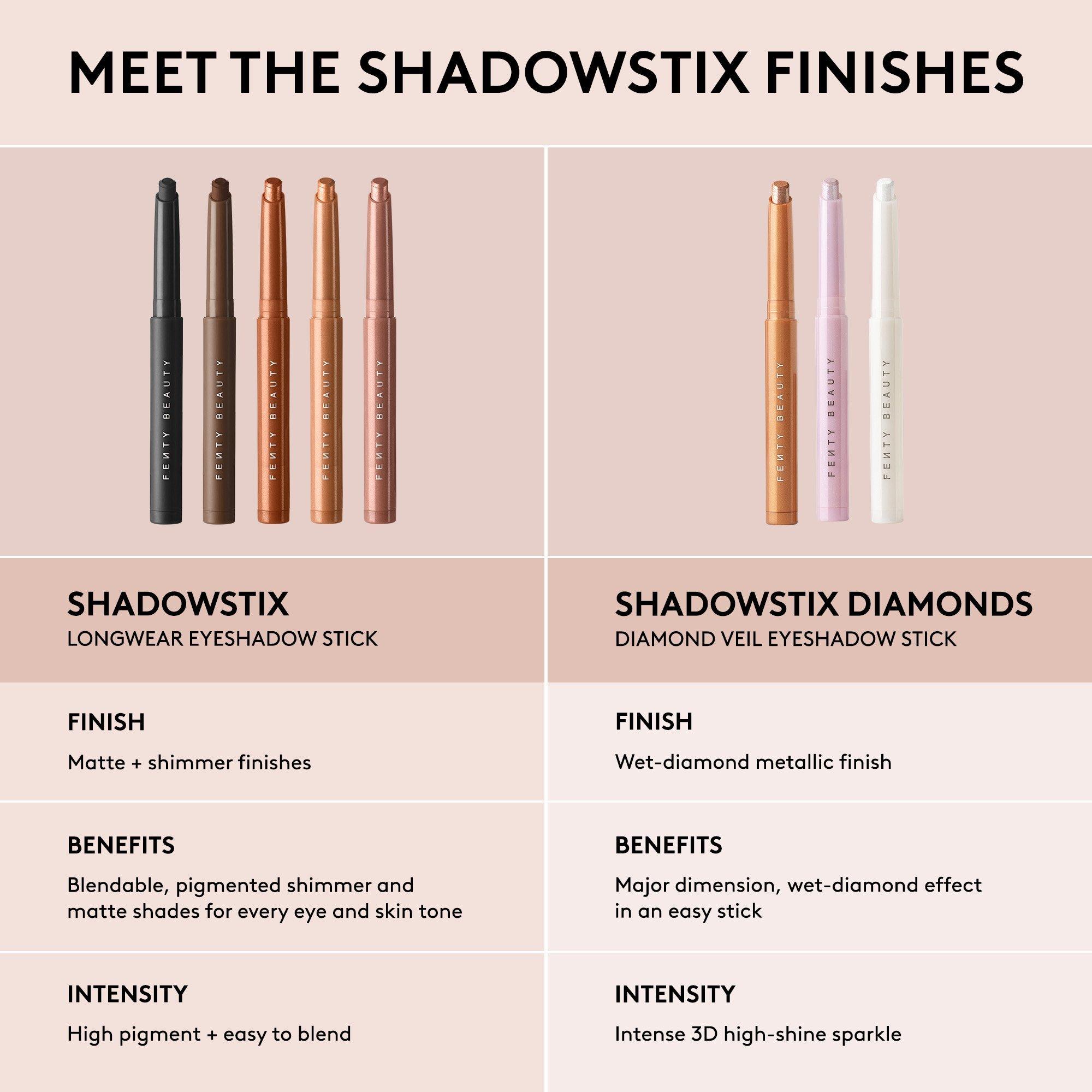 FENTY BEAUTY's creamy longwear Diamond Veil Eyeshadow Sticks deliver high-impact color intensity in just a single swipe. Each shimmer and mega-sparkle shade were expertly developed to create endless looks with dimension from subtle to shimmered, to wet-diamond, sparkle effect.