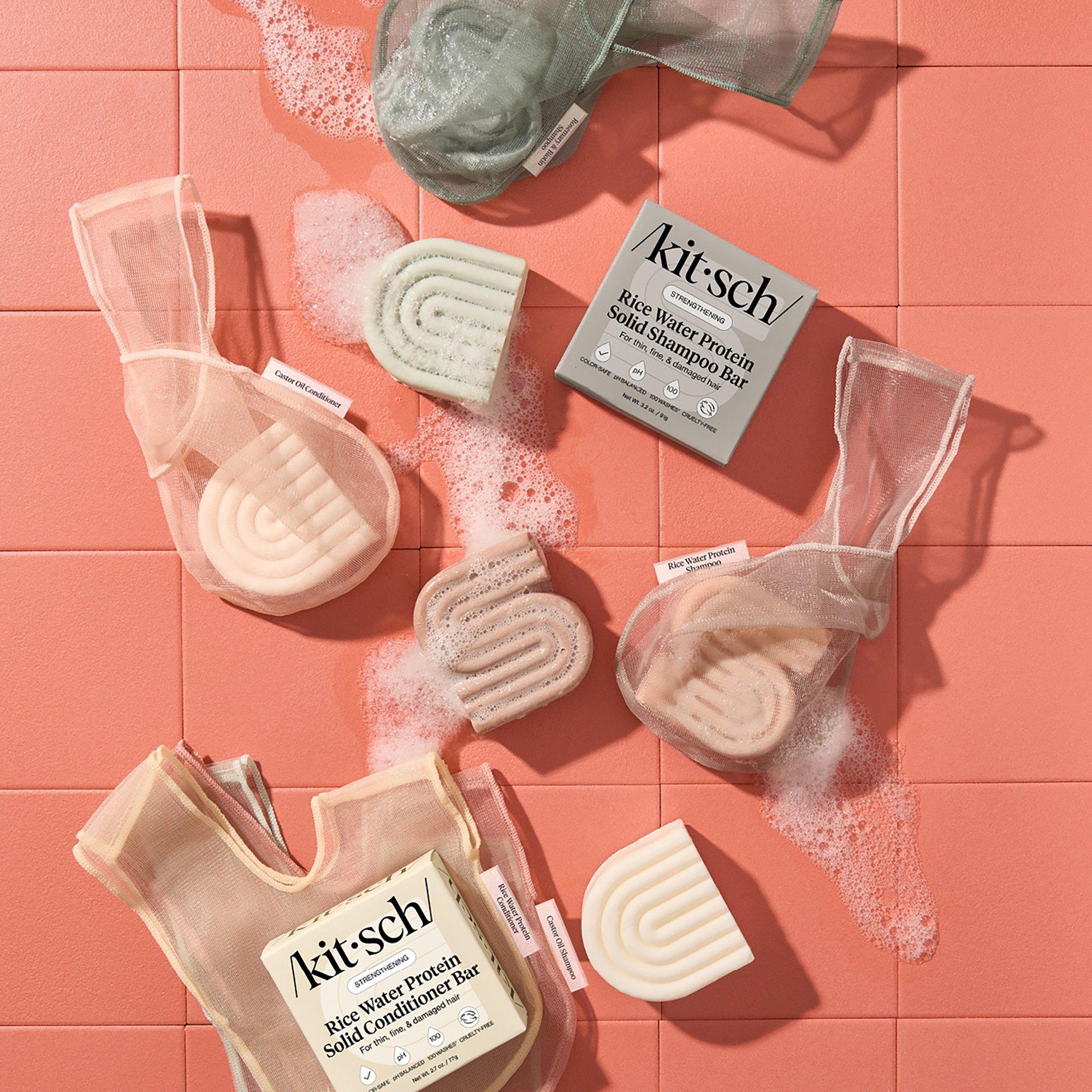 Place your Kitsch Solid Shampoo Bar in the bag. Feed the long side through the center hole on the short side to form a top loop. Wear the loop around your wrist and wet the bag. Rub the bag and bar between both hands, then gently massage through your hair. Hang your bar in the bag to help it dry quickly and last longer.