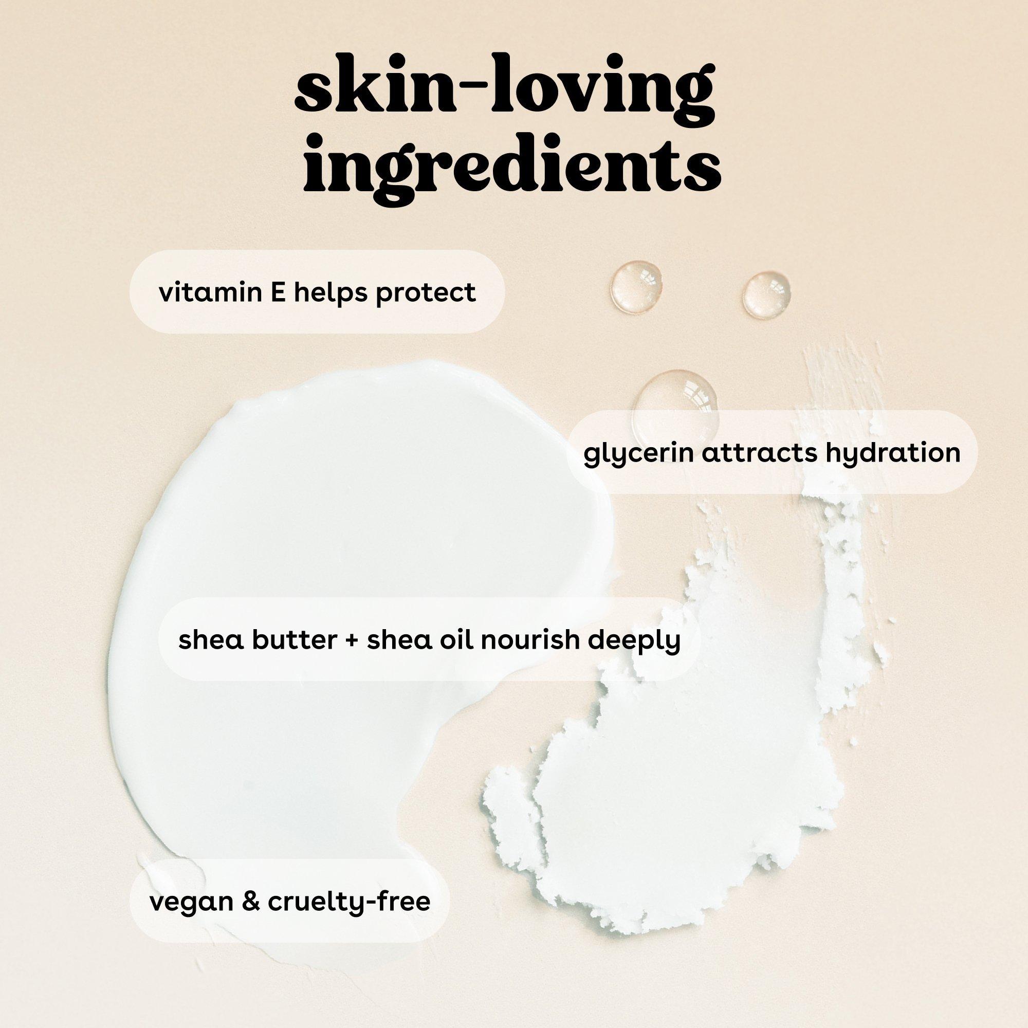 Eos Shea Better 24HR Moisture Body Lotion with instantly moisturizing Shea Oil + lasting protection Shea Butter quickly absorbs for 24-hour hydration. Say hello to... fast-absorption, lightweight, soft skin, and sustainable shea. Say goodbye to... greasiness, heaviness, and sticky residue.