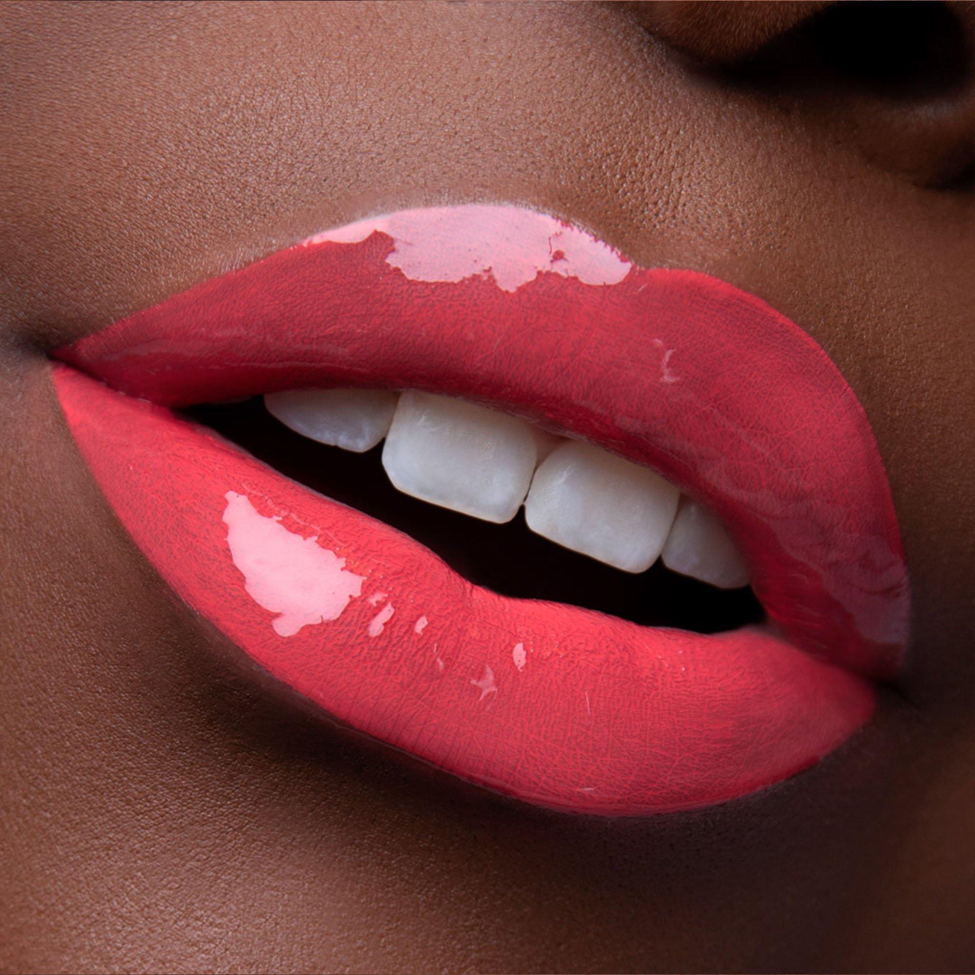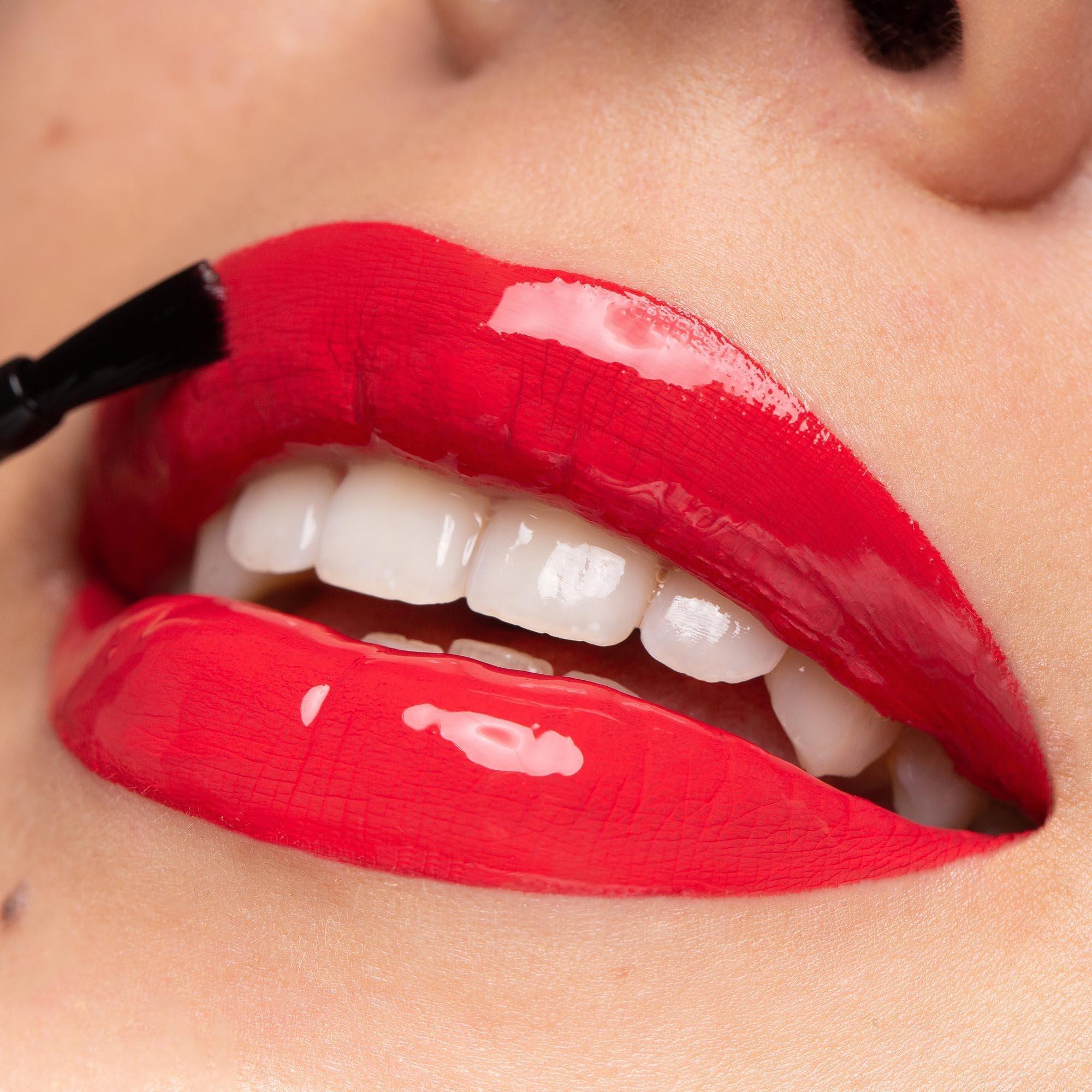 Apply base coat to bare lips. Wait 90 seconds to dry. Lock in pigment with glossy top coat. Result: High shine color with 16h, zero color transfer wear.