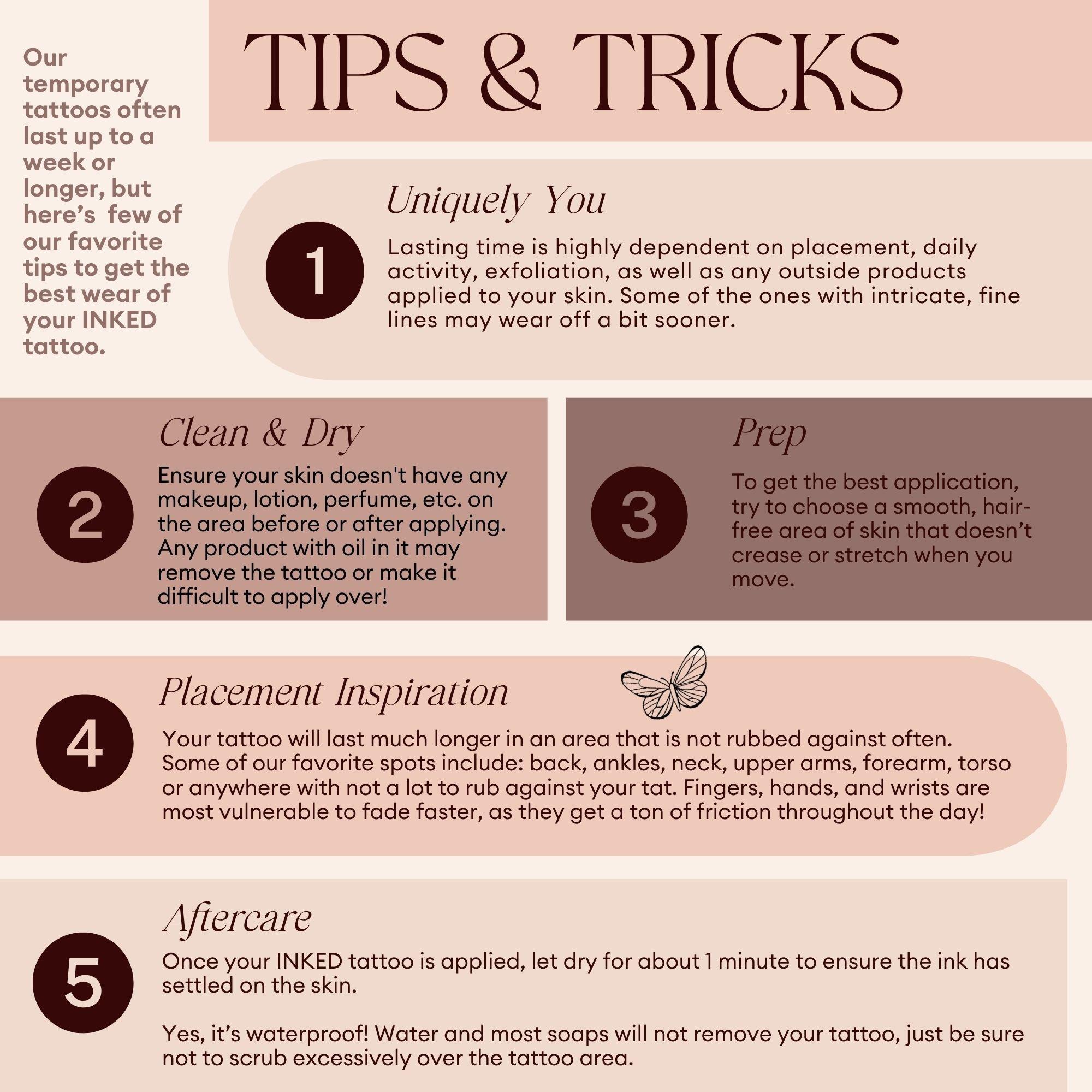 Apply in seconds with just water! Peel off the plastic top sheet, place and press the tattoo face down, and wet the tattoo paper with water until it is completely soaked through. Press and hold down in place for a few seconds, then gently peel up paper to reveal your INKED!