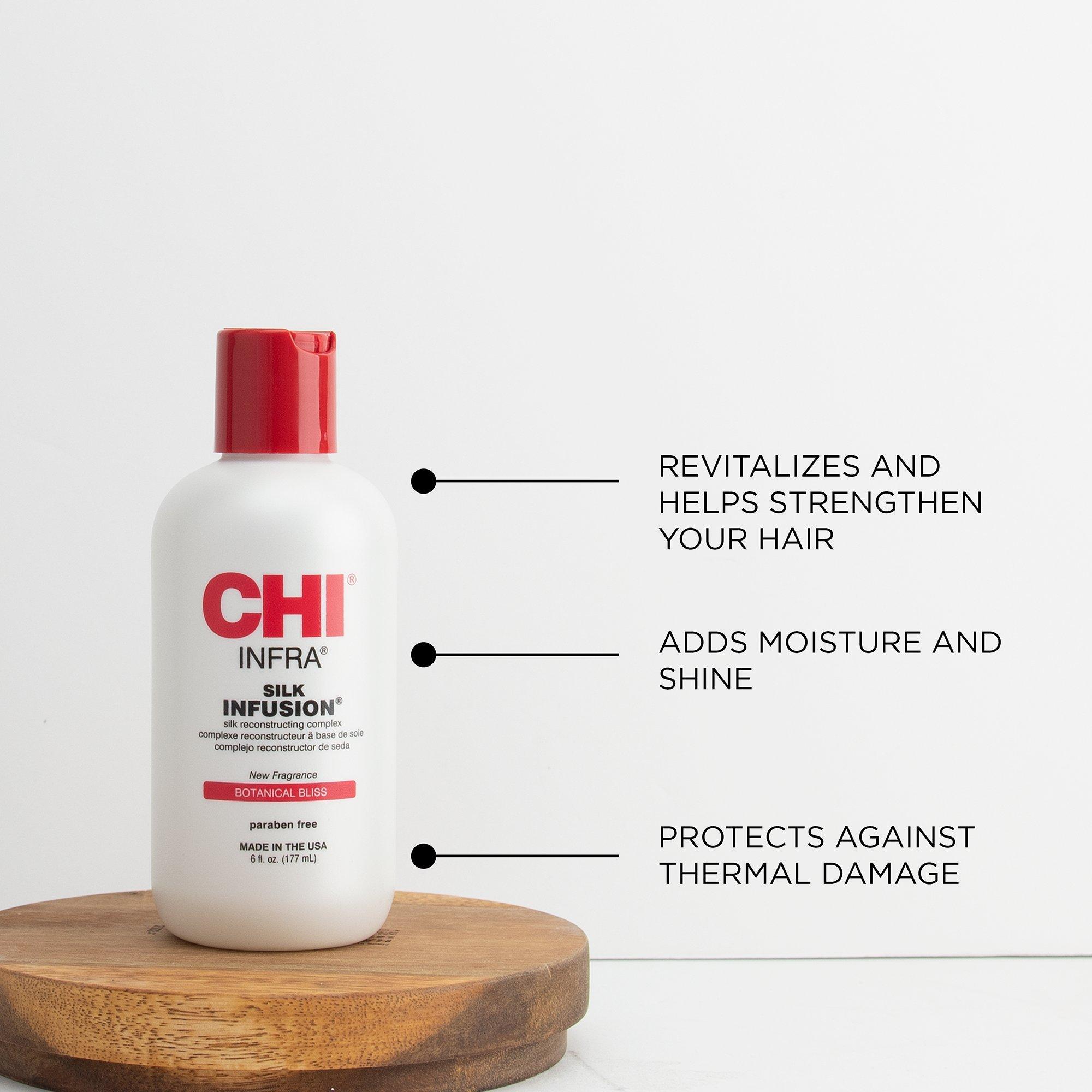 CHI Silk Infusion Silk Reconstructing Complex is a rich leave-in treatment enriched with silk, wheat, and soy proteins that will penetrate and help strengthen the hair, providing incredible softness, manageability and shine without build up. Now available in Botanical Bliss scent.