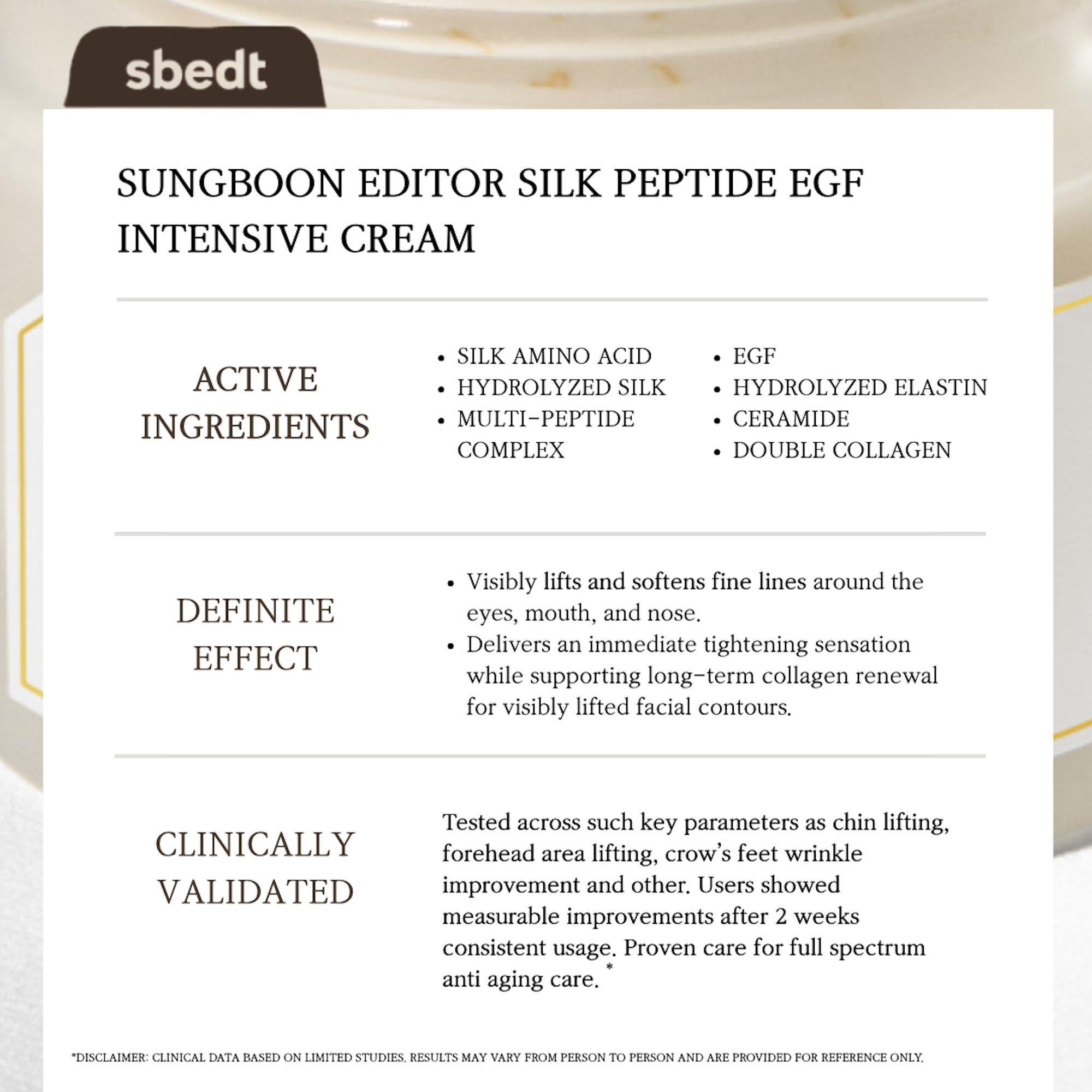 SUNGBOON EDITOR Silk Peptide EGF Intensive Cream is powered by collagen threads, patented peptides, proteins, volufiline, and silk amino acids. It nourishes sagging skin, lifts and firms, while sealing in hydration with a volumizing coating for a youthful, radiant glow.
