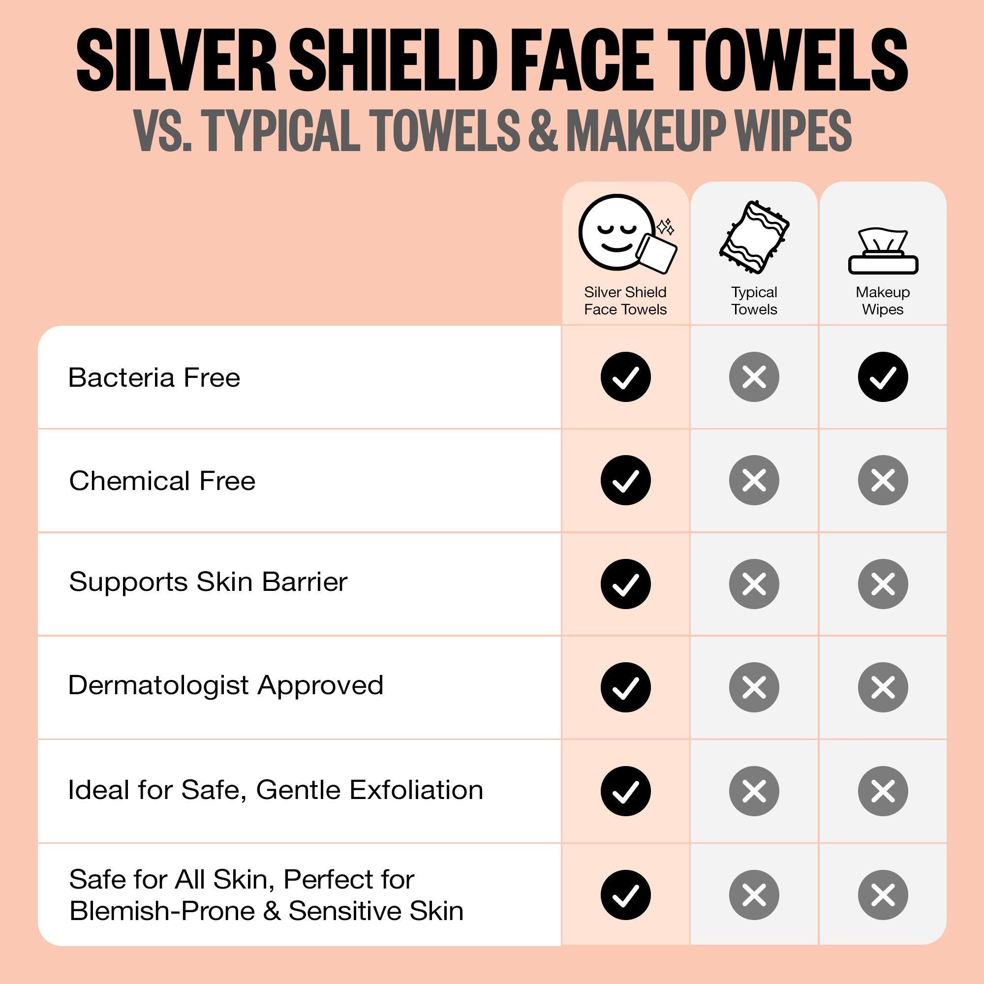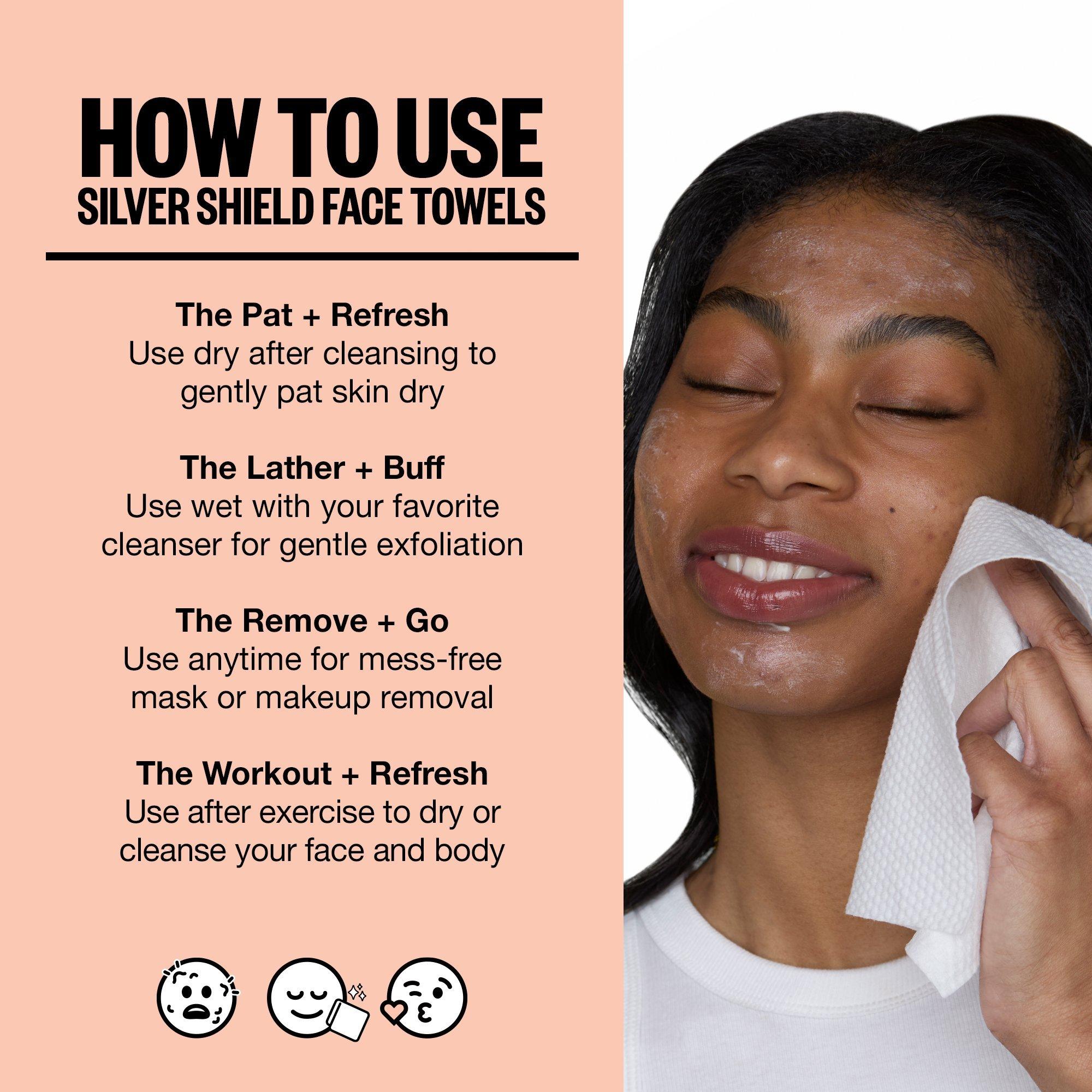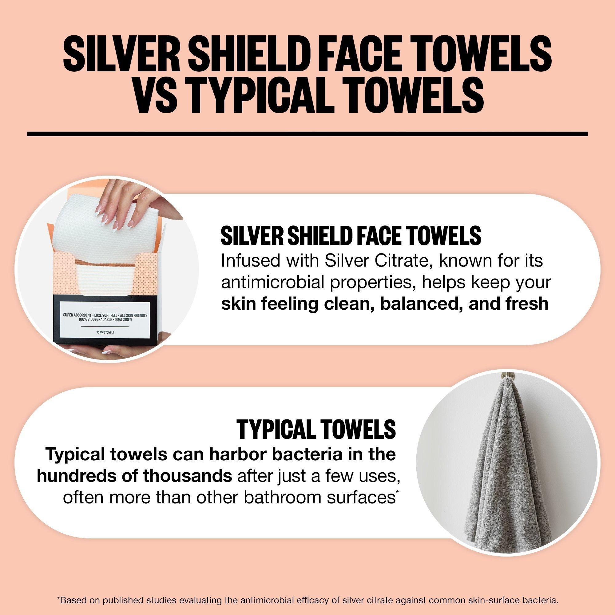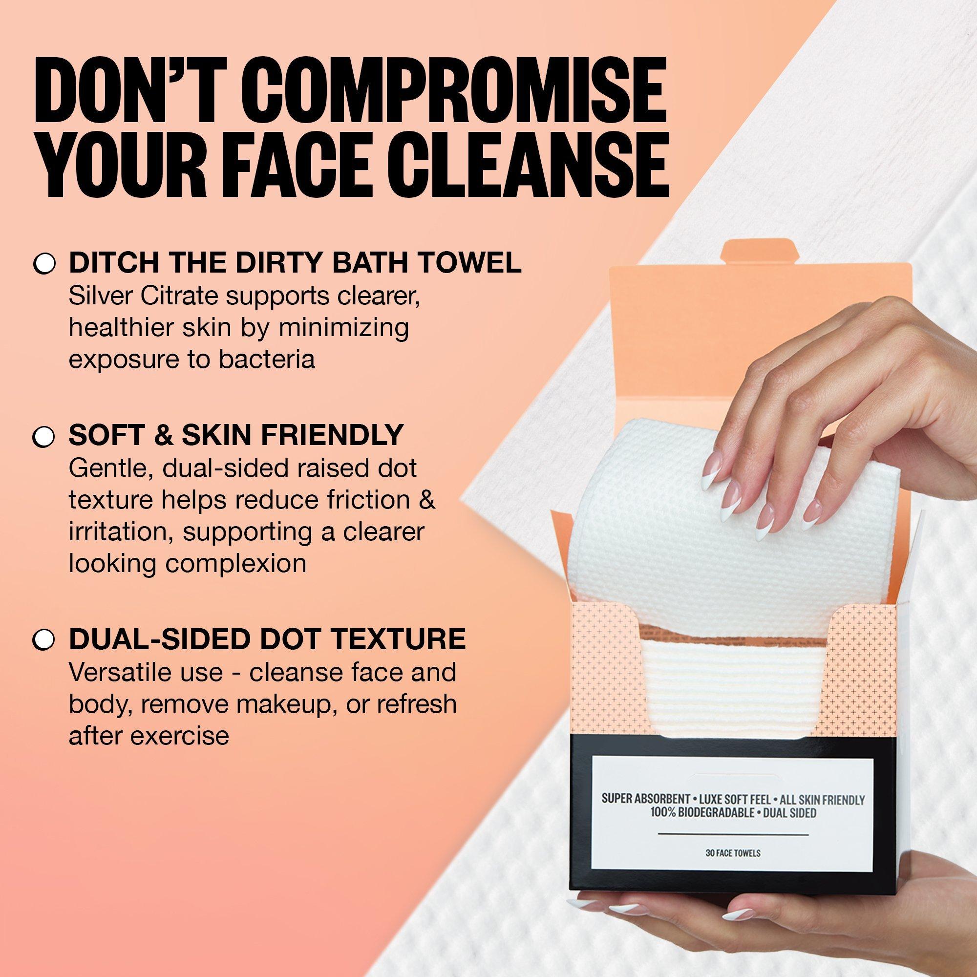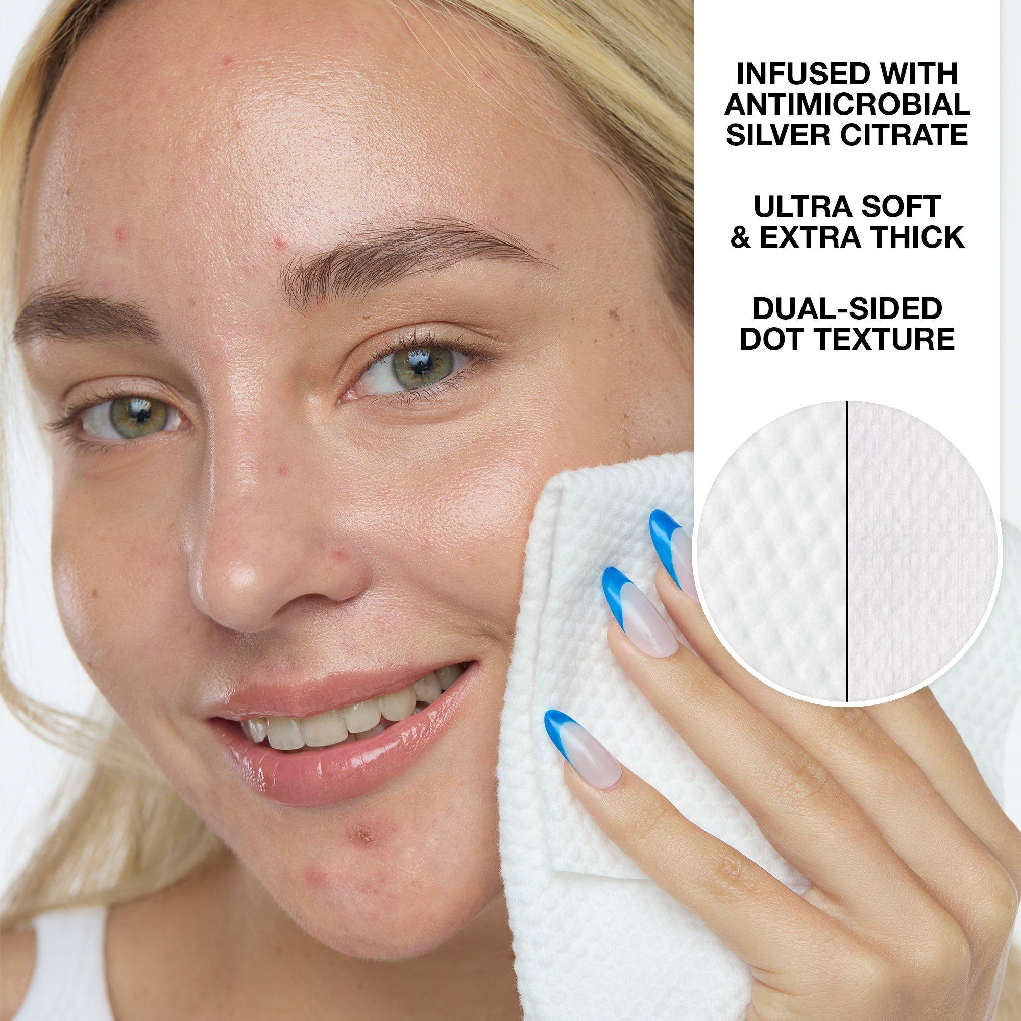 • These ultra-soft towels don’t just dry your skin—they defend it. Designed to be used daily, they help keep things hygienic, support your skin barrier, and formulated with Silver Citrate to give your cleanser the extra backup it needs to fight off breakout-causing bacteria.