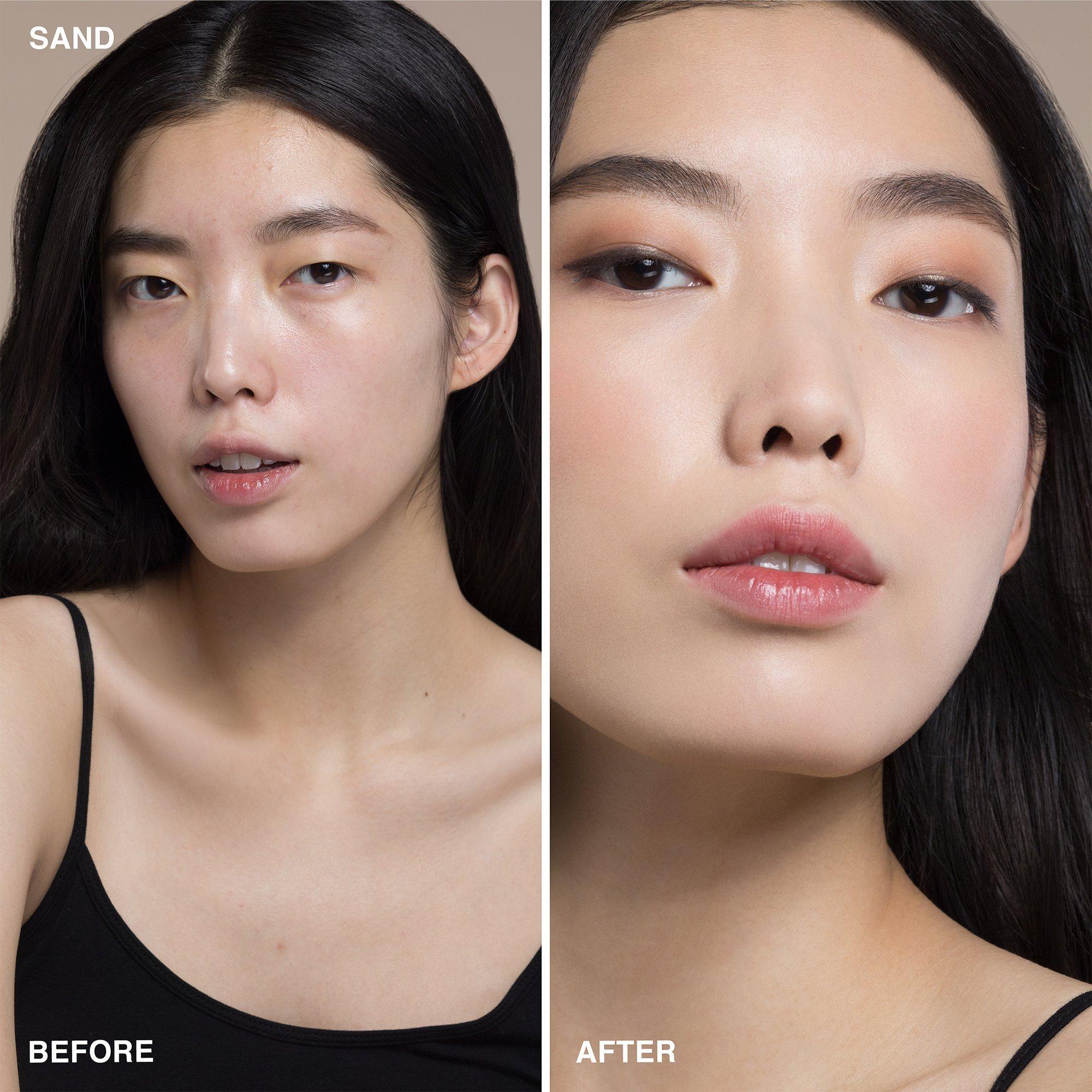 After moisturizing skin, lightly swipe across forehead, cheeks, nose, and chin. Blend with fingertips, a sponge, or a foundation brush. Build coverage as desired.