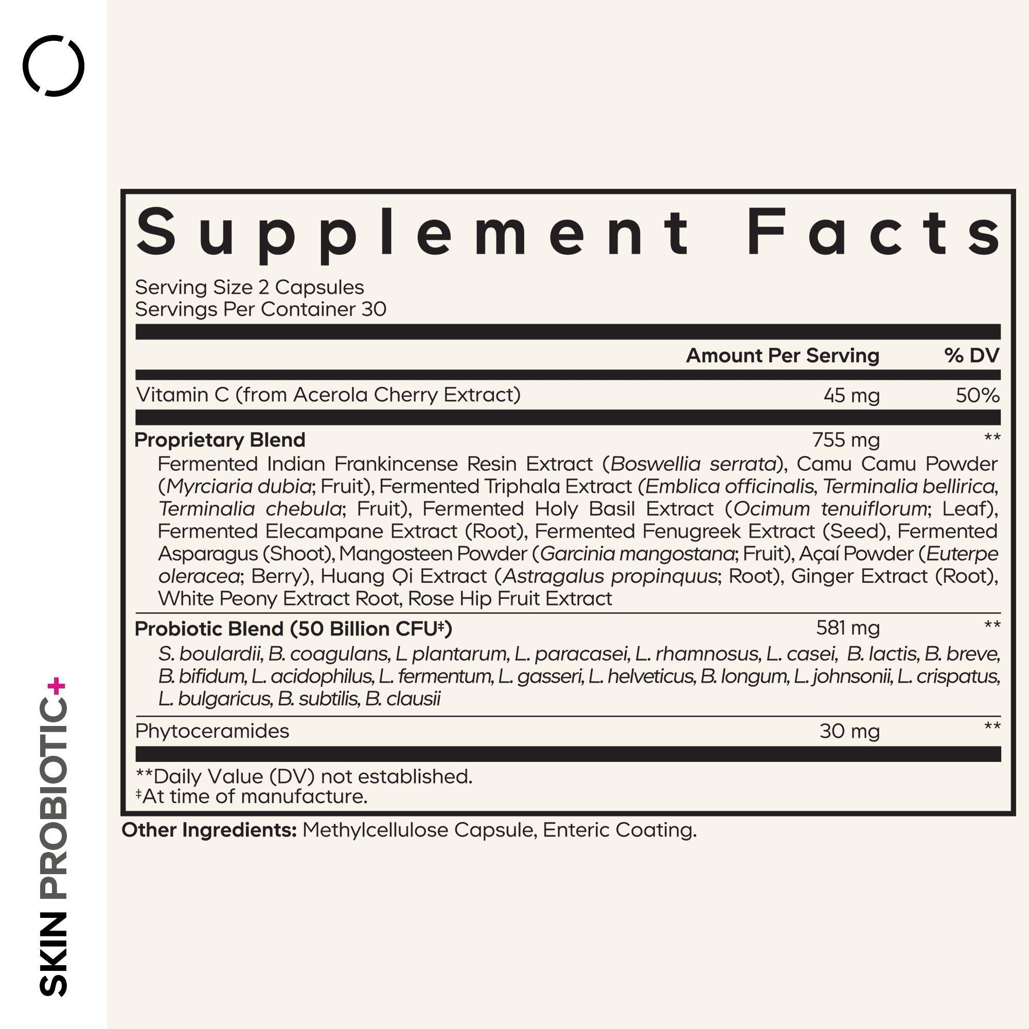 Vitamin C (from Acerola Cherry Extract), Proprietary Blend: Fermented Indian Frankincense Resin Extract (Boswellia serrata), Camu Camu Powder (Myrciaria dubia; Fruit), Fermented Triphala Extract (Amla Fruit Extract), Fermented Holy Basil Extract (Ocimum tenuiflorum; Leaf), Fermented Elecampane Extract (Root), Fermented Fenugreek Extract (Seed), Fermented Asparagus (Shoot), Mangosteen Powder (Garcinia mangostana; Fruit), Açaí Powder (Euterpe oleracea; Berry), Huang Qi Extract (Astragalus propinquus; Root), Ginger Extract (Root), White Peony Extract Root, Rose Hip Fruit Extract; Probiotic Blend (50 Billion CFU‡): S. boulardii, B. coagulans, L plantarum, L. paracasei, L. rhamnosus, L. casei, B. lactis, B. breve, B. bifidum, L. acidophilus, L. fermentum, L. gasseri, L. helveticus, B.longum, L. johnsonii, L. crispatus, L. bulgaricus, B. subtilis, B. clausii; Phytoceramides. Other Ingredients: Enteric Coating, Methylcellulose Capsule. ‡At time of manufacture.