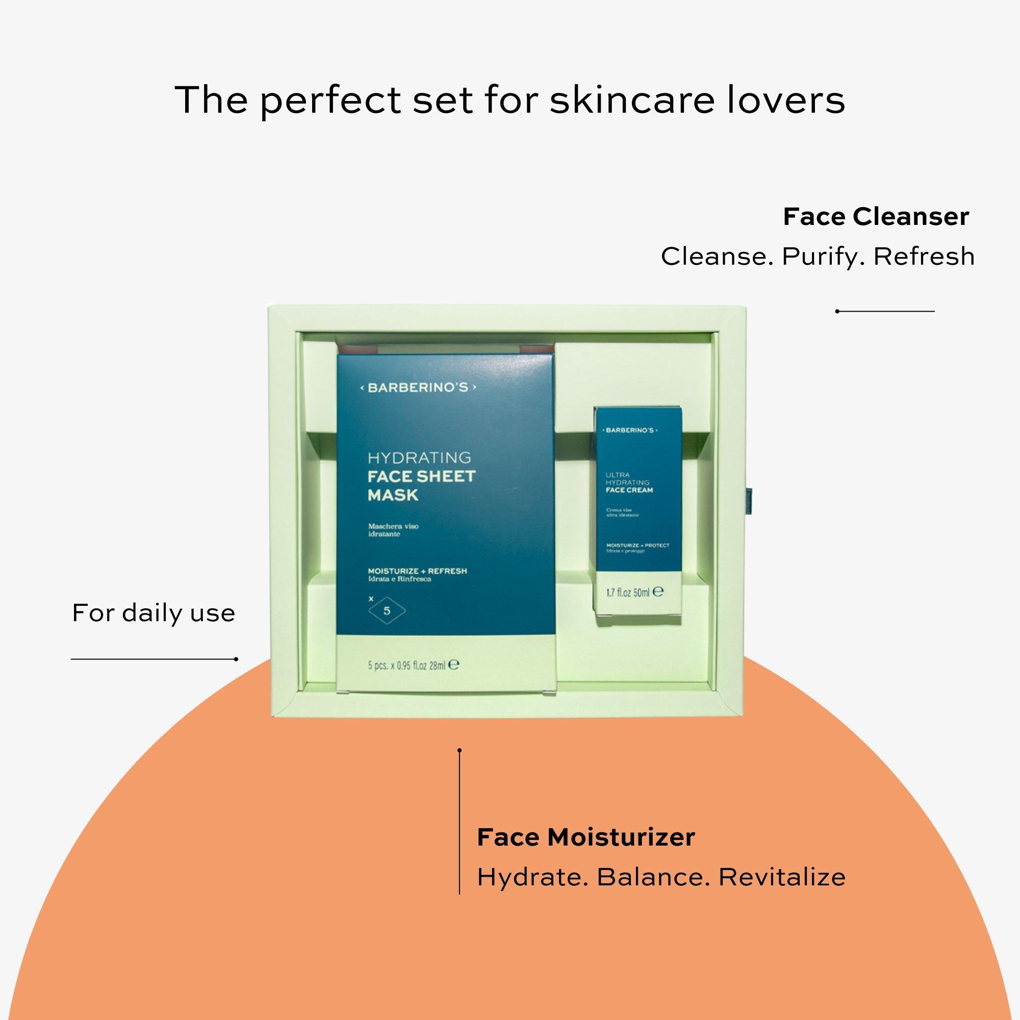 Face Care Set includes essential skincare products to cleanse, deeply hydrate and refresh skin for a healthier complexion. Daily-use formula improves texture, balances moisture and leaves skin soft and revitalized. Perfect for all skin types and complete daily skincare routine.