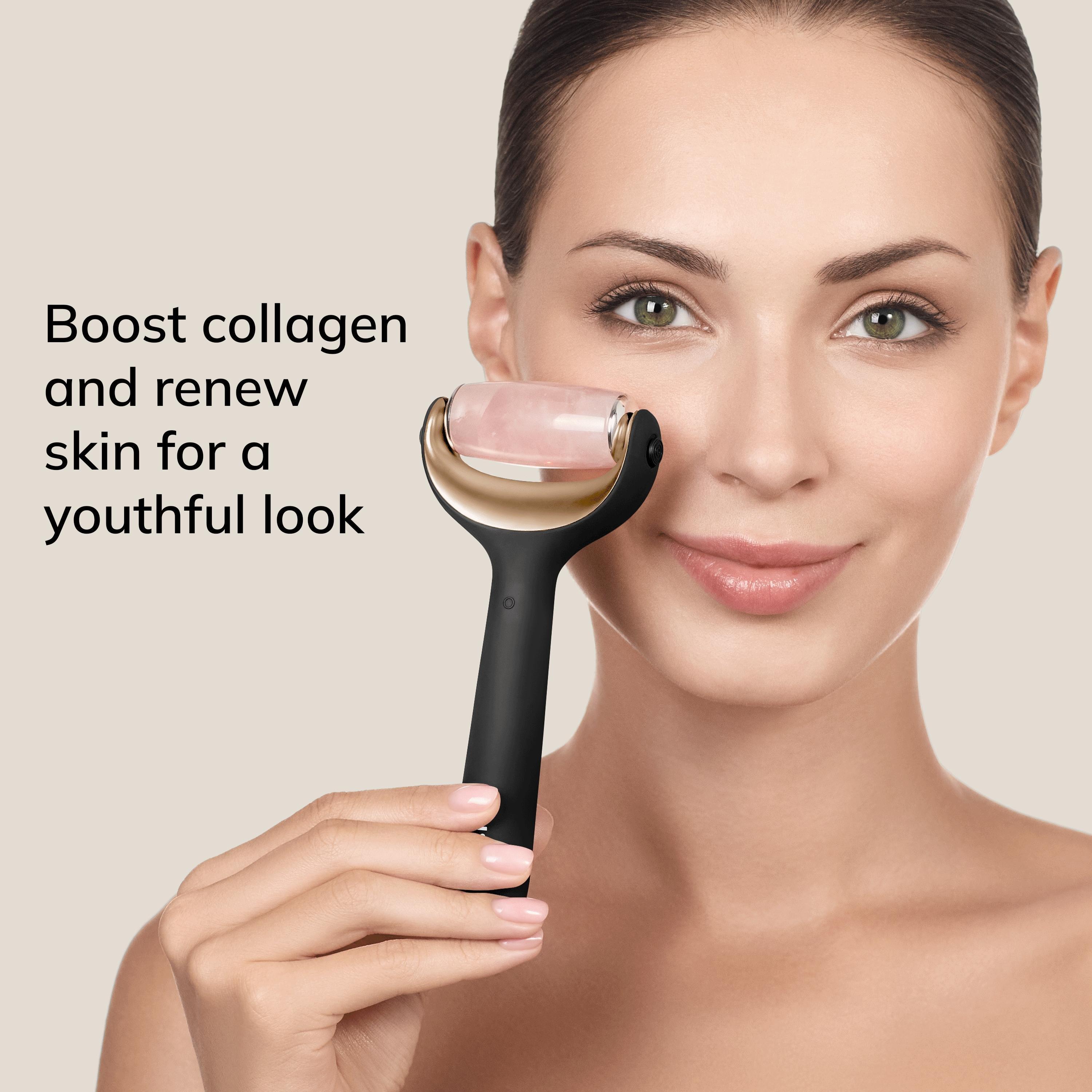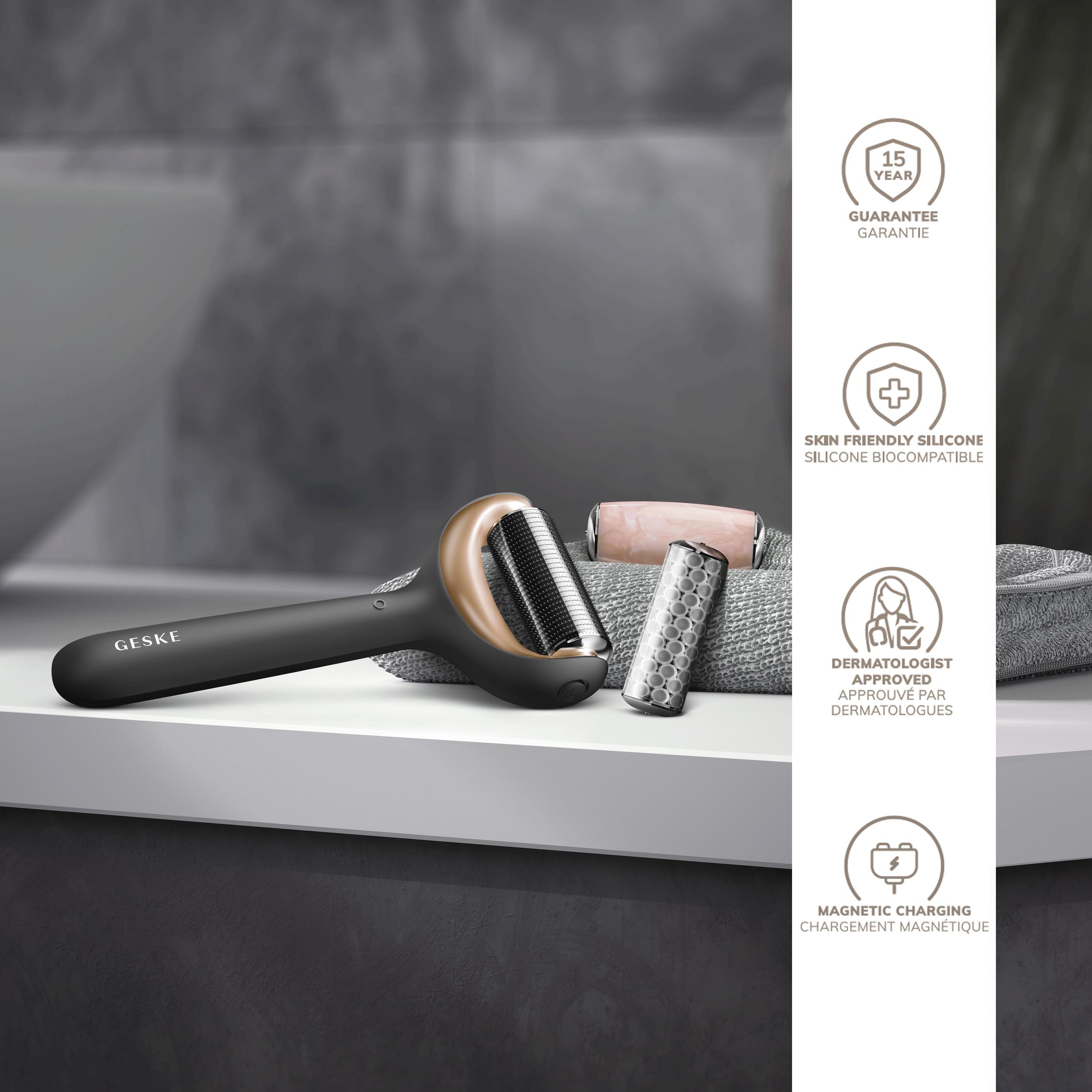 Stimulate your skin with the GESKE SmartAppGuided MicroNeedle Face & Body Roller 9 in 1. This innovative beauty device comes with a MicroNeedle, a Cooling head and a Rose Quartz head.