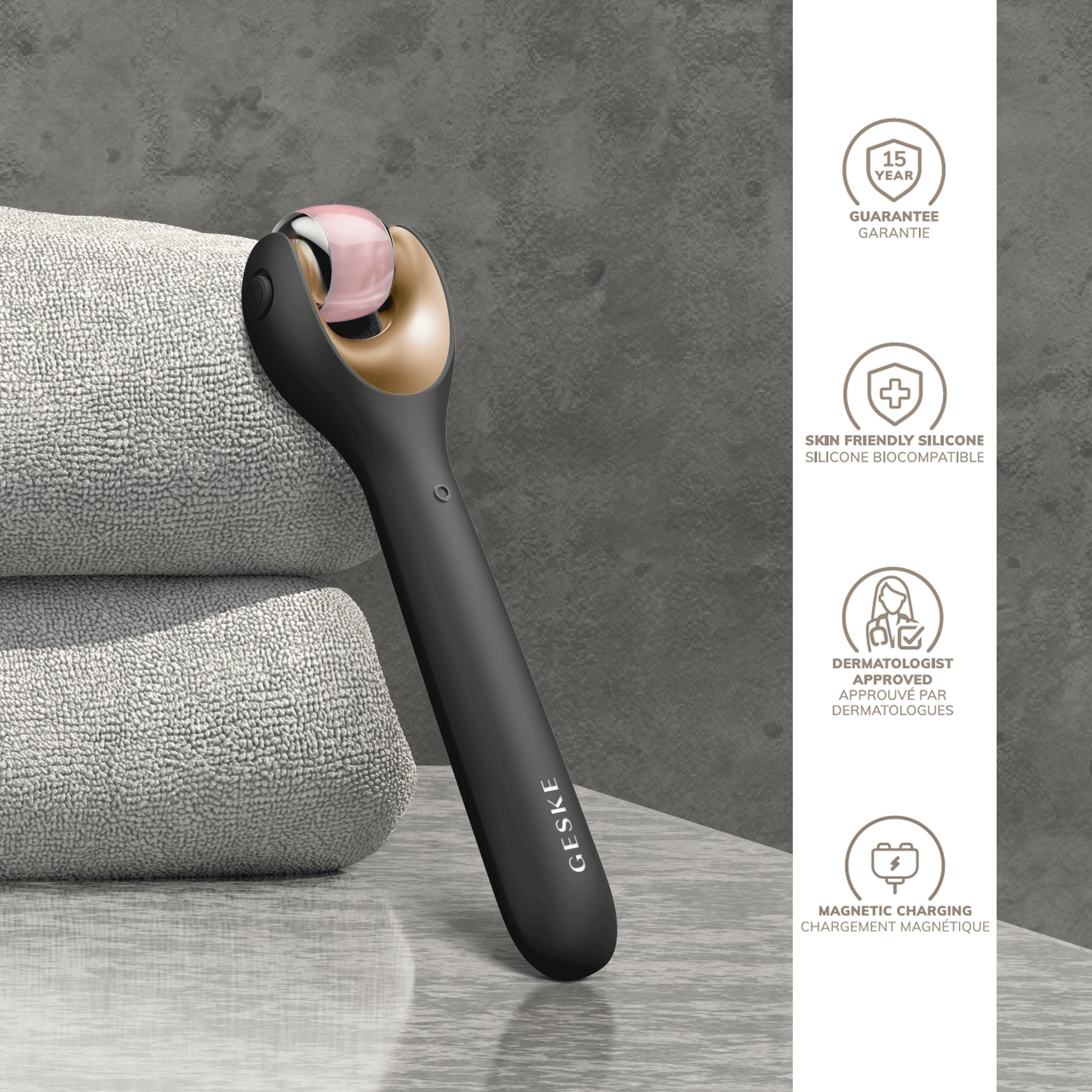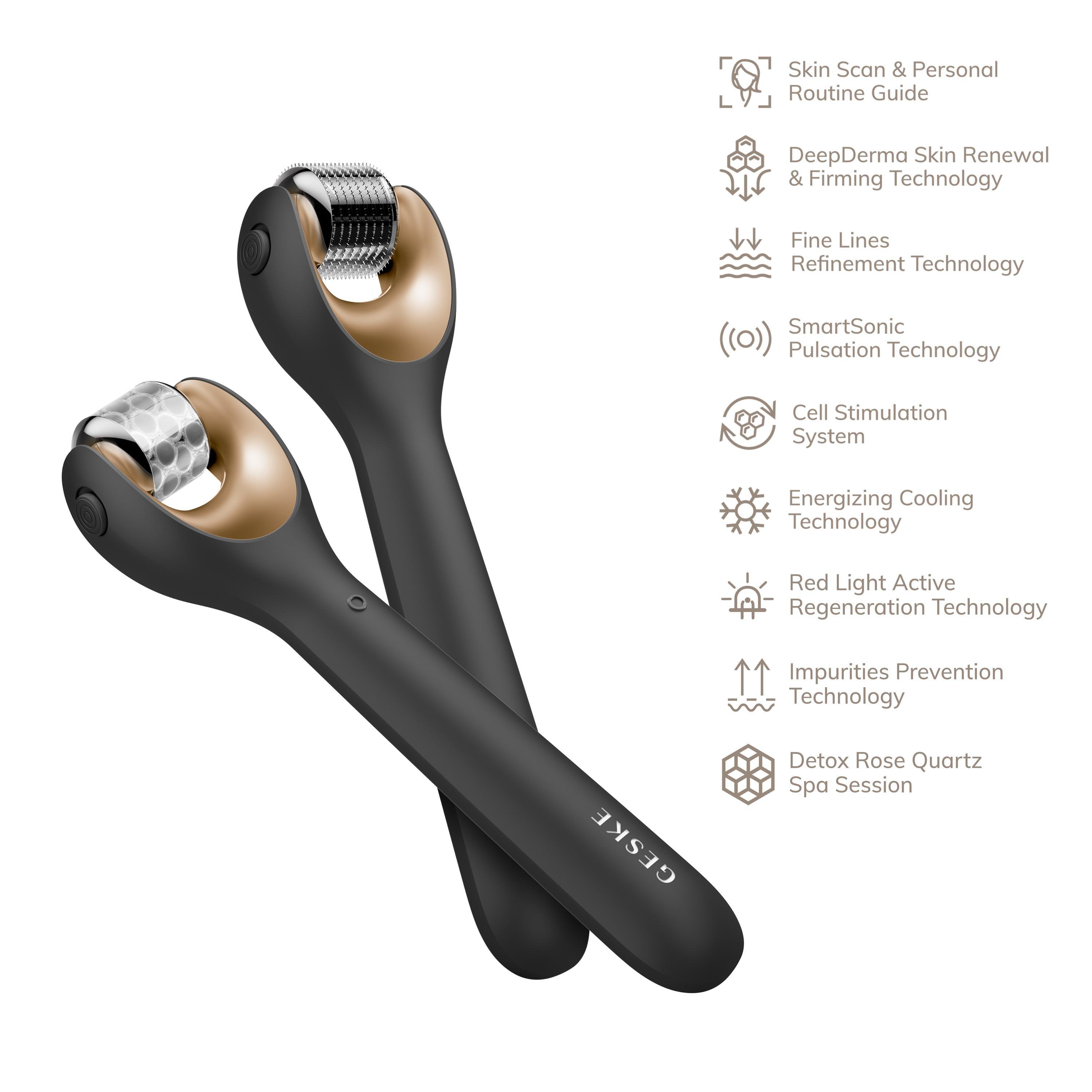 Stimulate your skin with the GESKE SmartAppGuided MicroNeedle Face Roller 9 in 1. This innovative beauty device comes with a MicroNeedle, a Cooling and a Rose Quartz head.