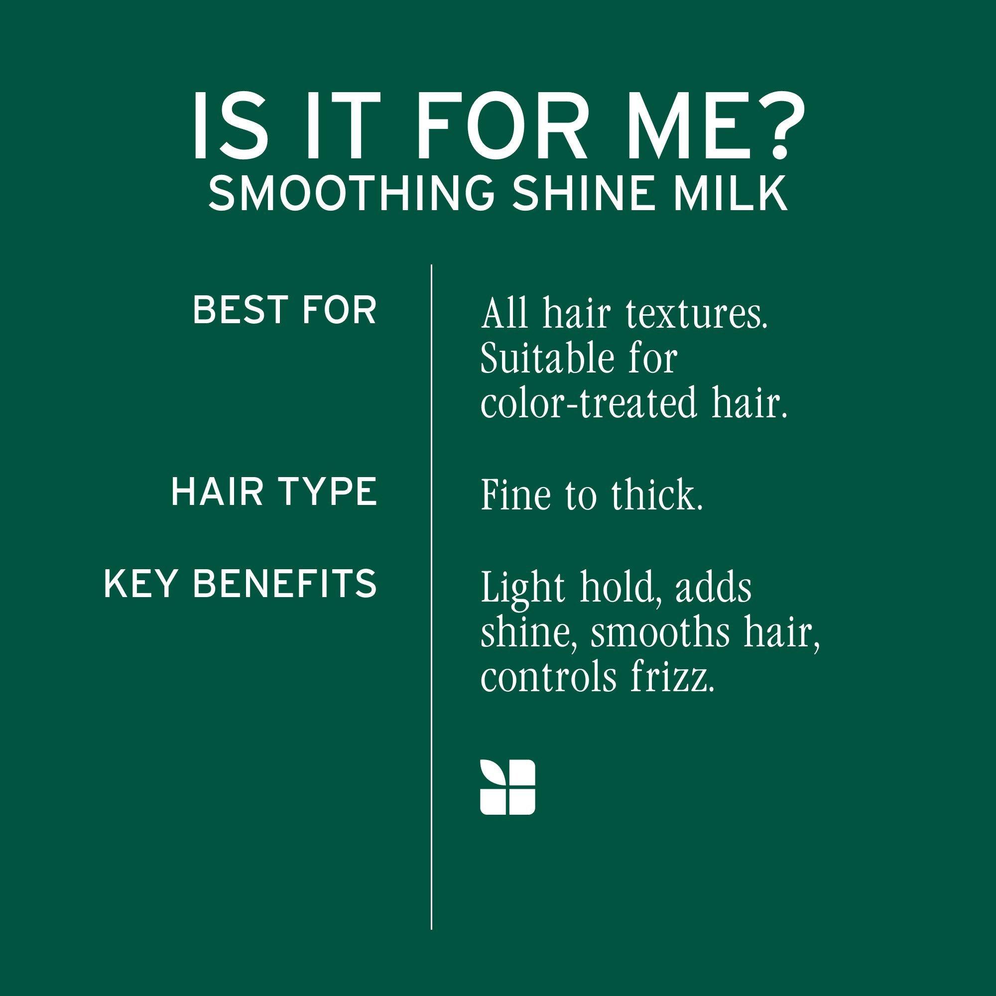 Get silky smooth hair! This lightweight mist from Biolage adds shine, controls frizz, and prevents flyaways for a glossy finish without weighing hair down. With 15x smoother hair and 81% less frizz*, your hair will be irresistibly sleek and radiant. *Smoothing Shine Milk vs. non-conditioning shampoo