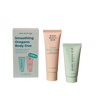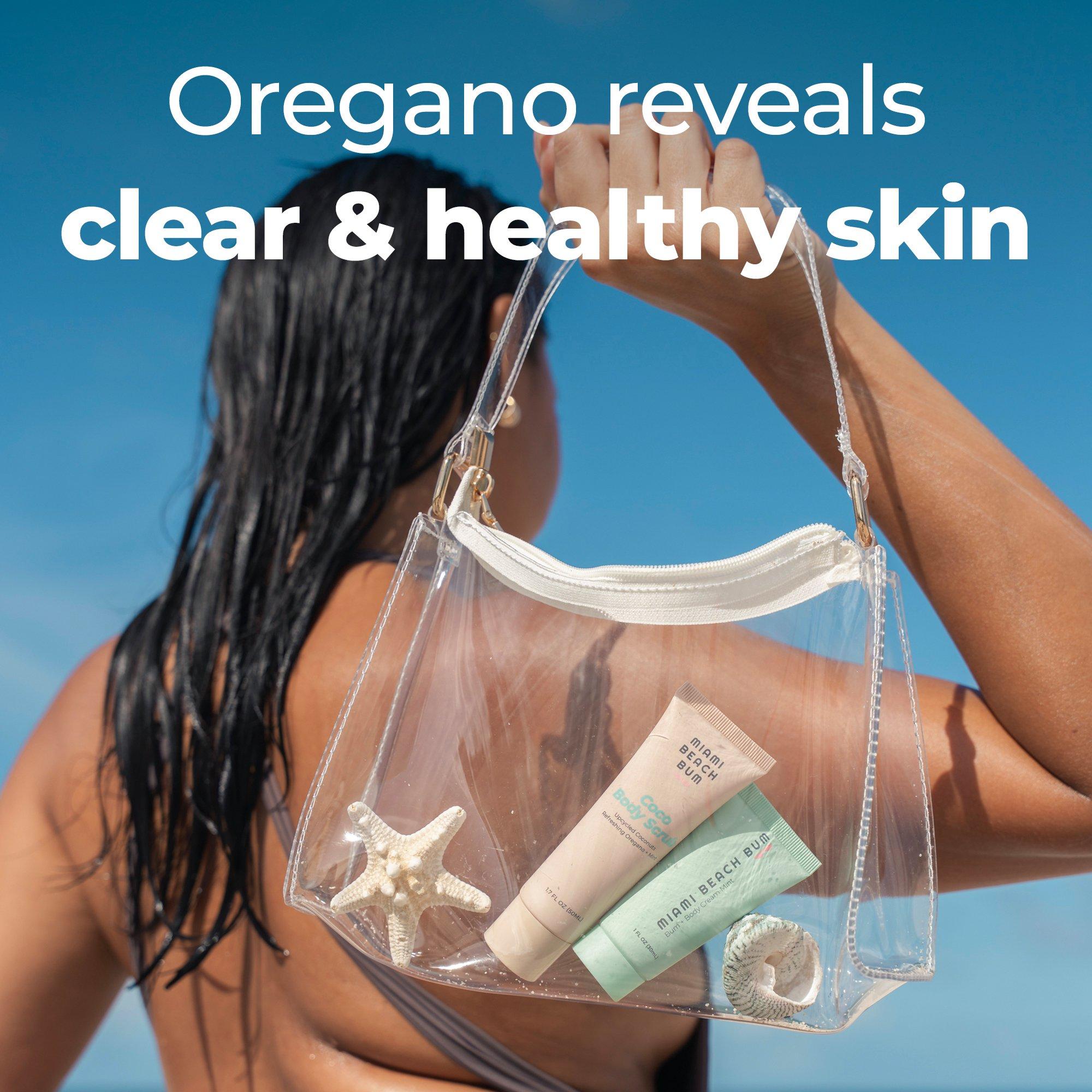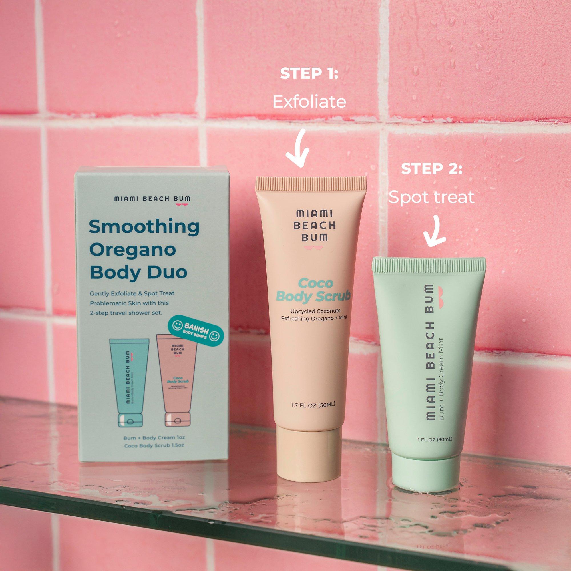 Miami Beach Bum, Smoothing Oregano Body Duo—Discover the 2-step routine for clearer skin. Step 1: gently exfoliate away dead skin cells & Step 2: spot treat stubborn bumps, body acne, and rough texture with this travel-friendly mini set.