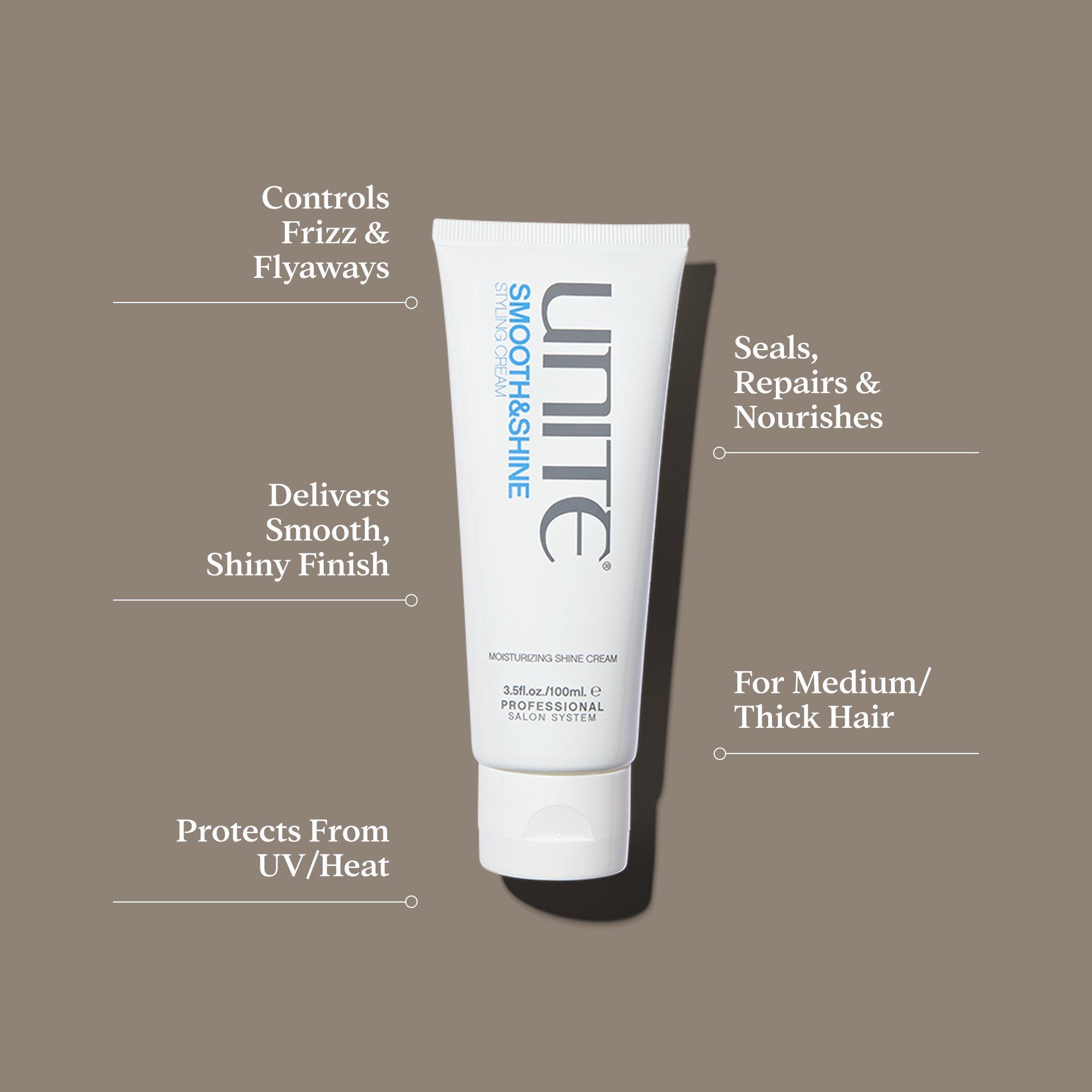 UNITE Hair's SMOOTH&SHINE Styling Cream applies to damp or dry hair to quickly smooth frizz, soften, add shine, and protect medium/thick hair types.