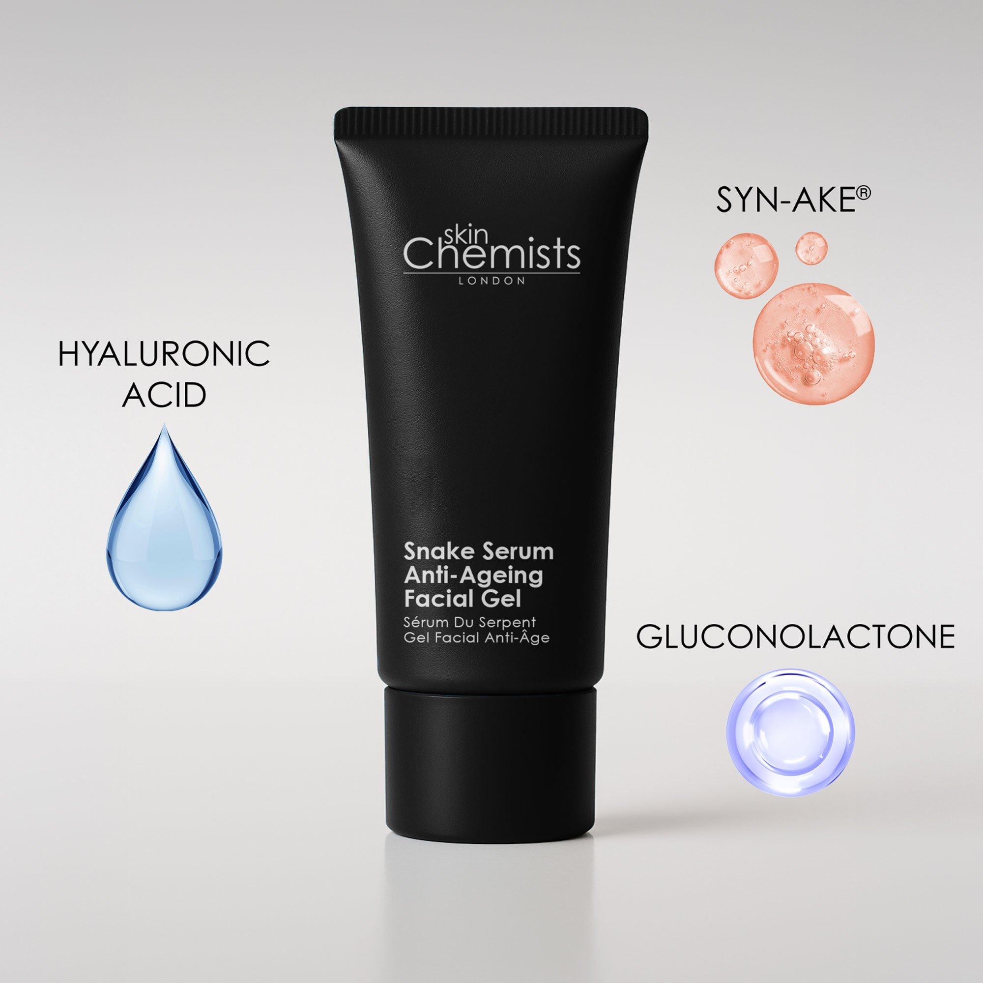 Discover skinChemists Revitalizing Snake Serum: your ultimate anti-aging solution. This vegan, cruelty-free gel, enriched with peptides and Hyaluronic Acid, deeply hydrates and reduces the look of fine lines and wrinkles. Enjoy firmer, radiant skin. Apply 2-3 drops morning and night.