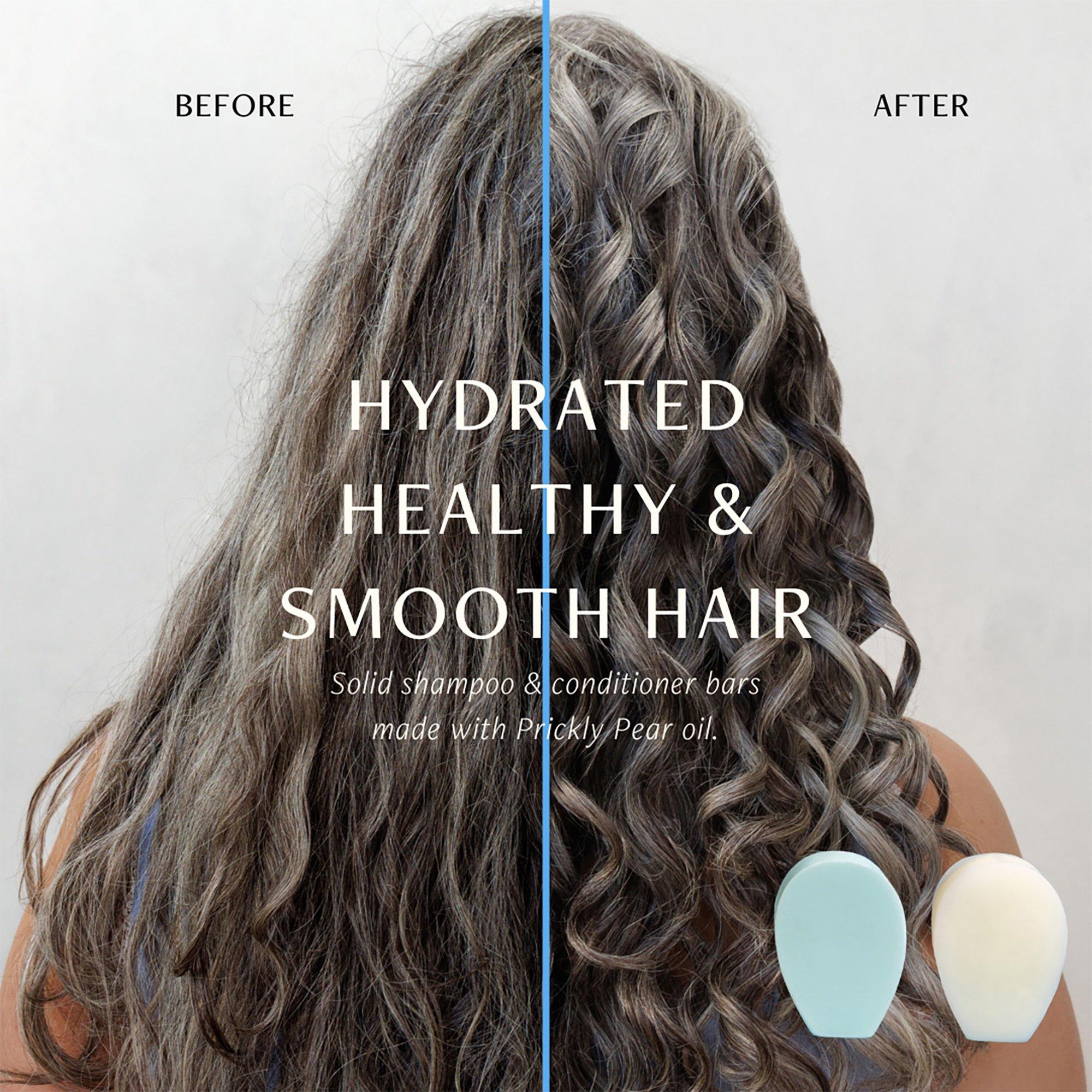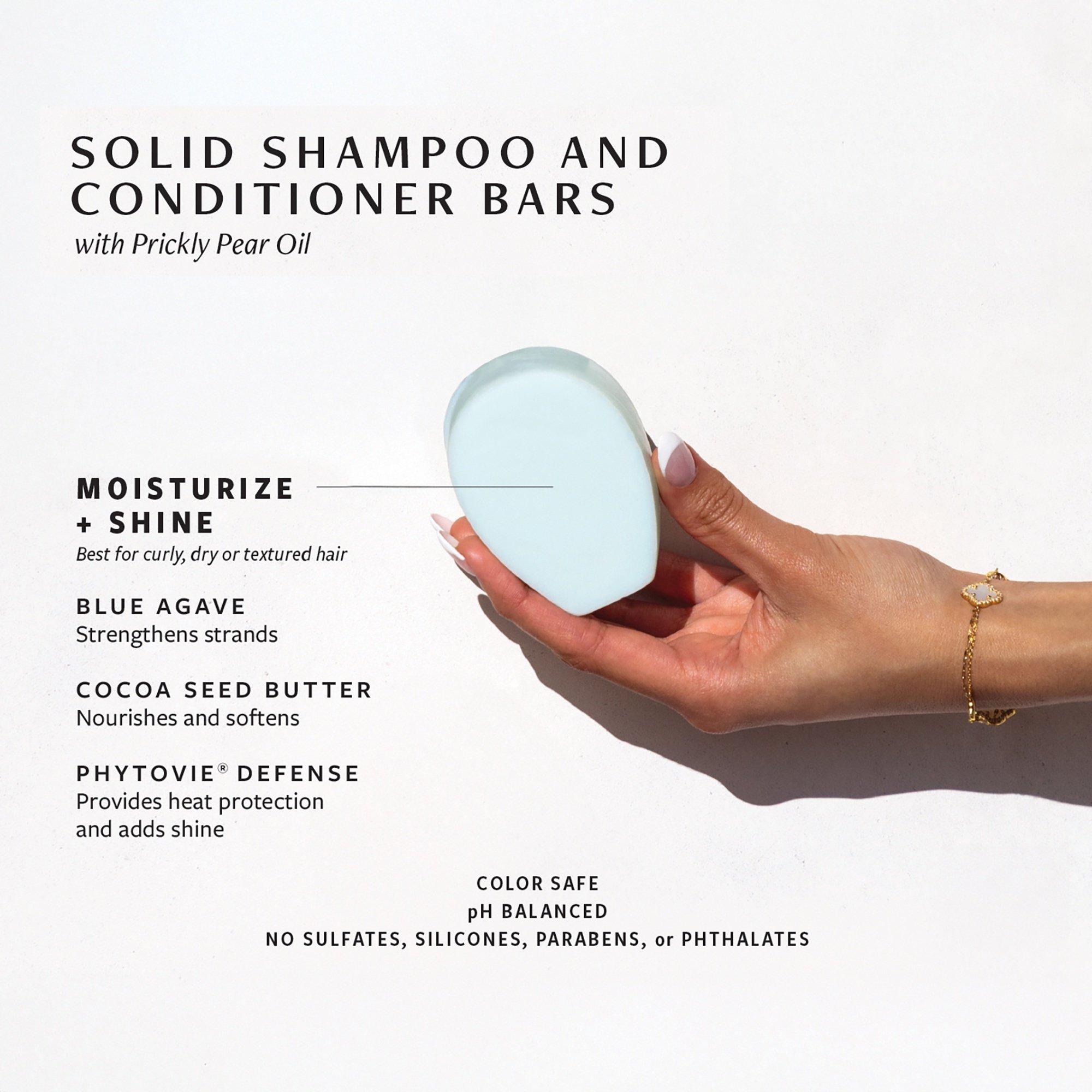 Two prickly pear shampoo bars for different hair needs: Moisturize + Shine soothes and defines textured hair with Blue Agave Extract, while Balance + Repair purifies oily hair with Hydrolyzed Quinoa Protein. Both deliver clean, nourished, and healthy-looking hair.
