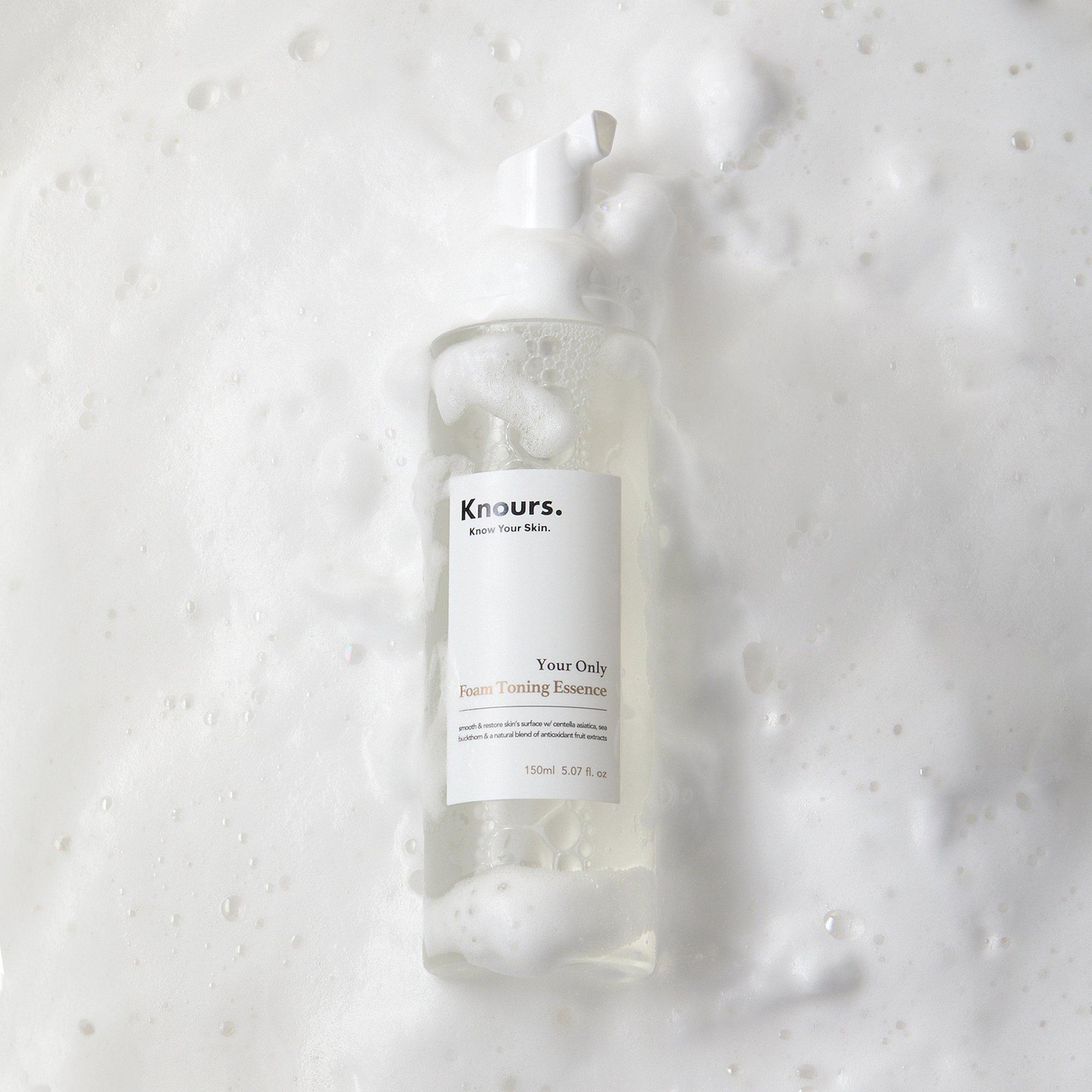 Knours. Soothing Essence Foam Toner gently exfoliates, tones, and minimizes the look of pores. It features centella asiatica, sea buckthorn, and natural fruit extracts that condition and leave skin smooth, ready for subsequent skincare steps.