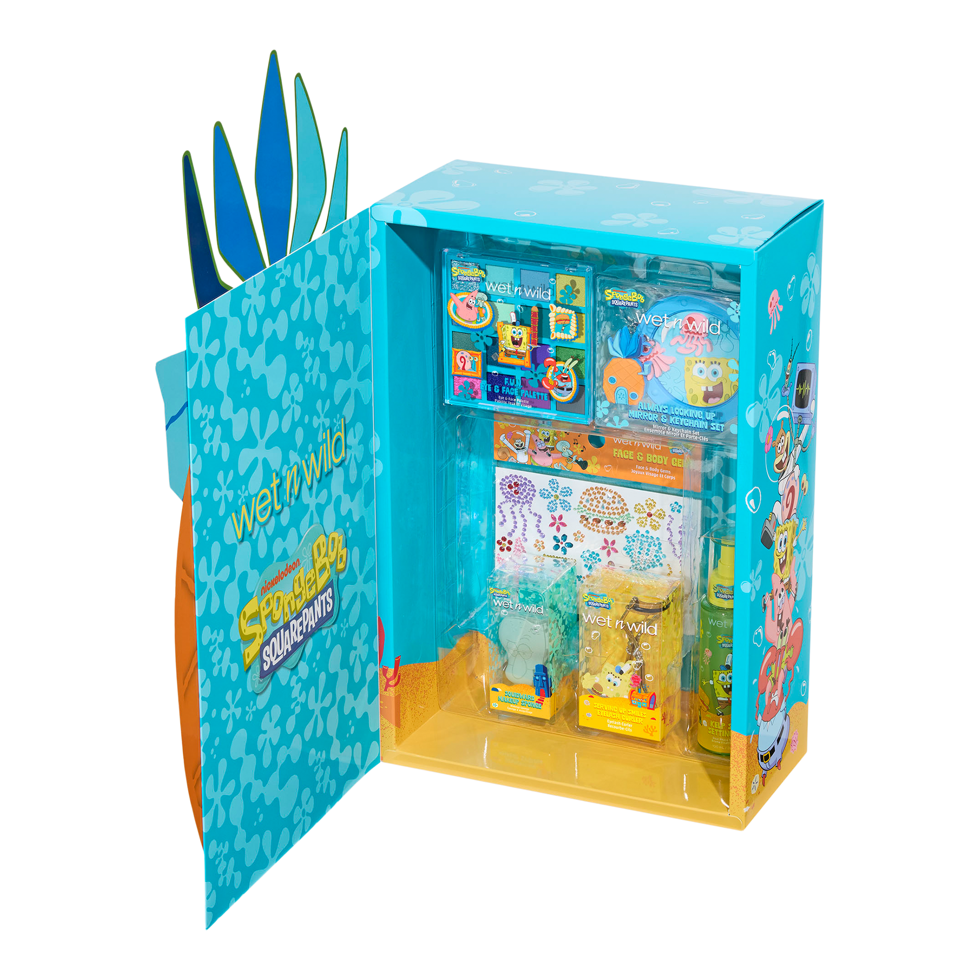 Make every day the best day ever with the limited edition SpongeBob PR Box! Transform your makeup routine with new formulas and accessories. Designed after SpongeBob's pineapple home, this collection set houses 12 exciting eye, face, lip and accessories products.
