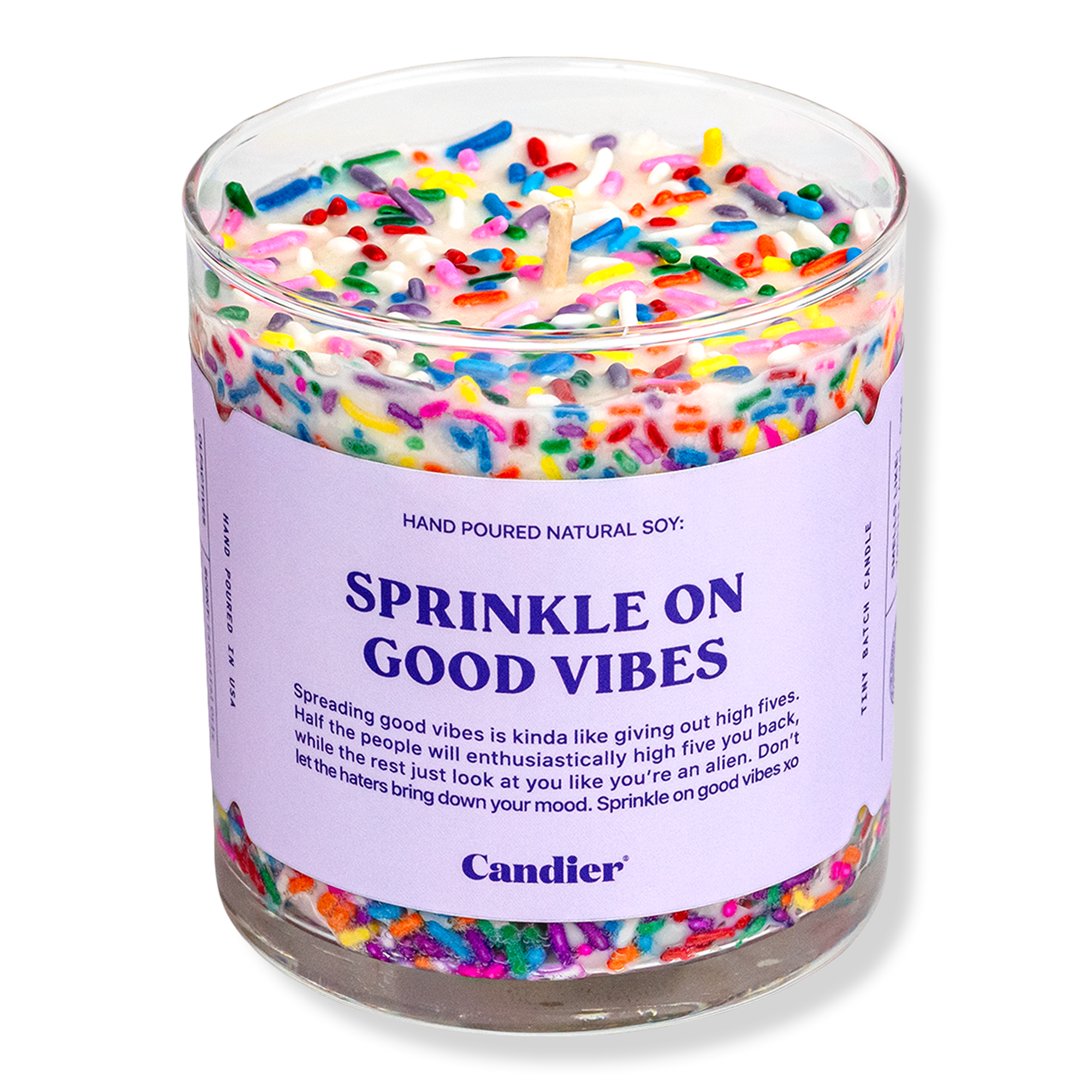 Candier Sprinkle Good Vibes Candle. Spreading good vibes is kinda like giving out high fives. Half the people will enthusiastically high five you back, while the rest just look at you like you're an alien. Don't let the haters bring down your mood. Sprinkle on good vibes. xo