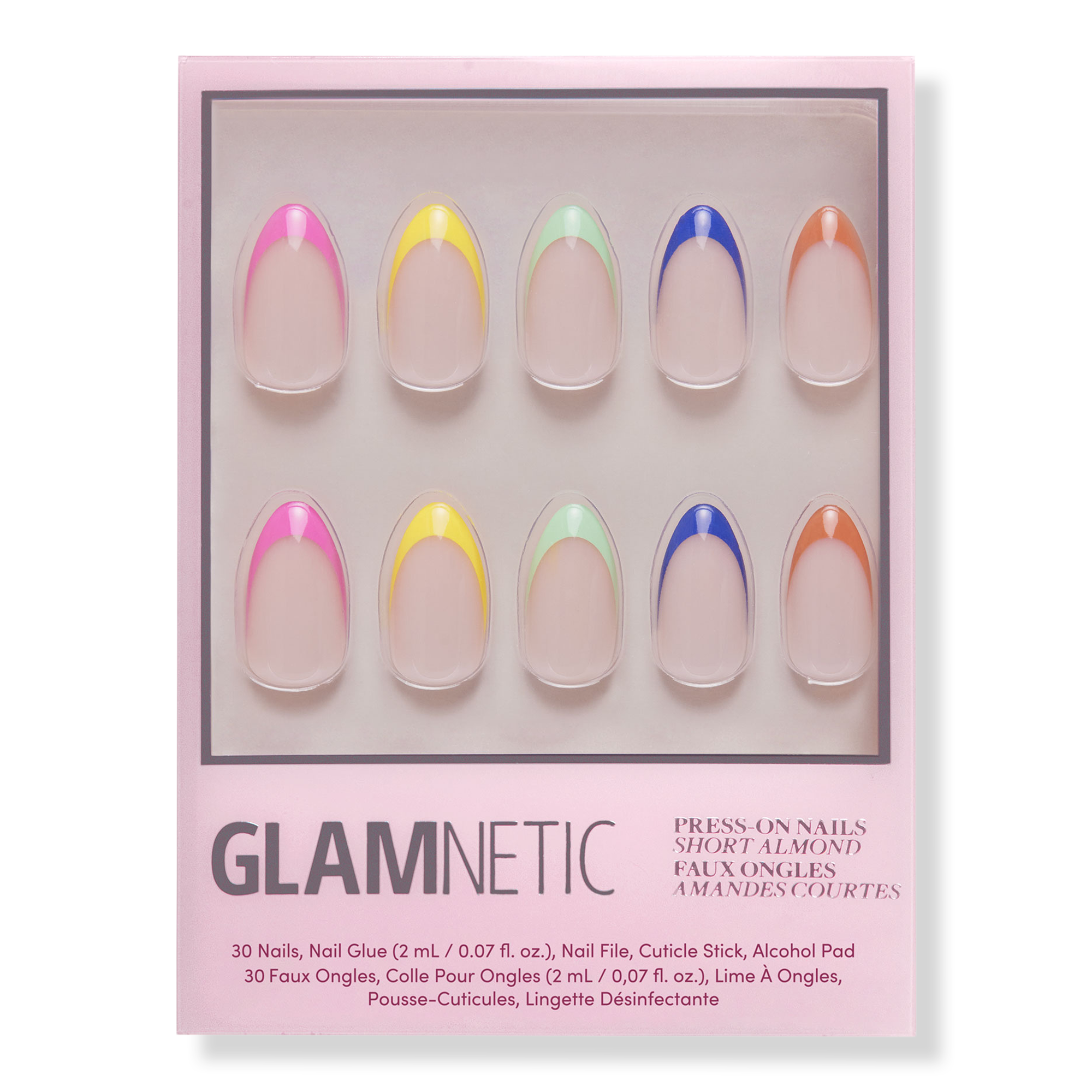 Glamnetic's Press-On Nails are meant to last up to 2 weeks with each set crafted from high-quality materials to prevent bending/splitting. The Sprinkles Nail Set feature a french tip with pops of bright colors to match your happiest of vibe in short, almond-shape.