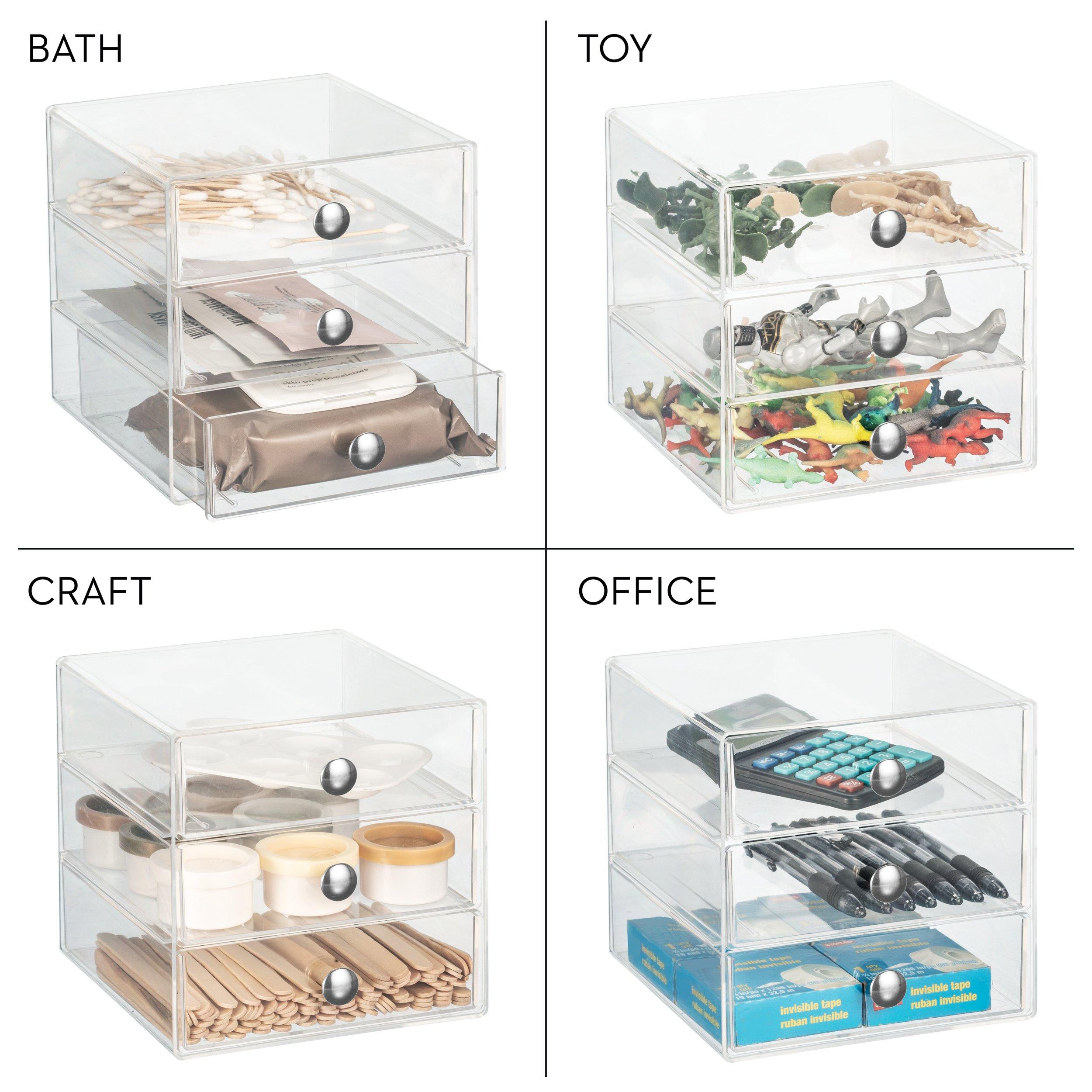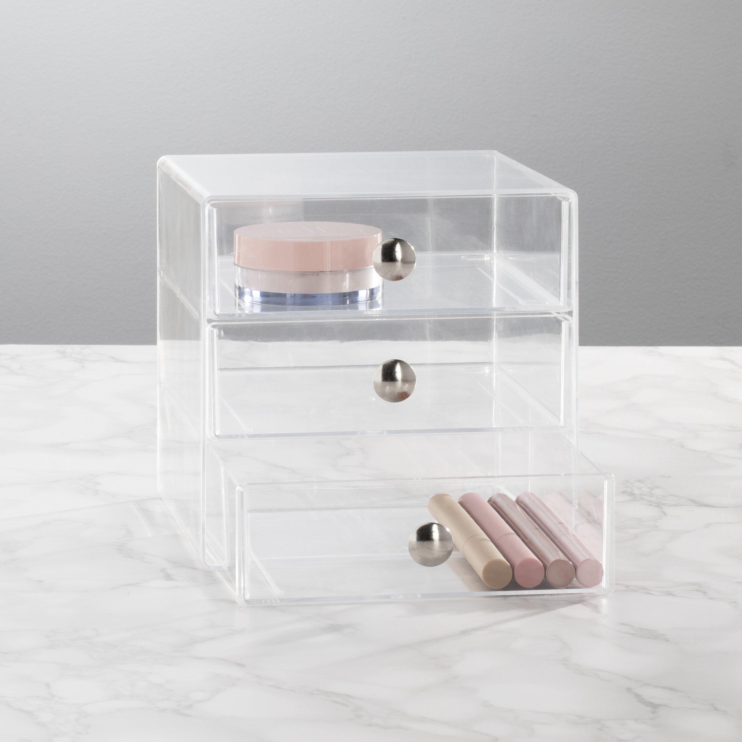 Enjoy a customizable cosmetic layout with the Stackable 3-Drawer Makeup Organizer. Three pull-out drawers with delicate chrome knobs open to a spacious interior to provide a space-saving way to corral makeup brushes, jewelry, and more.