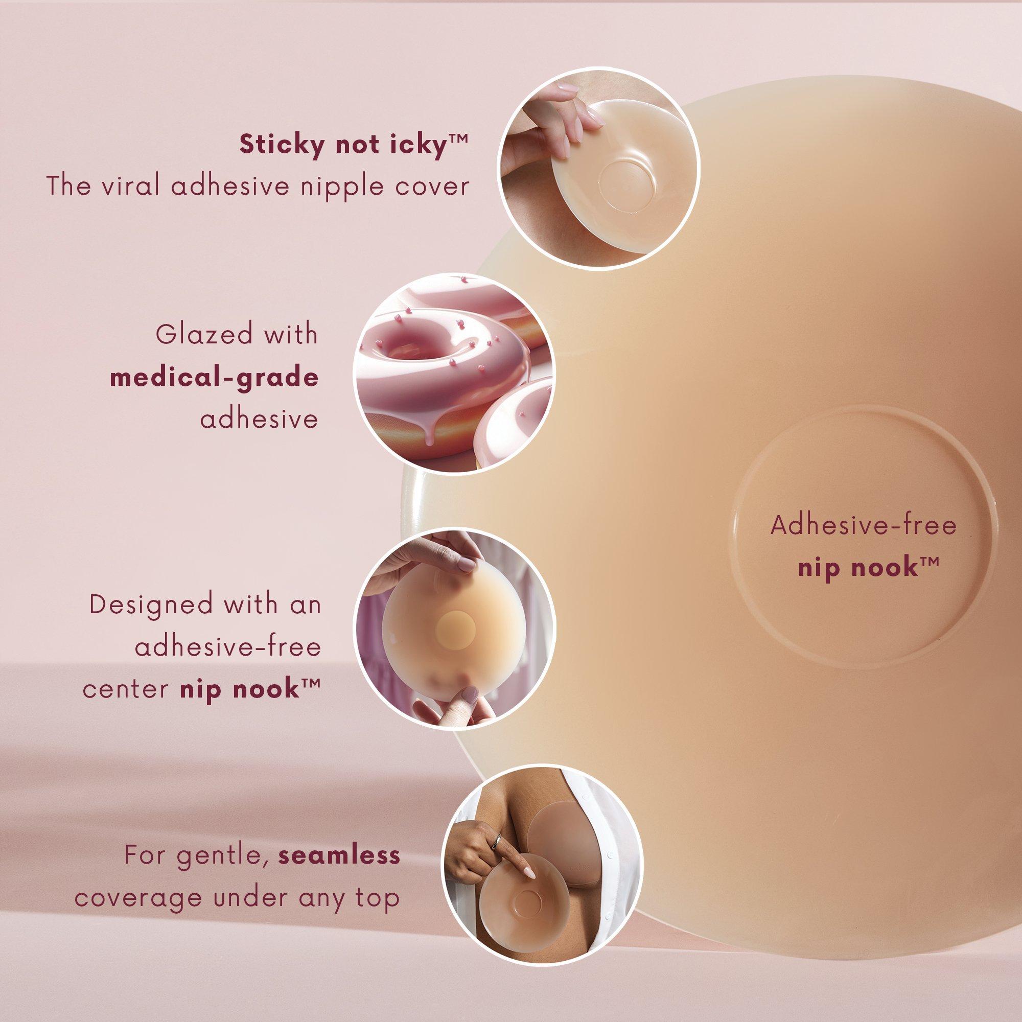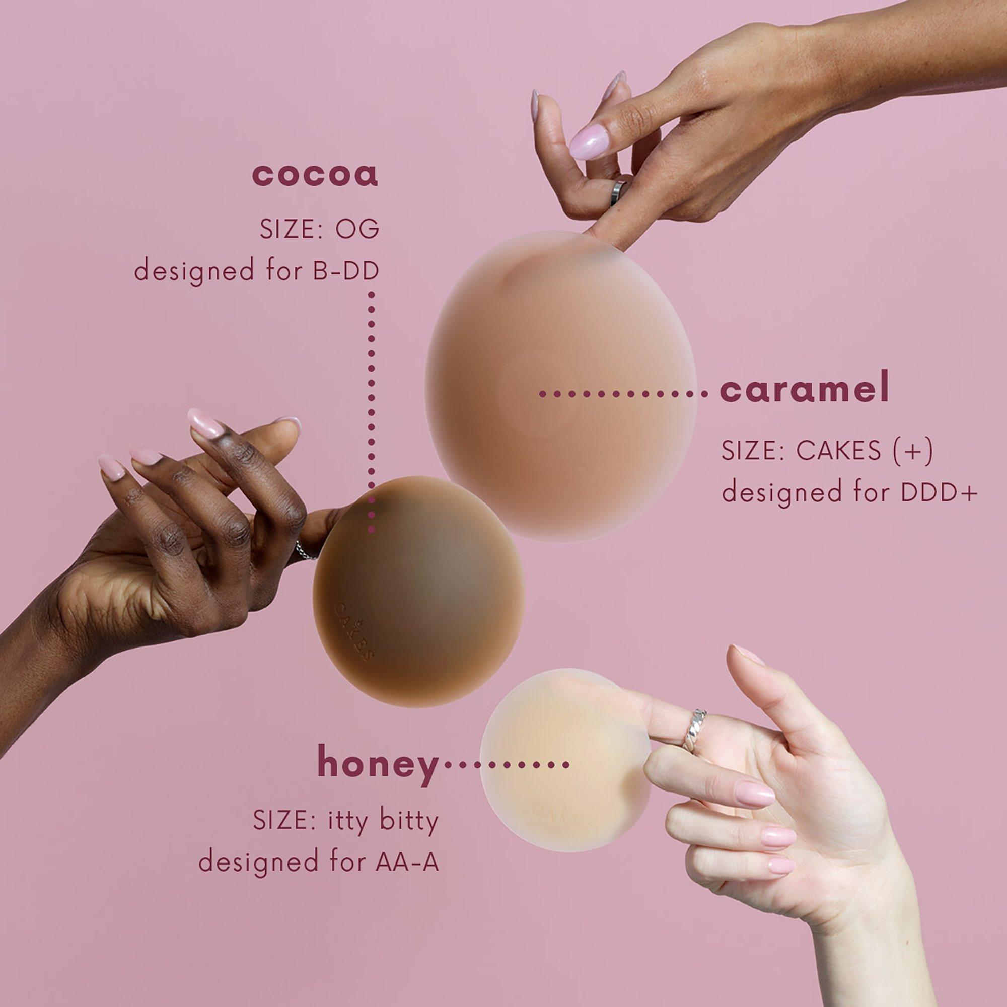 The viral sticky CAKES circles by CAKES Body are comfortable, seamless, adhesive nipple covers that can be worn with every backless, strapless, low cut outfit.