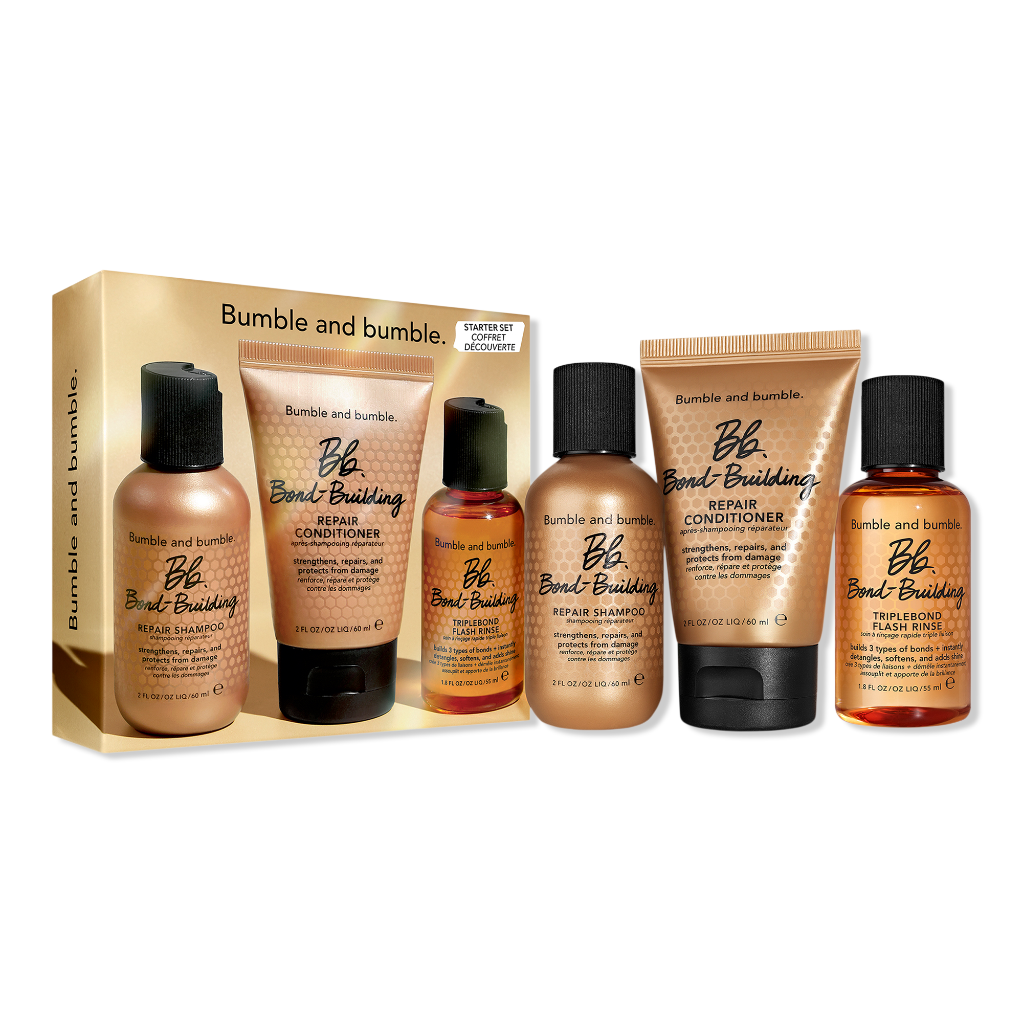 Bumble and bumble's Bond-Building Repair Shampoo + Conditioner build bonds to help repair damaged hair, prevent breakage, and smoothe the cuticle for softness + shine. Bond-Building TripleBond Flash Rinse instantly builds the 3 essential bond types to help fortify + adds 2x shine vs. unwashed hair.