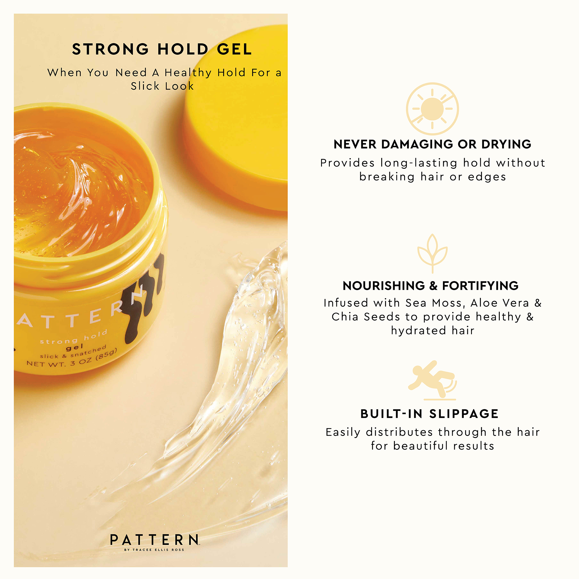 PATTERN's flexible Strong Hold Gel provides long-lasting hold without breakage. Nourishing and fortifying, the healthy-hold gel texture has a built-in slippage to easily distribute through the hair - ideal for a slick look and styles that need extra support.