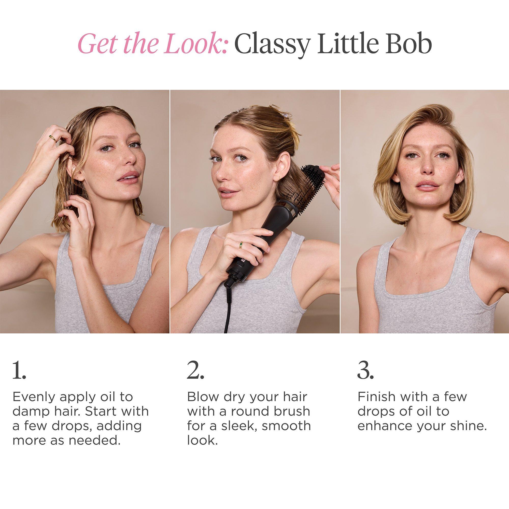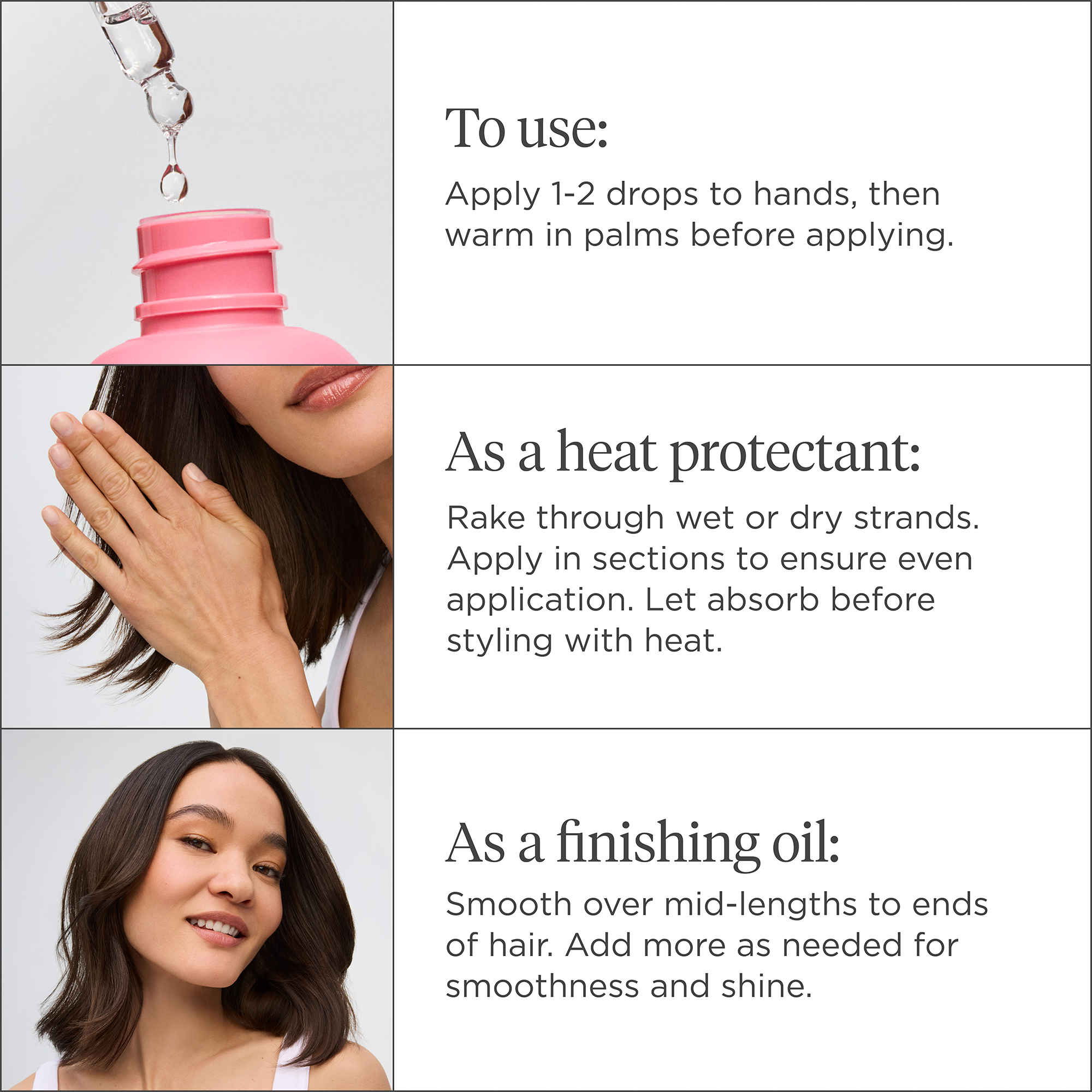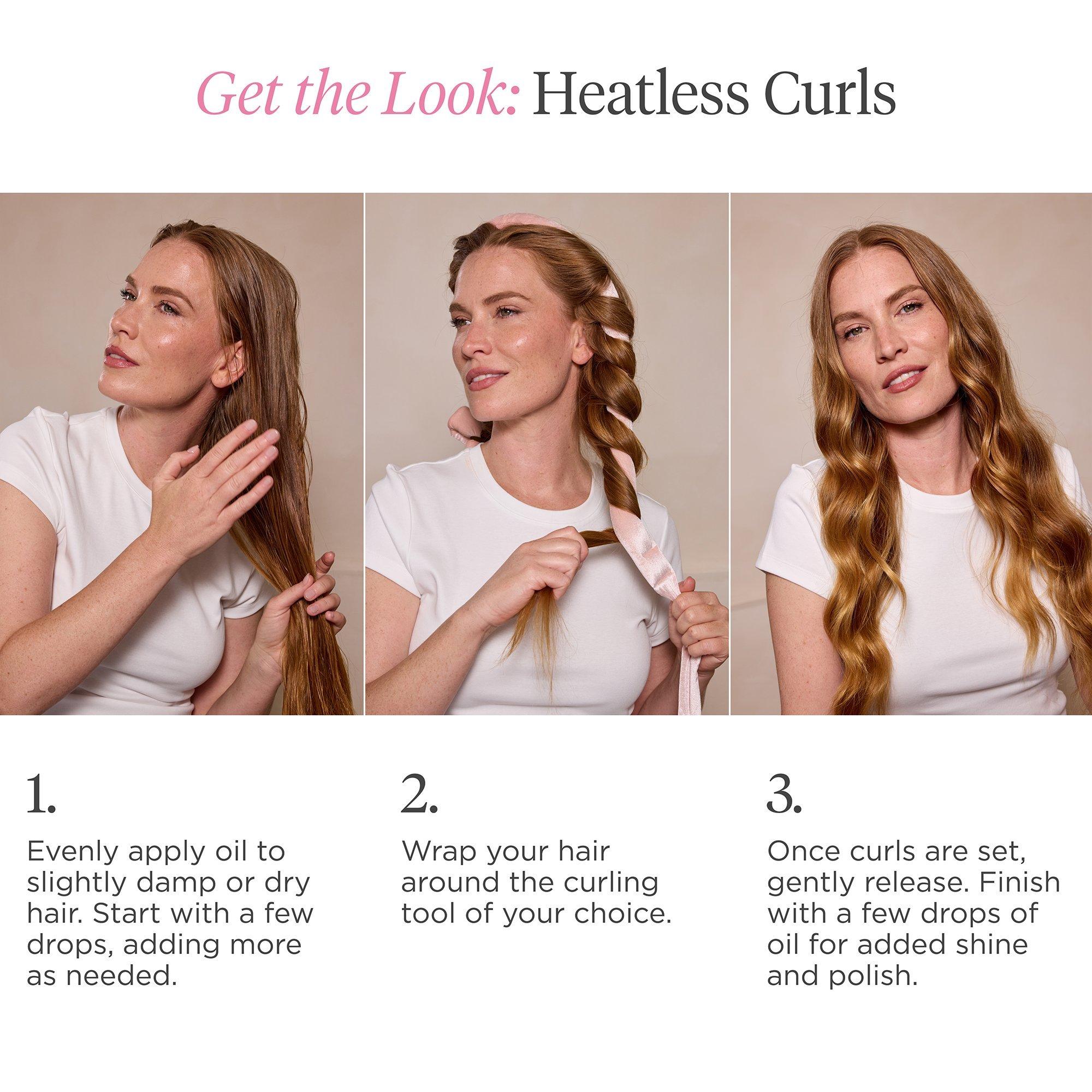 • As a heat protectant: Apply 1-2 drops to hands, then warm in palms before smoothing or raking through wet or dry strands. Apply in sections to ensure even application. Allow to absorb before heat styling hair.